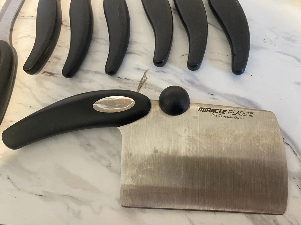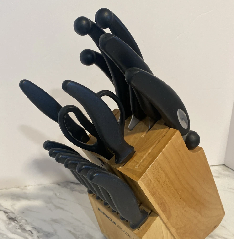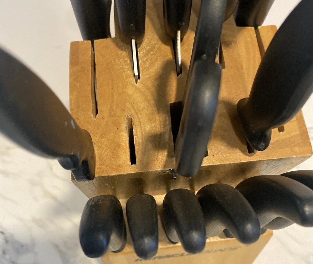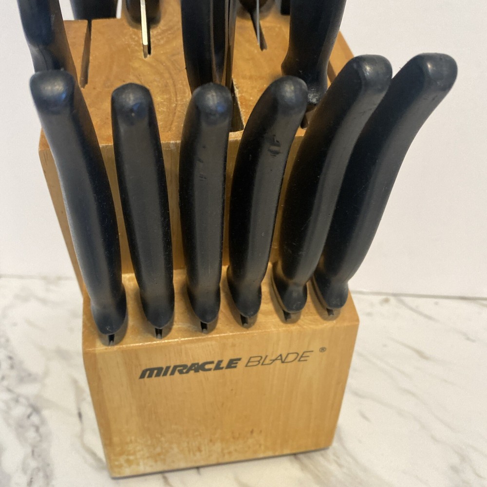 Miracle Blade 14 Piece Knife Set w/ Wood Holder- Missing One Knife READ Desc Pre-Owned in very good condition. This set includes: 13 STAINLESS STEEL Miracle Blade Knives-Assorted sizes (See photos) 1 pair of black/stainless scissors(NOT Miracle Blade) 1 - Miracle Blade Wood Knife Block NOTE: There is one knife missing. Some minor blemishes shown in photos. Please review all photos for best representation Thank you for looking and supporting my small business!