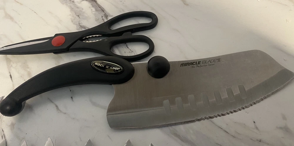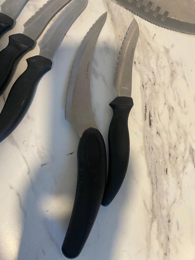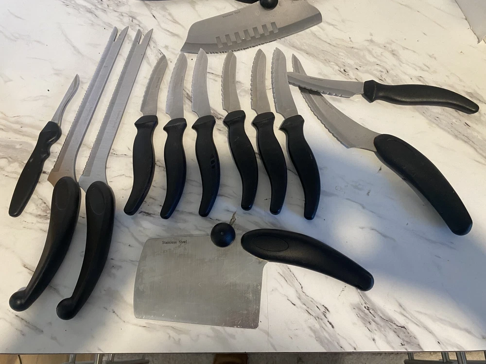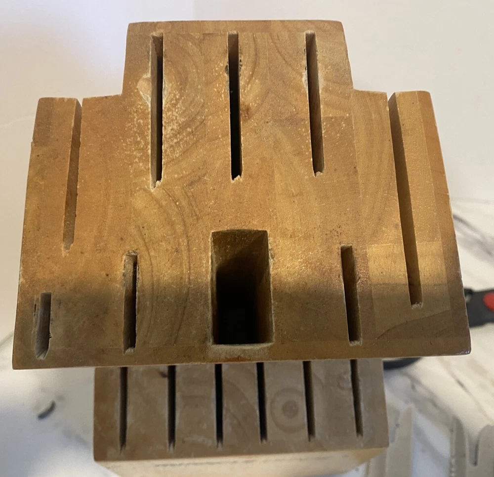 Miracle Blade 14 Piece Knife Set w/ Wood Holder- Missing One Knife READ Desc Pre-Owned in very good condition. This set includes: 13 STAINLESS STEEL Miracle Blade Knives-Assorted sizes (See photos) 1 pair of black/stainless scissors(NOT Miracle Blade) 1 - Miracle Blade Wood Knife Block NOTE: There is one knife missing. Some minor blemishes shown in photos. Please review all photos for best representation Thank you for looking and supporting my small business!