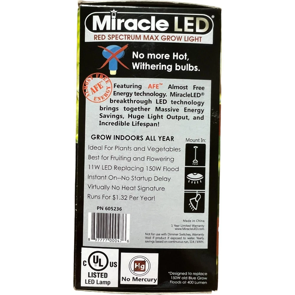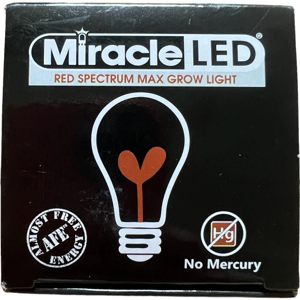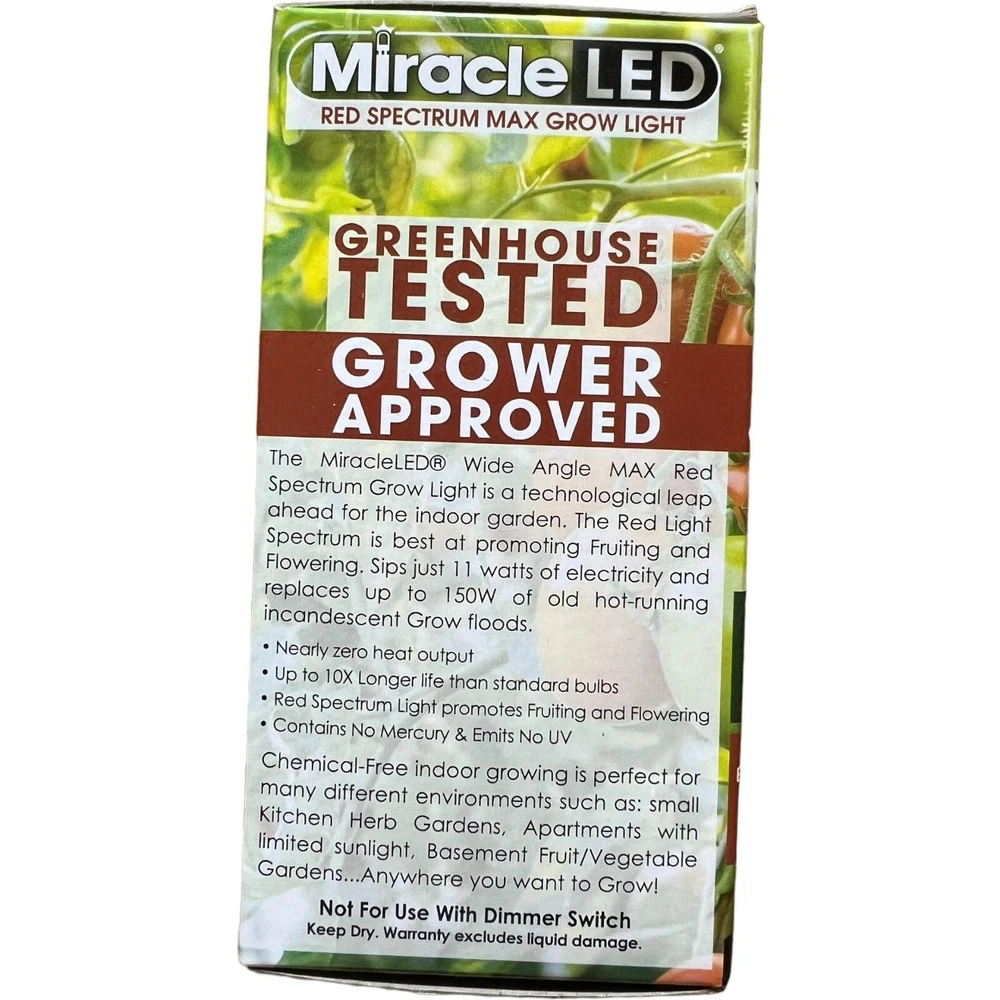 Thee Miracle LED Wide Angl,e Grow Lite: Designed to replace 150W old Blue Grow Floods at 400 lm. Grow Light Technology: Utilizes a red spectrum Max Grow Light that is ideal for promoting plant growth and flowering stages. Energy-Efficient: Replaces a traditional 150W grow light but consumes significantly less energy, saving on electricity costs. Wide Angle Design: The wide-angle beam ensures a broader coverage area for better plant growth. Long-Lasting: Boasts a long lifespan, eliminating the need for frequent bulb replacements. Versatile Use: Suitable for indoor gardening, hydroponics, greenhouses, and other plant-growing applications. Promotes Healthy Growth: Provides the essential red spectrum light plants need to flourish and thrive. Low Heat Emission: Operates with minimal heat output, preventing plant damage and reducing cooling requirements. Eco-Friendly: Contains no harmful chemicals and is eco-friendly, promoting a sustainable approach to gardening. Easy Installation: Fits standard E26/E27 light bulb sockets, making it simple to replace existing grow lights. Experience the benefits of using the Miracle LED Wide Angle Grow Lite to enhance the growth and health of your plants without the high energy consumption of traditional grow lights.