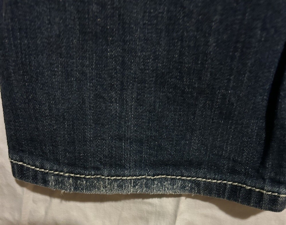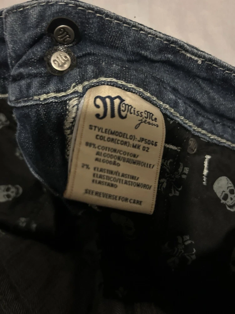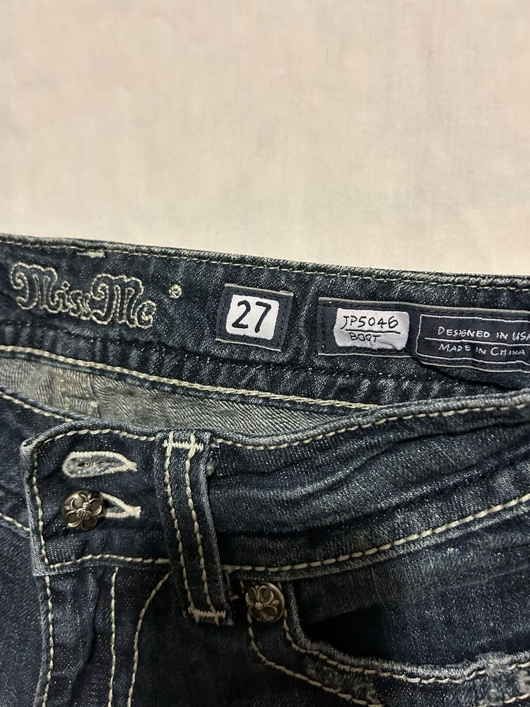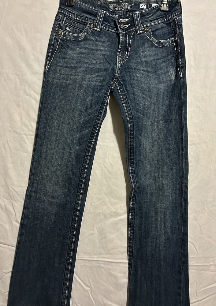 Elevate your casual wardrobe with these Miss Me boot cut jeans. The jeans are made of a denim fabric with a medium wash, featuring a 5-pocket design with a button and embroidered accents. The low-rise silhouette with a bootcut leg style is perfect for a casual occasion, and the zipper closure adds a touch of convenience. The jeans are machine washable and made of elastin and cotton materials, making them comfortable to wear in winter, fall, and spring. The solid blue color with a Y2K and 90s rock theme adds a touch of personality to the outfit. These jeans are perfect for women's size 27 and are regular in size type. Condition is pre owned. Hip to Hip-13.5” Inseam-34” Rise-7.5”