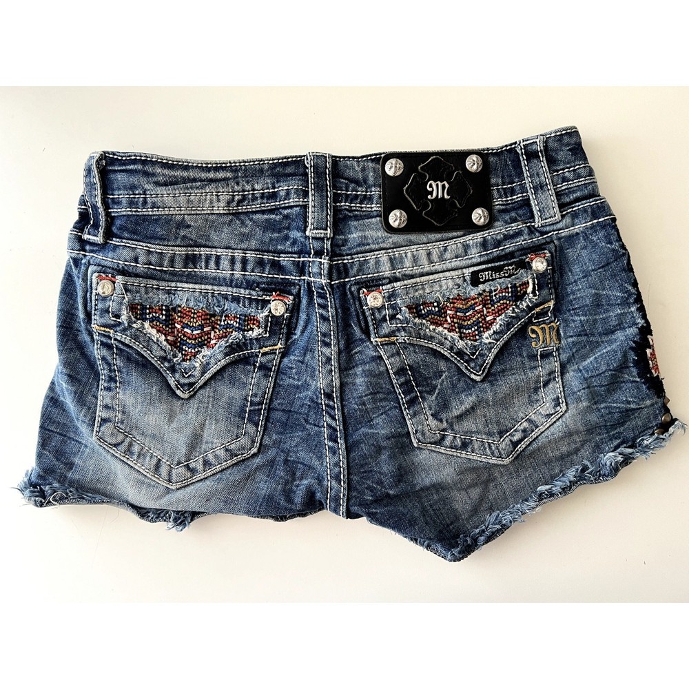Miss Me Embroidered Tribal Studded Fringe Sexy Women's Denim Shorts Size 28