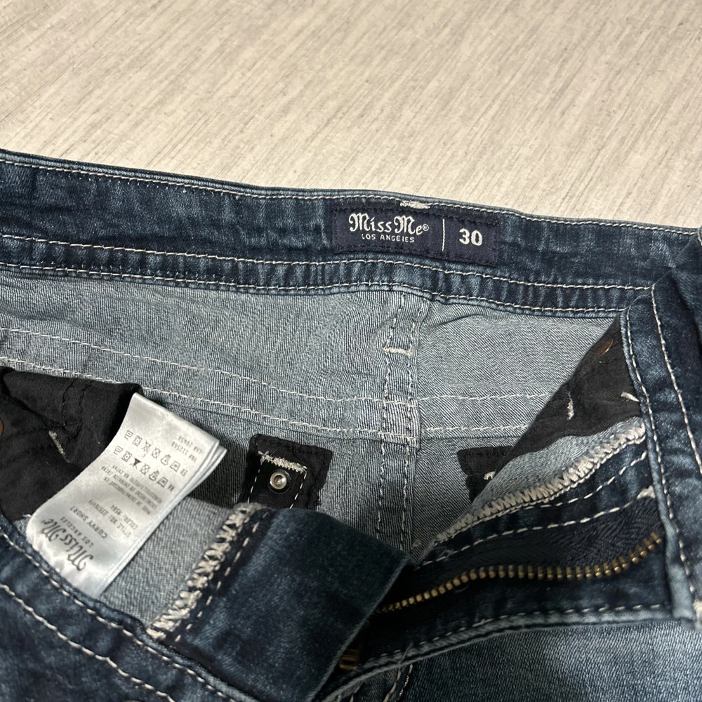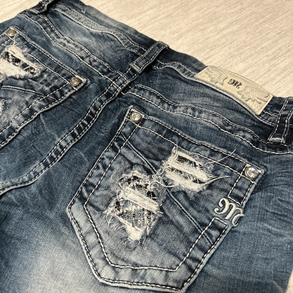 This is a pair of Miss Me mid-rise Bermuda jean shorts in a medium wash with flap pockets, size 31. The denim shorts feature studded accents and a regular fit with a 31-inch waist. Designed for women, these shorts have a 5-inch inseam and a Western-inspired theme, perfect for fans of designer Western wear. Ideal for a casual American Rodeo or Cowboy Cowgirl look, these shorts offer both style and functionality with their pockets and classic denim fabric.