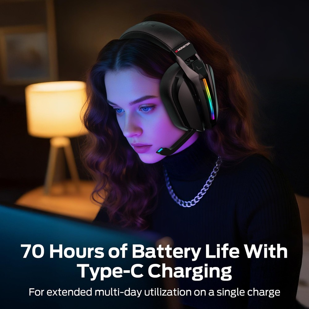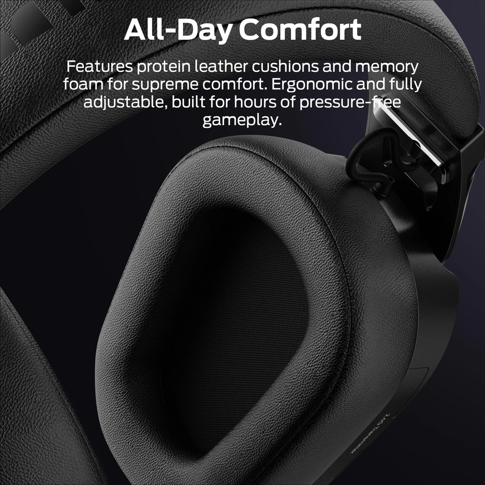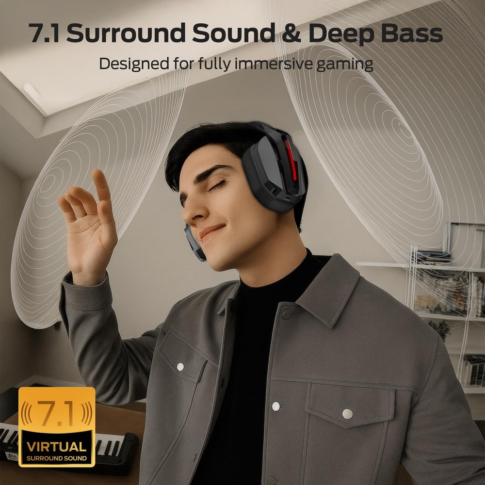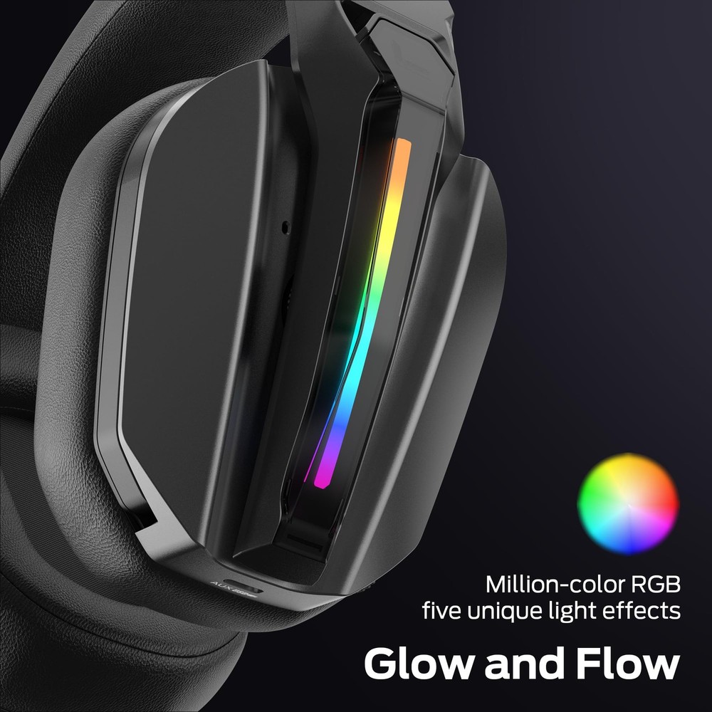 DUAL EQ MODES: This gaming headset wireless features two EQ modes: Game and Music. ① Game Mode (7.1 Virtual Sound): Enjoy immersive surround sound to hear every enemy's footsteps. Capture every subtle detail and game-changing moment. ② Music Mode: Switch to this mode for rich, detailed sound quality, perfect for enjoying your favorite tunes. ULTRA-LOW LATENCY GAMING: Use the 2.4GHz wireless for real-time gaming. With ultra-low latency under 20ms, the headset delivers seamless gameplay and perfect audio-visual sync. You'll experience perfect harmony between what you see on screen and what you hear, making every in-game moment more immersive and responsive. NOISE-FREE CALLS: Our gaming headset delivers uninterrupted immersion with Active Noise Cancellation (ANC), blocking out external noise so you can focus entirely on the game. When it's time to chat, a hidden microphone uses AI to filter background noise, ensuring crystal-clear communication. When the call ends,the mic smoothly retracts into the earcup, keeping the design sleek and minimal without sacrificing audio quality. MULTIPLE CONNECTION MODES: This Gaming Headset offers 3 connection options: 2.4GHz wireless, Bluetooth 6.0, and 3.5mm AUX wired. It works seamlessly with consoles, PCs, laptops, tablets, and mobiles, thanks to its versatile compatibility. COMFY ALL-DAY GAMING: This PC headset delivers up to 70 hours of gameplay on a single charge. Even with RGB lighting on, you’ll get 40 hours of nonstop use. Plus, it fully recharges in just 3 hours, ensuring you're always ready for extended gaming sessions without long waits. ERGONOMIC EXCELLENCE: The Gaming Headset offers supreme comfort with its soft protein leather earcups and memory foam. Its ergonomic, lightweight design and adjustable headband keep pressure off, perfect for long gaming sessions. When the cool LED lighting effect is enabled, it adds a stylish touch to your gaming experience.
