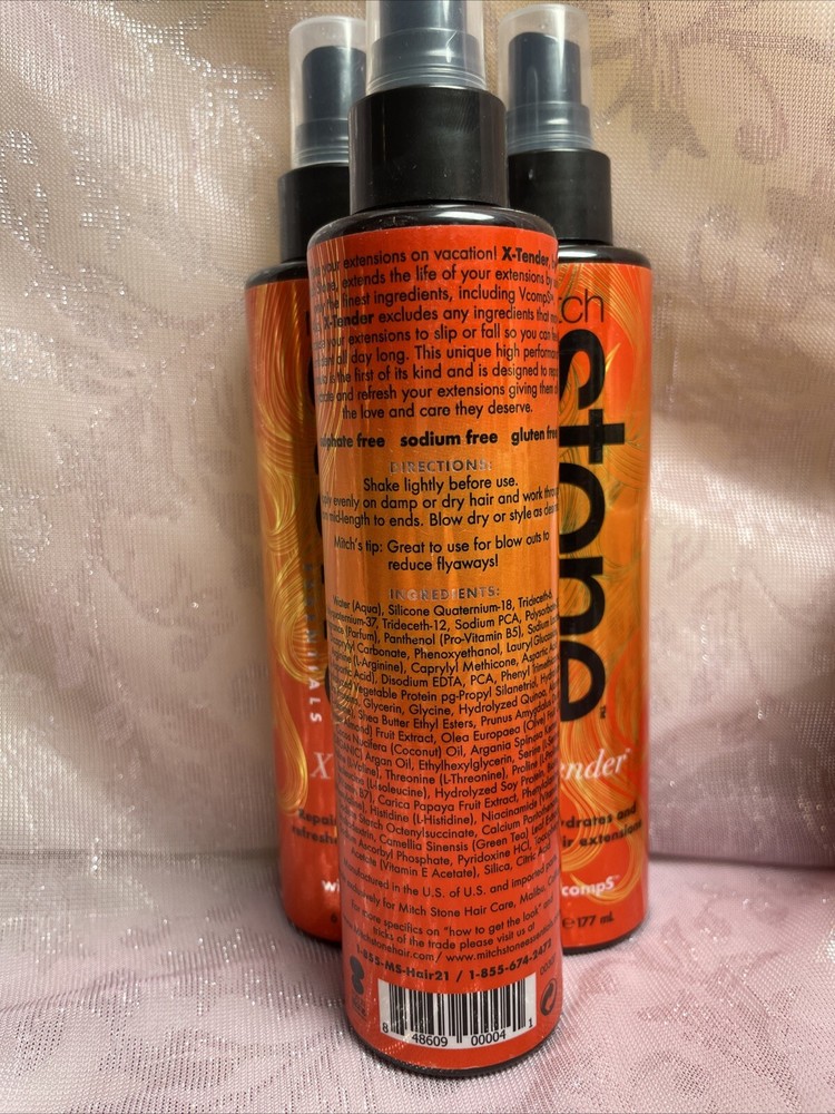 3 NEW bottles of Mitch Stone Essentials X-Tender 6 fl. oz. (177ml) Hair Extension Repair & Hydrate Spray. Please note: This item will be shipped in a box with lots of padding. If you choose priority mail padded flat rate envelope they will be carefully wrapped in a BOX inside the flat rate envelope.