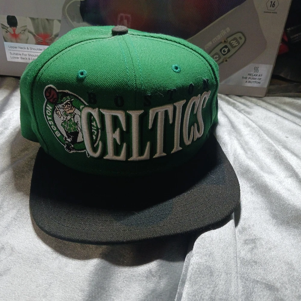 This Mitchell & Ness NBA Boston Celtics Core Basic Snapback Hat features an embroidered team logo at the front and Mitchell & Ness branding at the rear. The hat is green and black with a structured fit and a high crown. It is a one size fits all cap made of 100% polyester, with a normal flat bill and green eyelets. The design includes solid front and mid panels with eyelets, and the underbill color is gray. This officially licensed product is perfect for basketball fans.