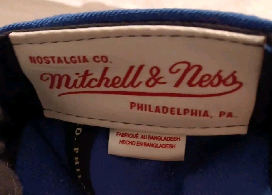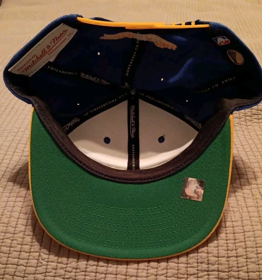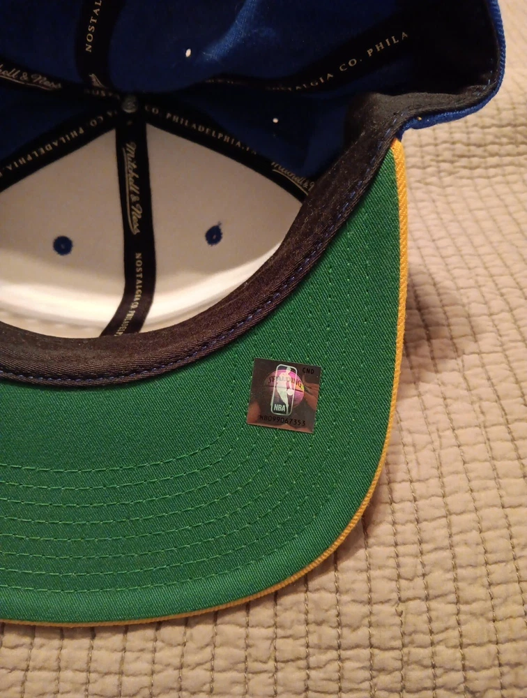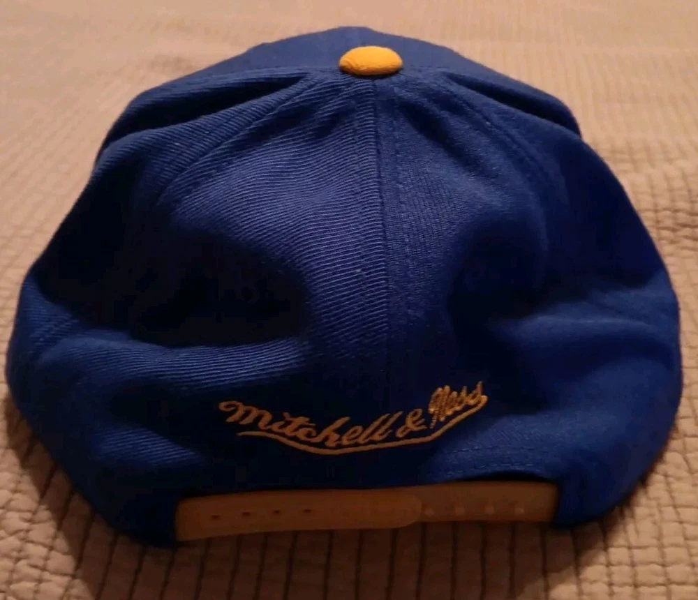New without tags. Blue and gold. Large logo. Adjustable fit. Nostalgia Co Philadelphia, PA Mitchell & Ness. NBA holographic sticker.