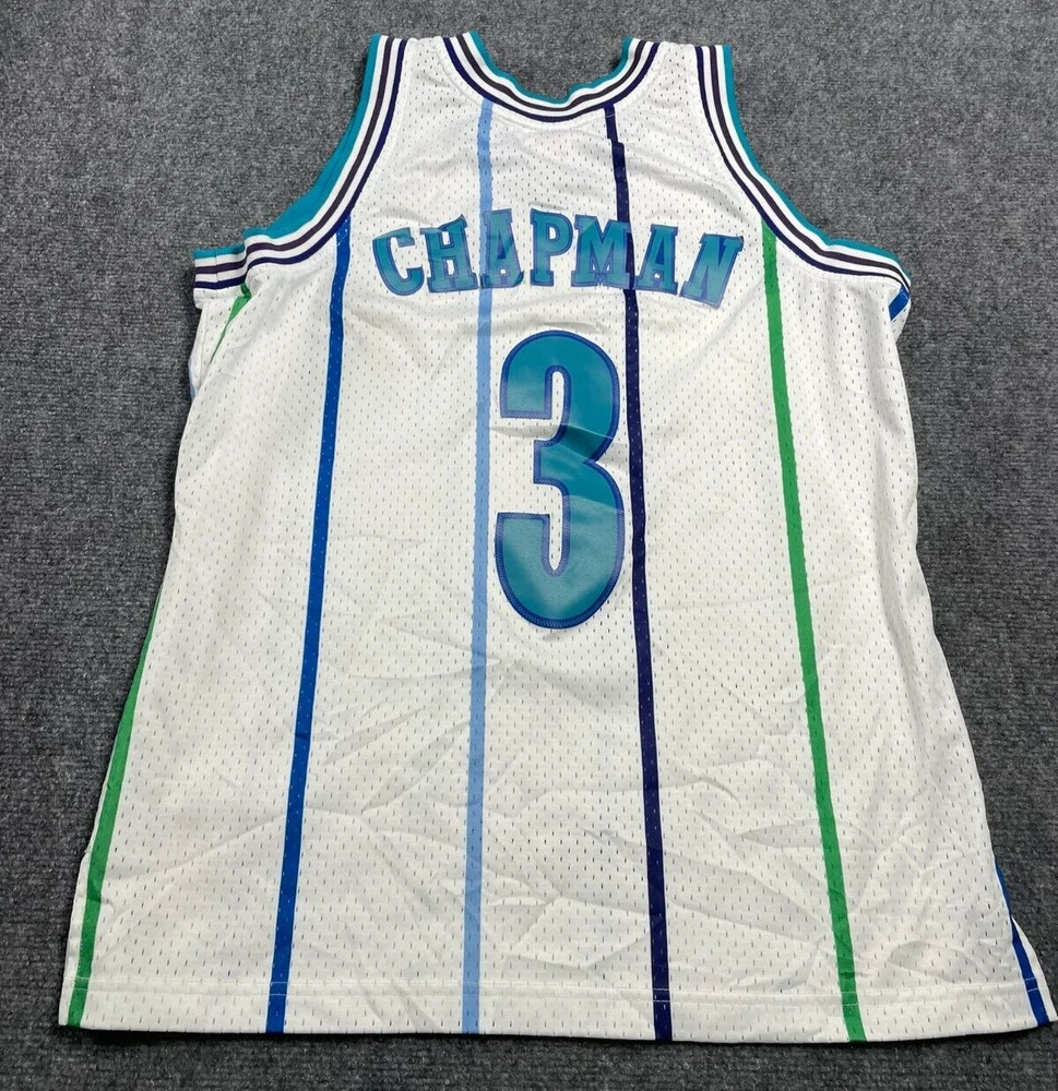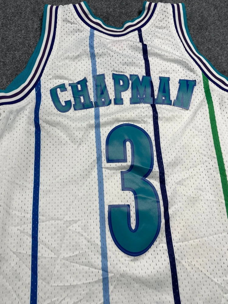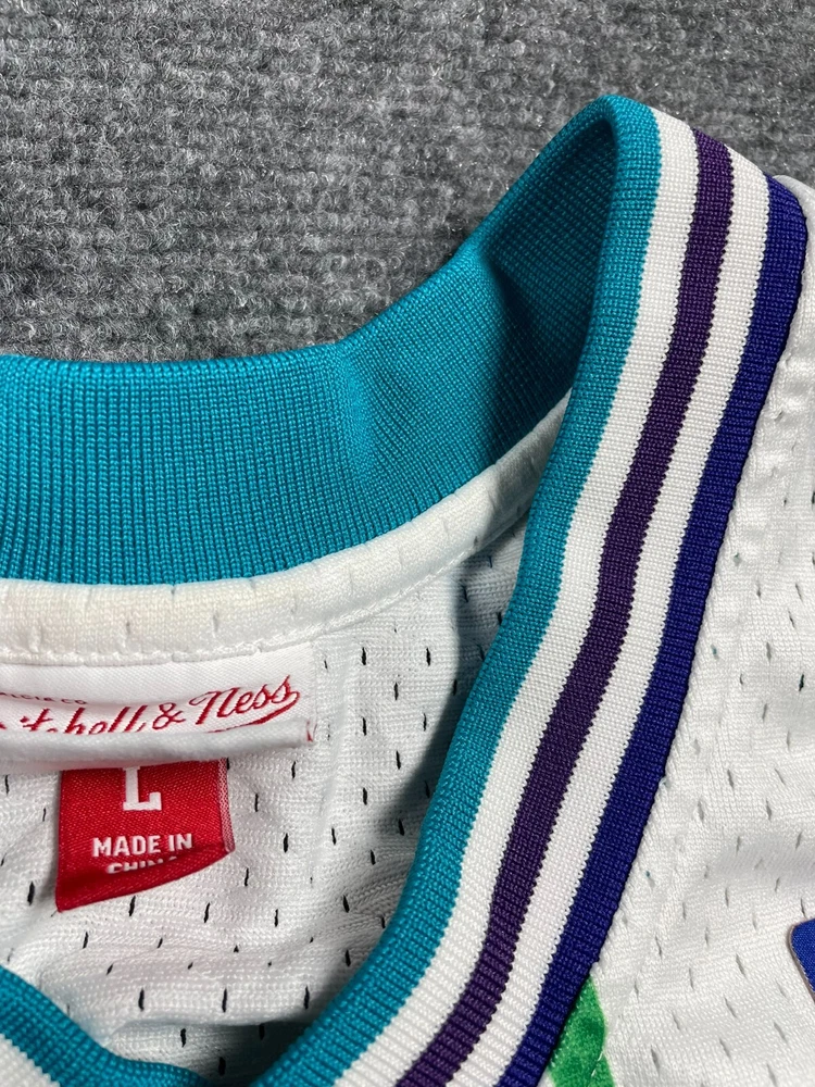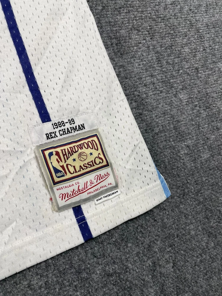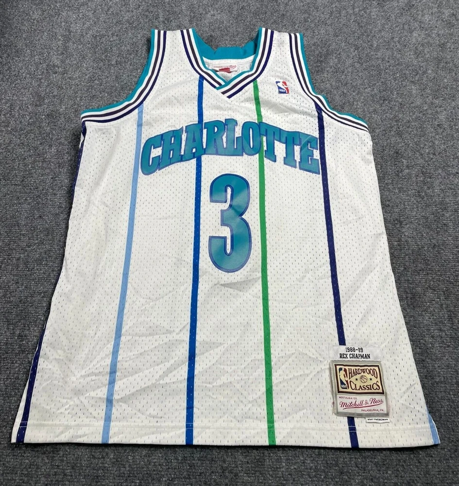 Show off your love for the Charlotte Hornets with this Mitchell & Ness Rex Chapman Swingman Jersey. Made with high-quality materials, this white jersey features stripes for a classic look. It's perfect for any fan of the National Basketball Association (NBA) and comes in size L for men. This jersey is a must-have for any basketball enthusiast and is ideal for regular season games. The Mitchell & Ness brand is known for its quality products, and this jersey is no exception. It's made in China and features the Charlotte Hornets team logo, making it a great addition to any fan's collection. Get yours today and show your support for the team!