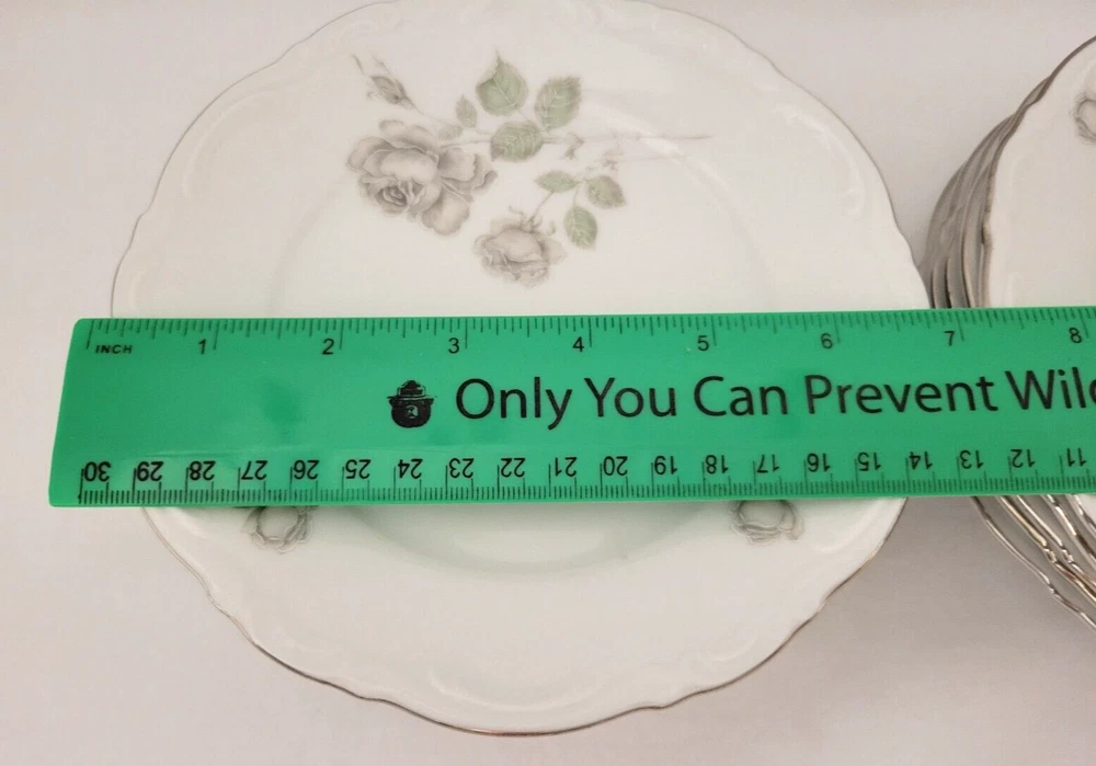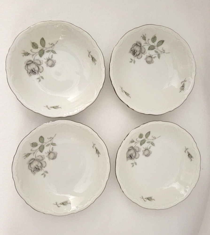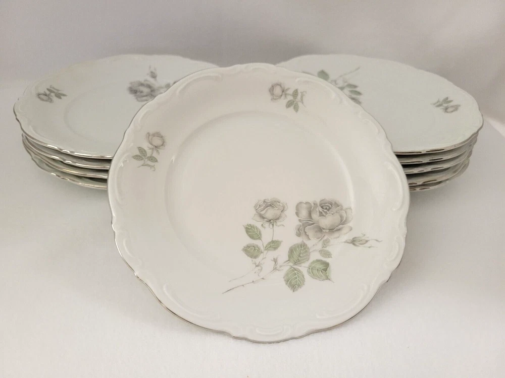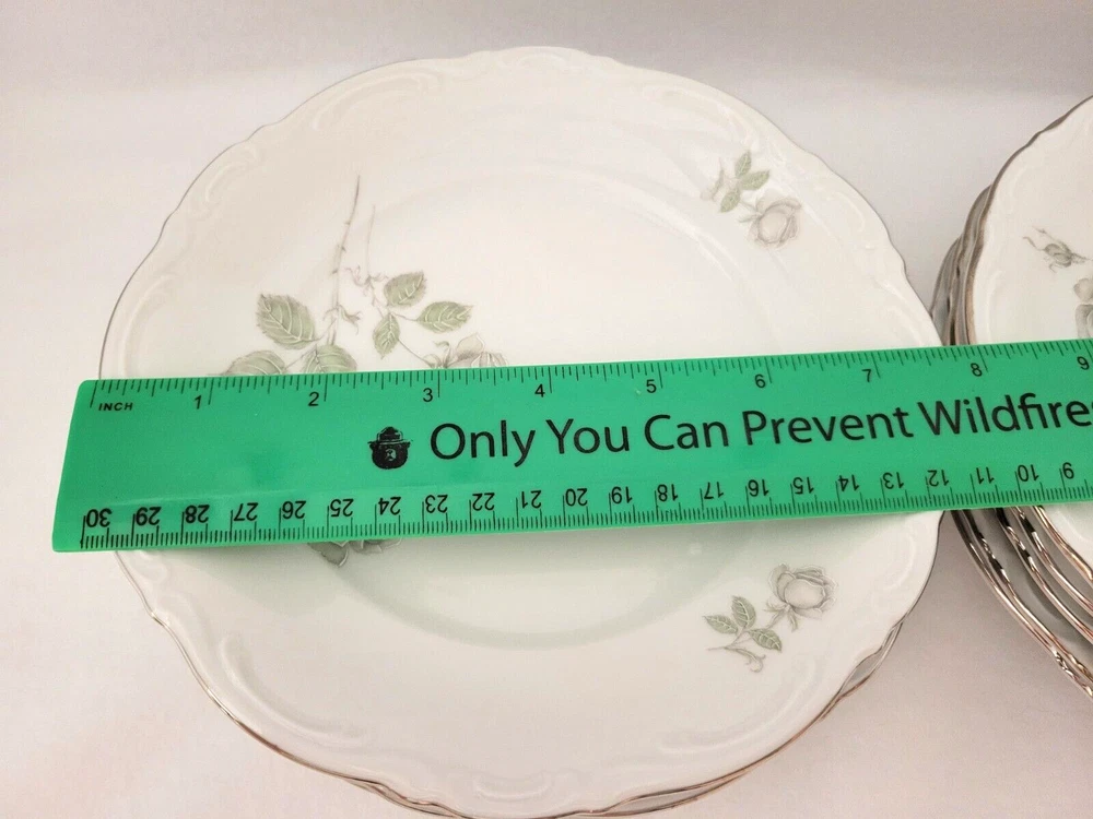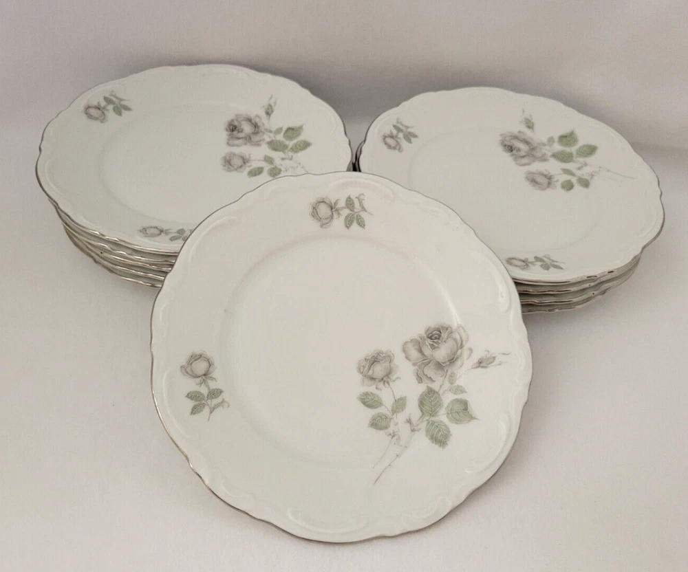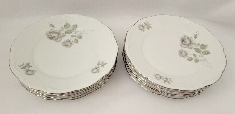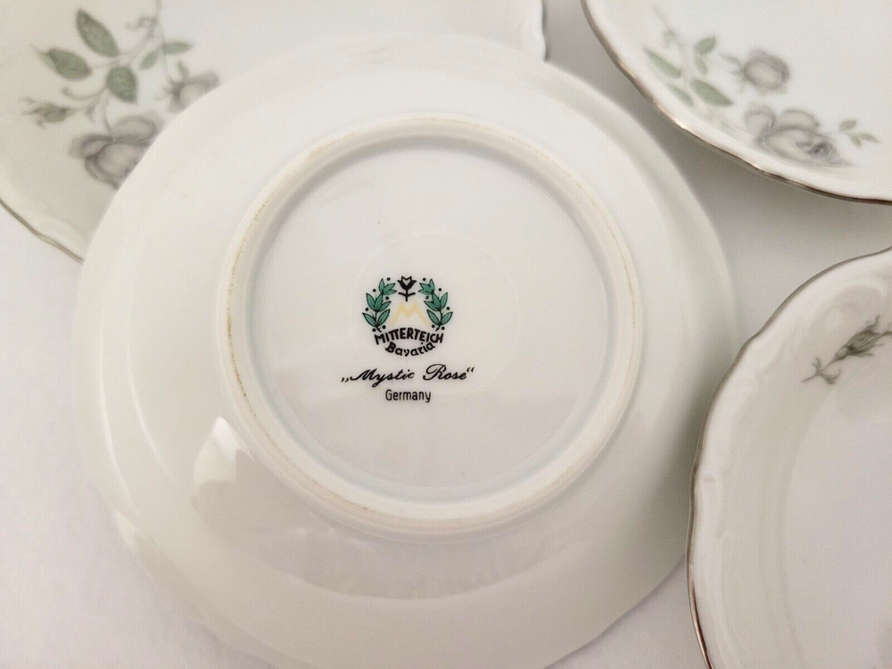 Mitterteich Bavarian Mystic Rose Silver Platinum Trim 4 - Approx. 5 inch Dessert Bowls 10 - Approx. 7 inch Dessert Plates 10 - Approx. 8 inch Salad Plates Each item is carefully packaged to prevent any damage and is shipped immediately with tracking.