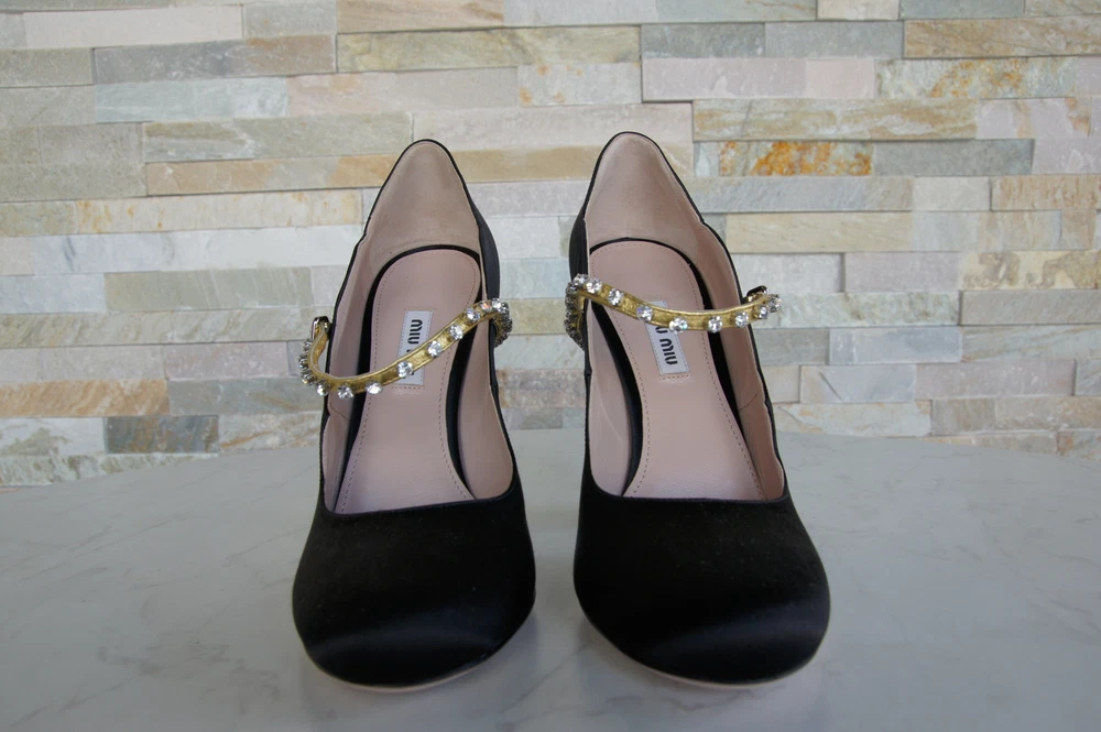 MIU MIU Pumps satin rhinestones black MIU MIU Exclusive pumps / Mary Jane / high heels made of high-quality satin. Golden adjustable leather strap with rhinestones on the instep. Leather and rubber outsole. Inner shoe made entirely of leather. Block paragraph. MIU MIU Lettering on the insole and outsole. Shoes are delivered in the original box with a shoe bag 5I822C RASO 4 NERO + ORO (BLACK + GOLD) Heel height: 12.5 cm MIU MIU Pumps satin rhinestones black MIU MIU Exclusive pumps / Mary Jane / high heels made of high-quality satin. Golden adjustable leather strap with rhinestones on the instep. Leather and rubber outsole. Inner shoe made entirely of leather. Block paragraph. MIU MIU Lettering on the insole and outsole. Shoes are delivered in the original box with a shoe bag 5I822C RASO 4 NERO + ORO (BLACK + GOLD) Heel height: 12.5 cm