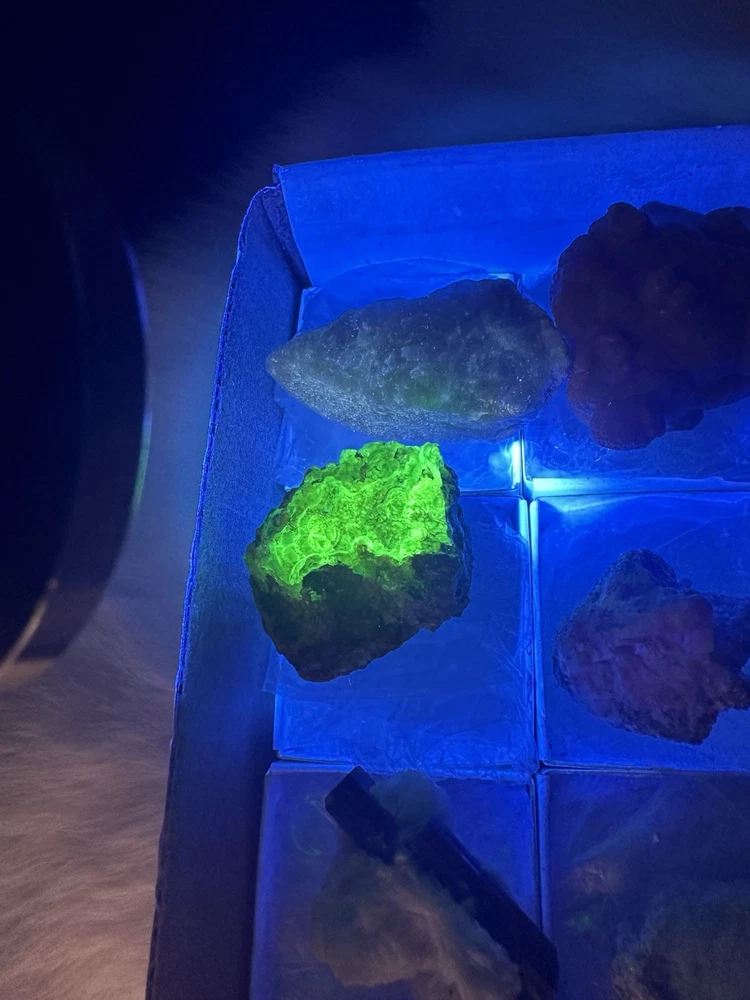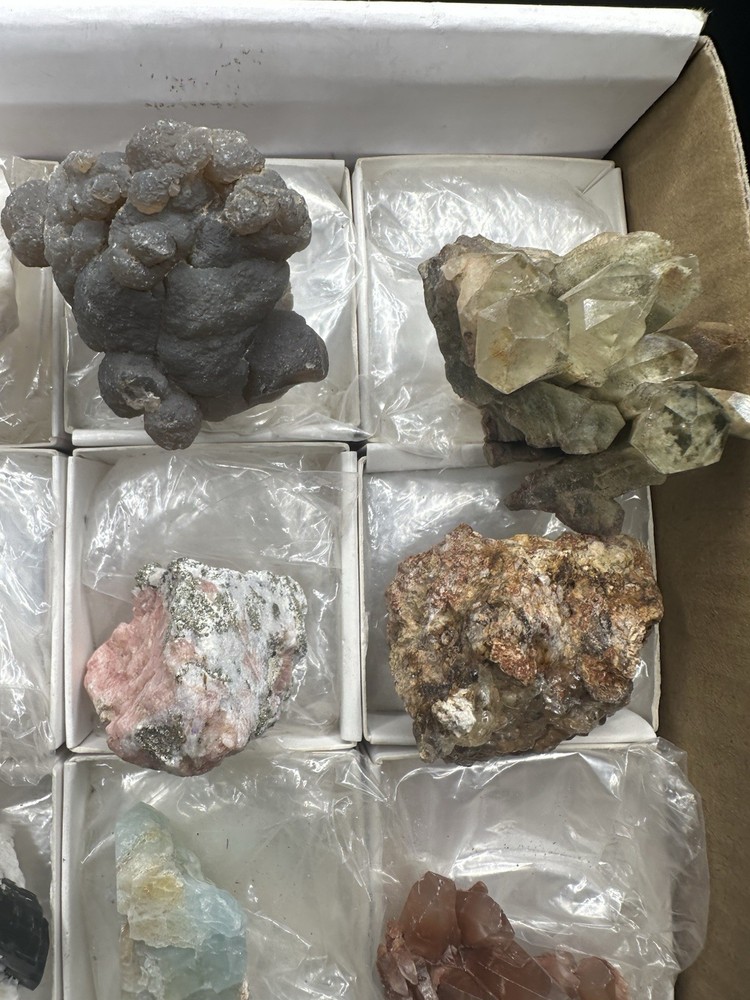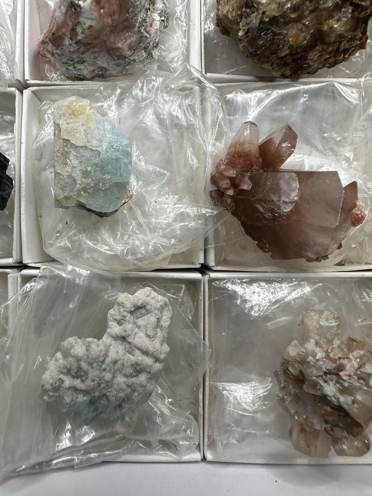 1 flat - 12 pieces of mix crystals 1. Pink tourmaline with pink druzy 2. Botryoidal 3. Chlorite quartz 4. Phantom fluorite 5. Rhodochrosite 6. Kryptonite crystals 7. Black Tourmaline in matrix 8. Aquamarine 9. Red calcite 10. Quartzi 11. Blue tourmaline bunches 12z red aragonite