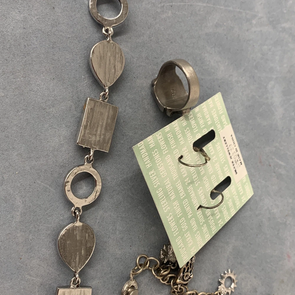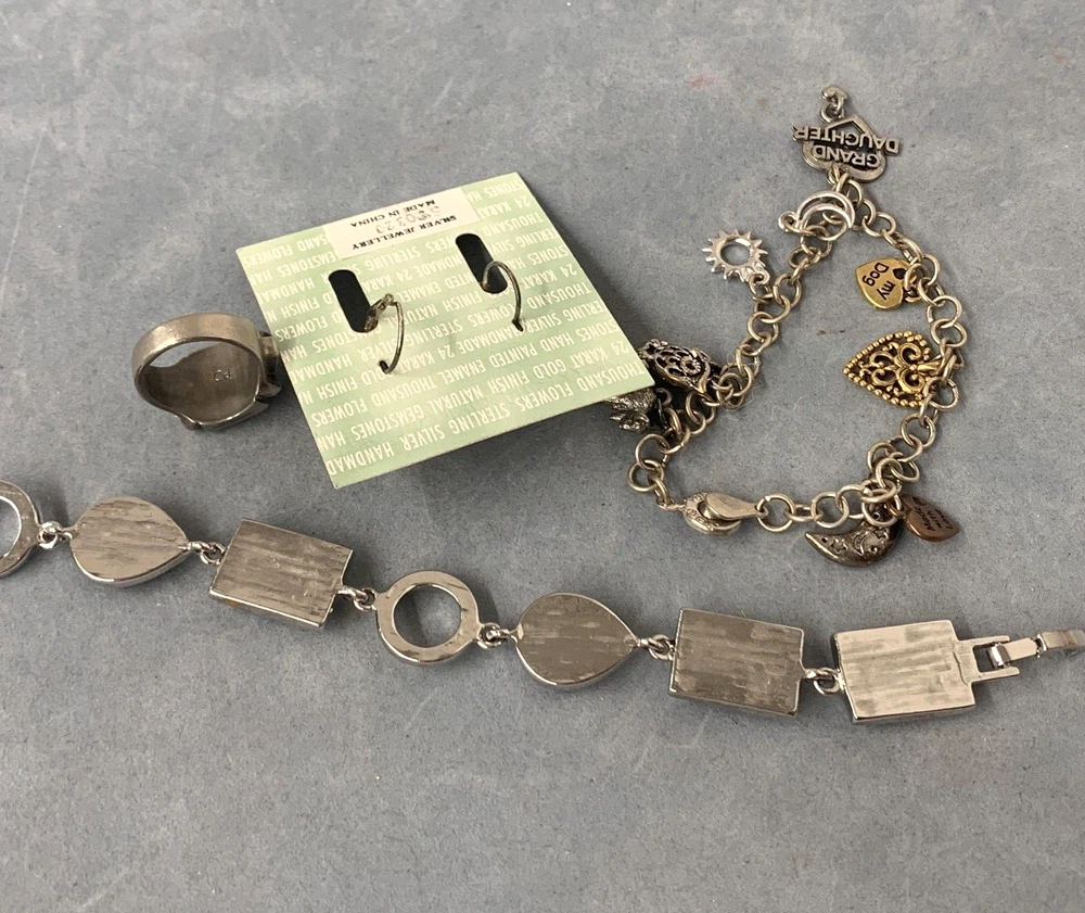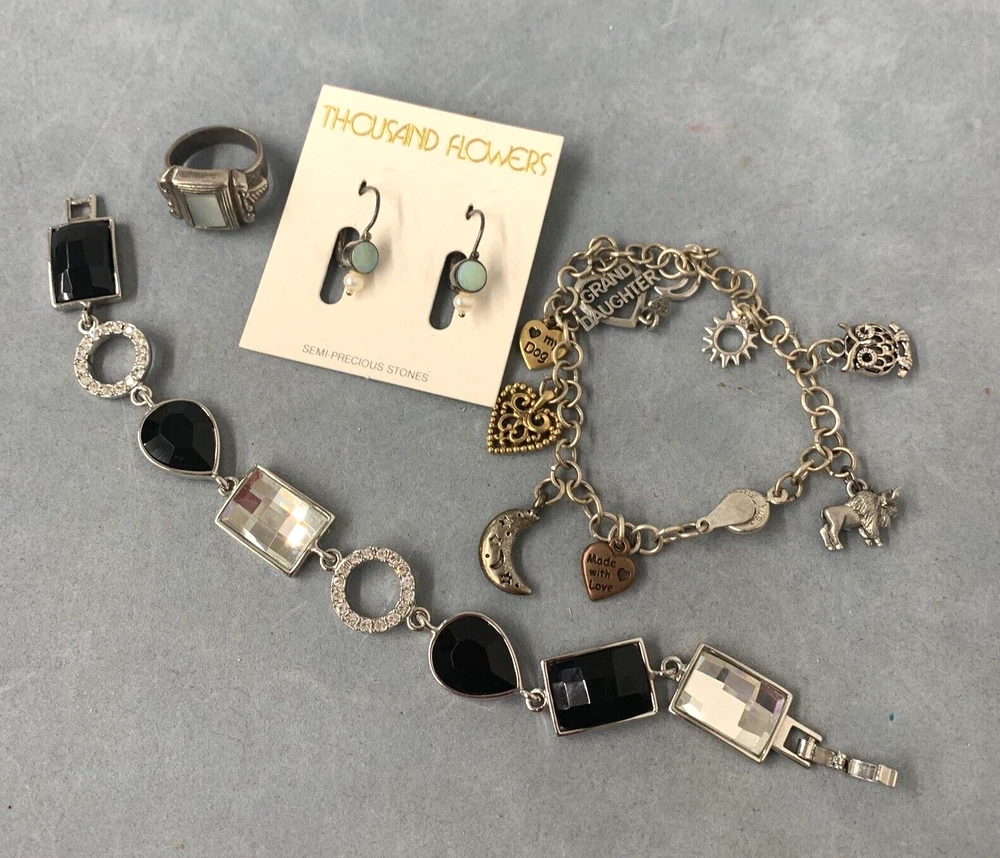 This is a mix of jewelry. Opal Sterling Earrings Thousand Flowers, Lia Sophia Bracelet, Jeng Yue charm Bracelet and a PD stamped ring. Items are preowned & sold as shown. Please view carefully. Shipping and packaging $7.00 Media Mail within the continental USA only. No international sales. Thanks