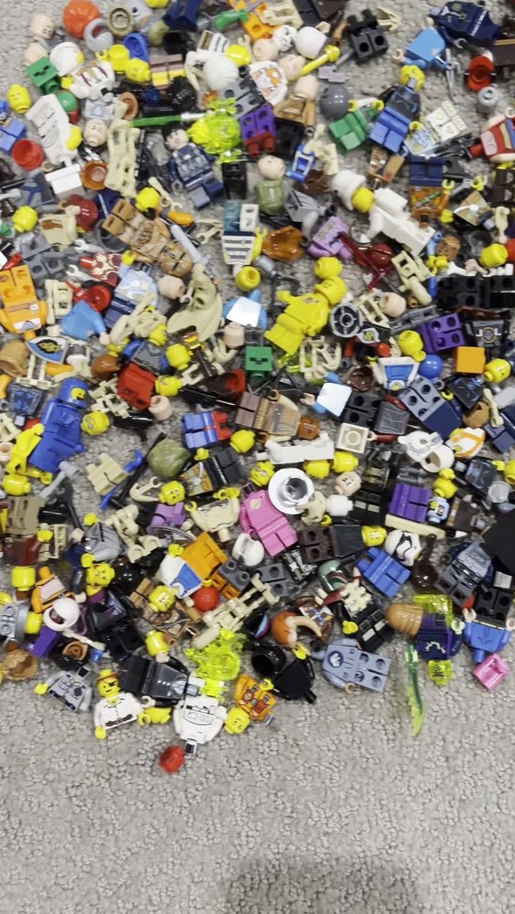The product is a mixed bulk lot of over 100 LEGO minifigures with accessories from various themes including Star Wars, Jurassic Park, Ninjago, City, and more.