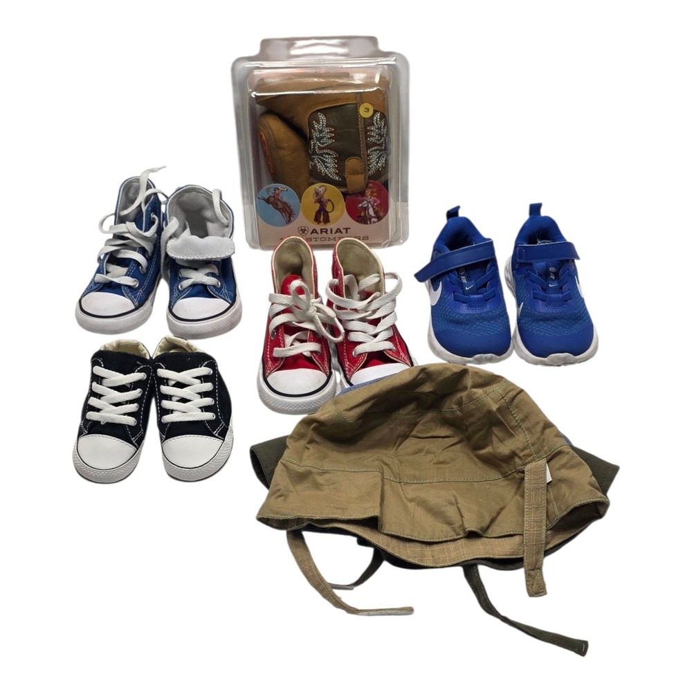 Huge Baby/Toddler Shoe and Hat Bundle! Get a fantastic deal on this mixed lot of pre-owned, high-quality footwear and a hat. This bundle features a great variety of styles and brands, ensuring your little one is covered for any occasion, from playdates to special events. You will receive six pairs of shoes and a versatile khaki/olive green canvas hat (possibly a sun or aviator style). The shoes include: • Converse Chuck Taylor style: Blue, Red, and Black/White (3 pairs) • Nike Sneakers: Bright blue with hook-and-loop closure (1 pair) • Ariat Cowboy Boots: Brown leather/suede in original box (1 pair, size 3 on box) Condition: Mixed sizes. All items are pre-owned in good condition with normal wash and play wear—no major flaws. Ready for their next adventure! An excellent value for a growing shoe collection.