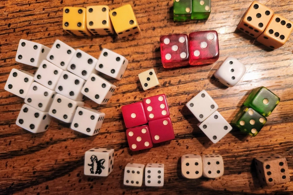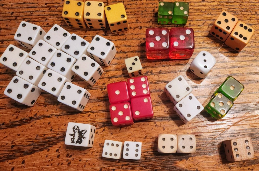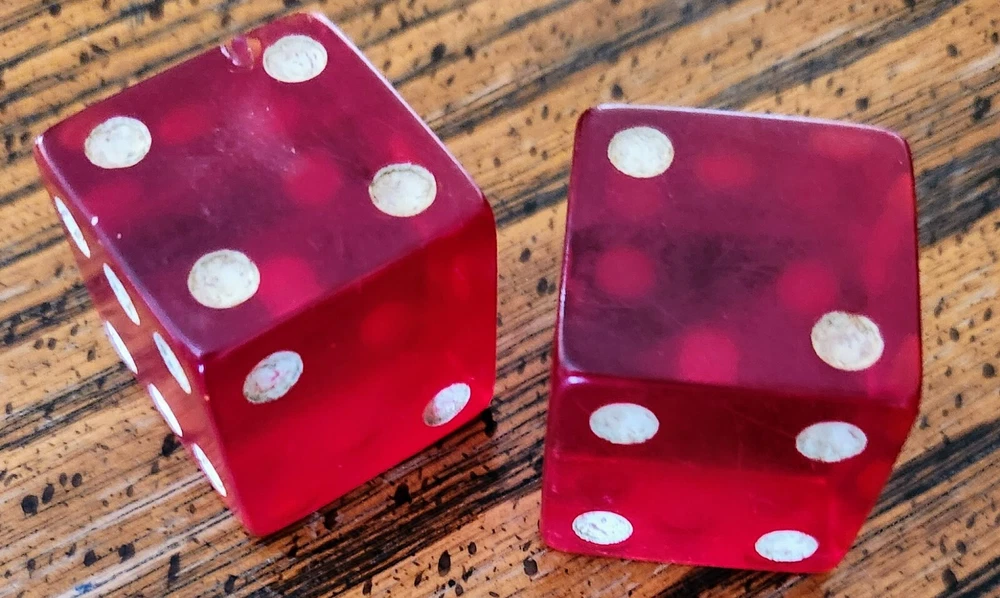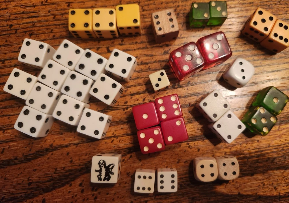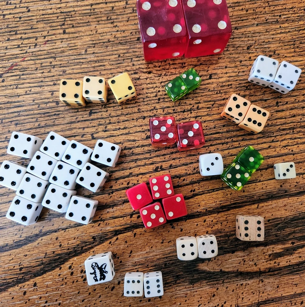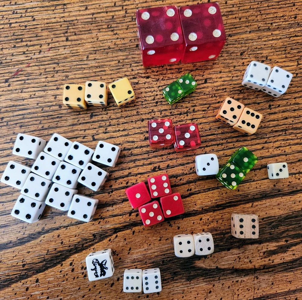 A lot of vintage dice. Made of glass, wood, plastic. Dice of all sizes & colors. Some are faded & the large red dice do have chips from age. I remember them in my Grandma's curio cabinet when I was about 5-years old, back in the early 1950s. Great conversation pieces. You are buying them 'as is'.
