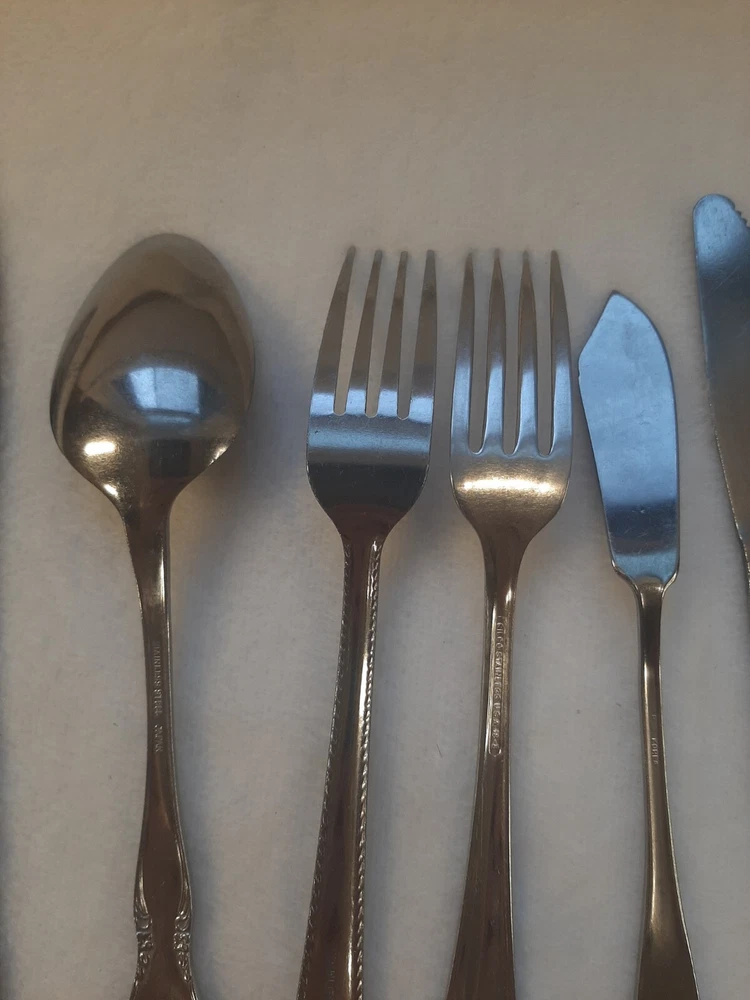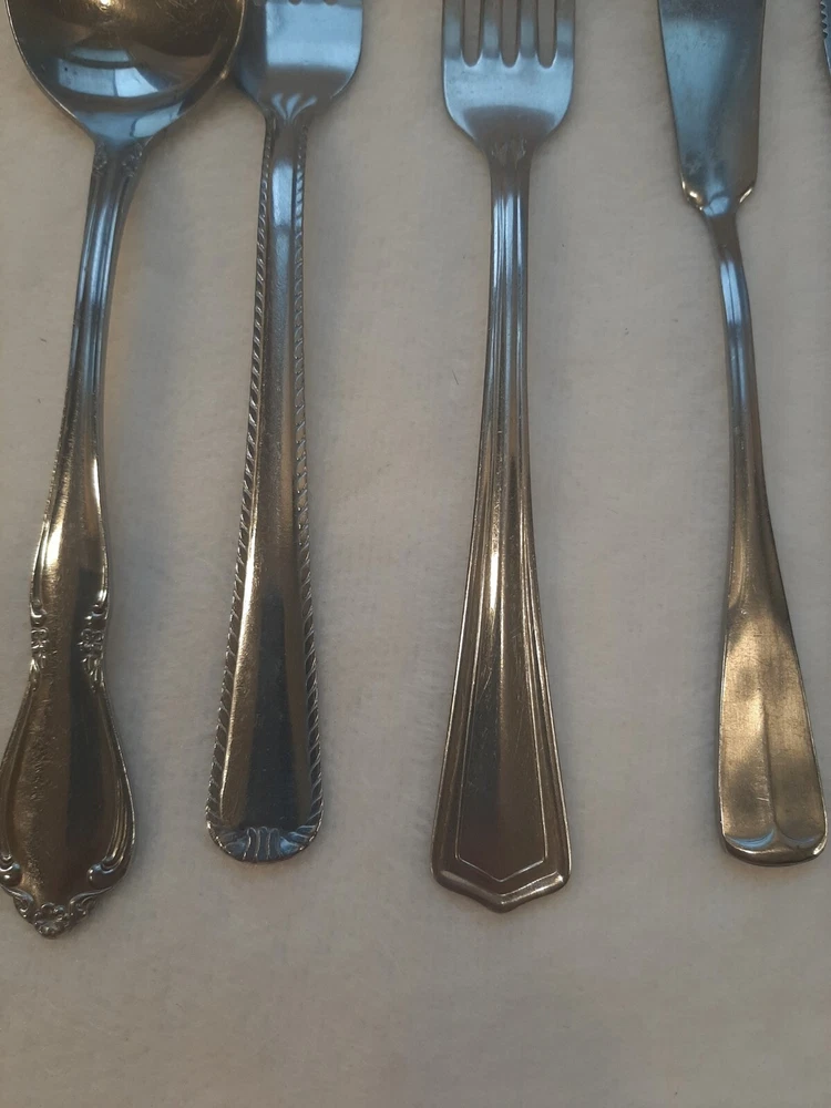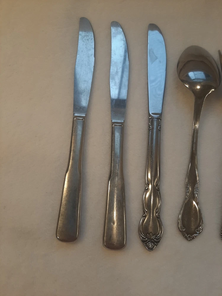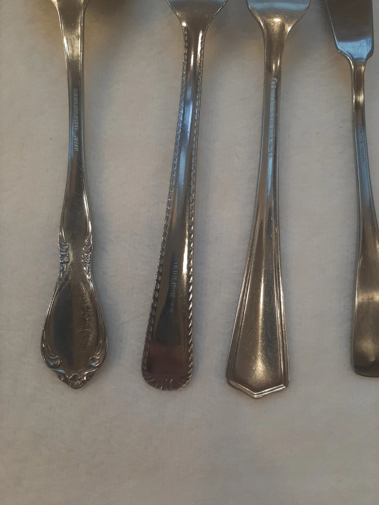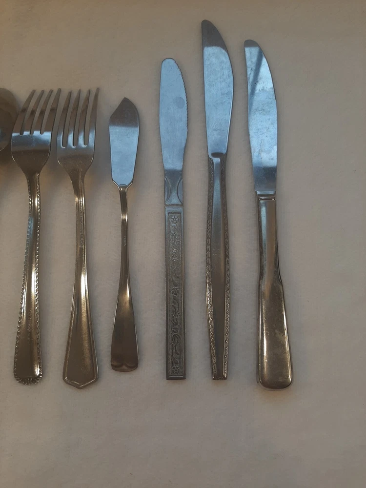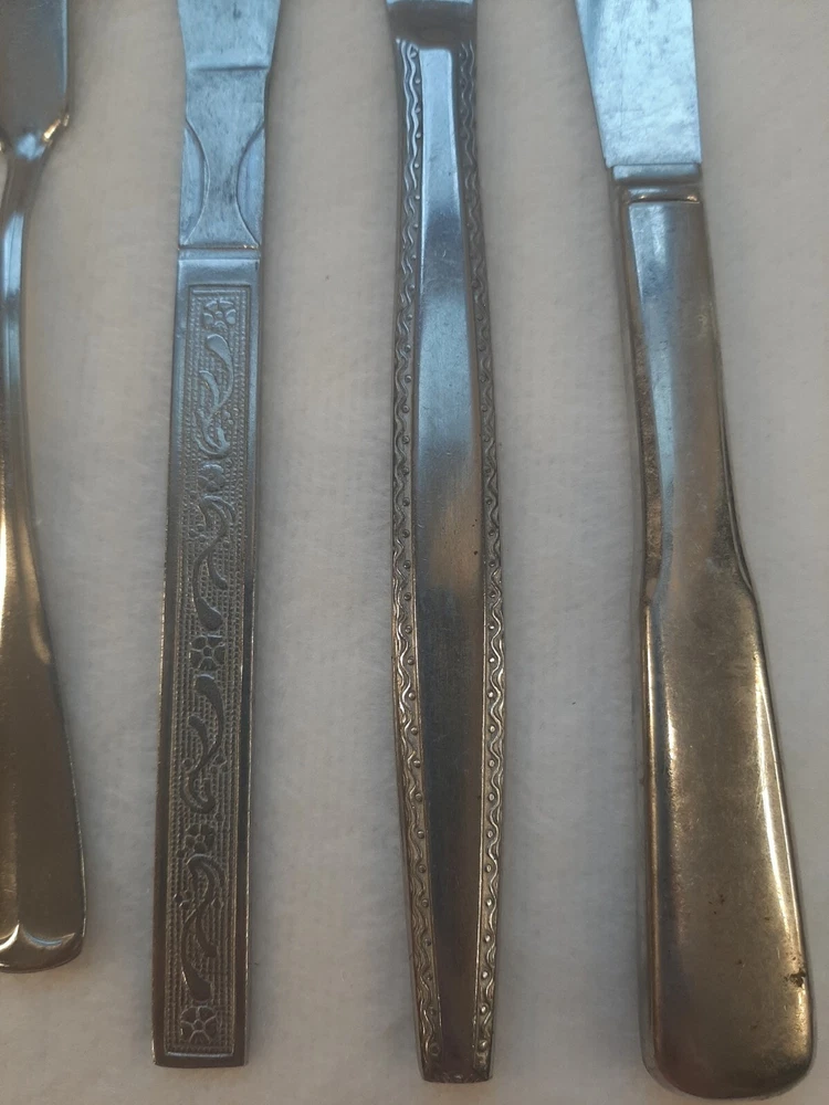 Mixed Lot of 10 Stainless Flatware Forks/Knifes/Spoons Patterns Replacements In good pre-owned condition may show signs of wear from use/handling/storage/display. Please view all pics for condition/details/flaws/issues. SOLD AS IS Lot of flatware unknown makers 6 dinner knifes 1 butter knife 1 dinner spoon 2 forks There is/maybe marks/spots/dirt/debris/rust/tarnish please see photos 1-20, there is/maybe paint loss/sticker loss please see photos 1-20, there is lite discoloration please see photos 1-20, there are surface scratches to item please see photos 1-20, please see all photos for condition/issues/details.