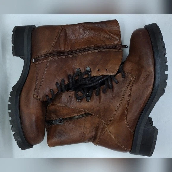 Features Brown Lace up Side zippers Combat boots Military Leather Boho Retro 90s Y2K Streetwear Great Pre-Loved Condition SIZE 39 Measurements Pit to Pit: Length: Waist: Rise: Inseam: Length: Please check to be sure of fit Smoke Free Pets Free Please feel free to contact me for any questions or offer Bundle Discounts Offered Fast Shipping *41226-5510-24*