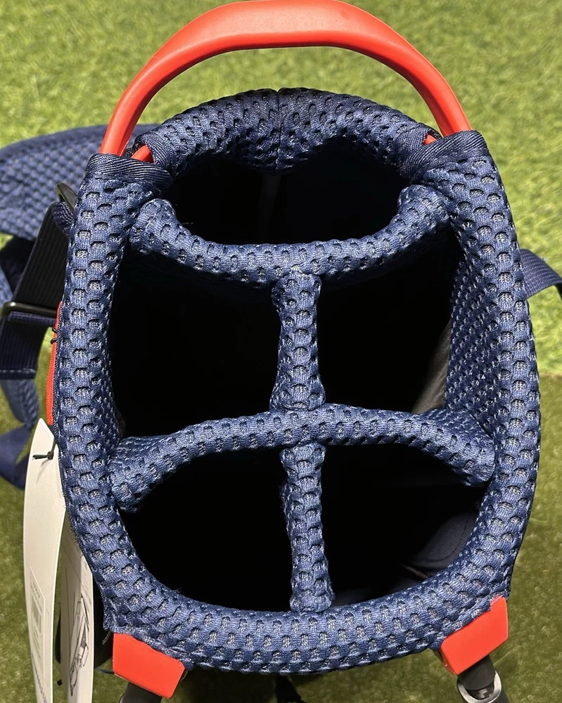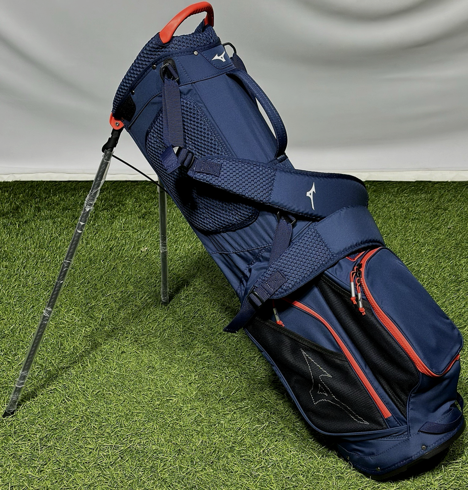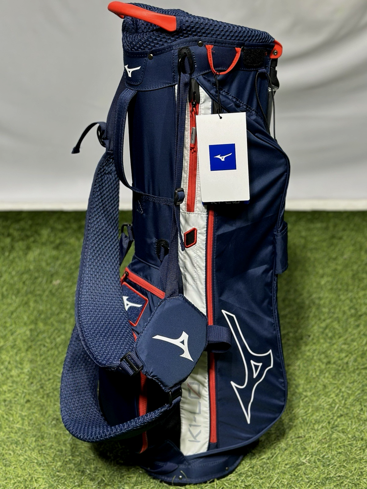 We are a reputable golf company that has been in business in St. Louis, Missouri since 1975. We have been doing this for 40 years because we do things right the first time. WE HAVE THE FASTEST SHIPPING ON EBAY! Don't believe us? Check out our Feedback. If you have questions, please feel free to ask. As always, thank you for looking. Mizuno K1-L0 Lightweight Stand Bag COLOR: Navy / Red STYLE: Stand Bag DIVIDERS: 5-Way Divider CONDITION: NEW w/ Tags (10/10) RAIN HOOD: Included! Mizuno's almost weightless stand bag is a shock to pick up - empty or full. The K1-LO features a lightweight construction and carbon fiber stand, stripping almost half its expected load. High-density foam shoulder straps and intelligently placed pockets make it a joy for golfers who prefer to walk the course Features: 4-Way top cuff with side grab handles 3 Full-length dividers Lightweight composite legs Small accessories pocket 2 Medium sized accessory zipper pockets Towel loop Vertical zipper ball pocket Matching rain hood