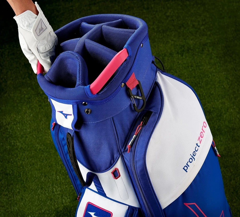 We are a reputable golf company that has been in business in St. Louis, Missouri since 1975. We have been doing this for 40 years because we do things right the first time. WE HAVE THE FASTEST SHIPPING ON EBAY! Don't believe us? Check out our Feedback. If you have questions, please feel free to ask. As always, thank you for looking. Mizuno Project Zero LW-C Cart Golf Bag COLOR: Blue/Pink STYLE: Cart Bag DIVIDERS: 7-Way Divider CONDITION: New w/ Tags - See Pics (10/10) RAIN HOOD: Included We have partnered with BCRF for five years and counting to aid them in their efforts to turn 1 in 8 women diagnosed with breast cancer into 0 in 8. The LW-C is here to break the reputation of cart bags as being bulky, heavy, and cluttered. Large pockets for apparel or bigger items, a cooler pocket for hydration, and a 7-way top cuff are just a few features that this lightweight cart bag still has, but in a smaller, more efficient design. 7-Way Top Cuff with 3 Full Length Dividers Dual Shoulder Straps with Quick Release Clips: Can be easily removed and stored in the full length apparel pocket so straps don't get in the way when riding Single Shoulder Strap with Adjustment Point Full Length Apparel Pockets Large Cooler Pocket with Drain Hole Fleece Lined Valuables Pocket Padded Grab Handle on Body of Bag Removable Ball Pocket Panel: Easily zips off and back on for customization or embroidery Quick Access Mesh Pockets Push Cart Notch Molded into Bottom Cuff: Enables an extra level of stability when used on a push cart Integrated Pen/Market Slot Carabiner Accessory Clip: A metal loop with a spring loaded closure to quickly connect accessories Loop Velcro Patch: Provides easy accessibility for gloves, or offers a perfect place to display morale patches for an extra level of personalization Elastic Strip for Tees Matching Rainhood: Matching rainhood ensures clubs stay dry in wet weather Umbrella Holder
