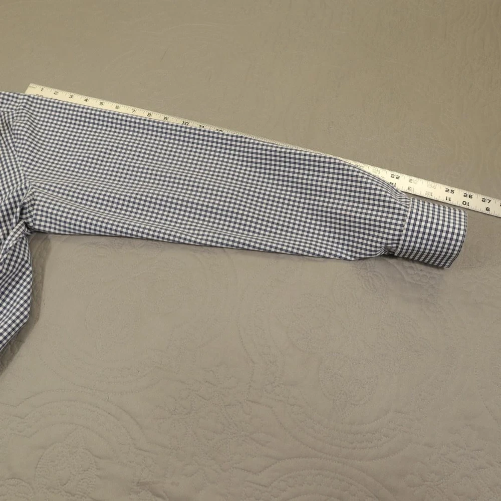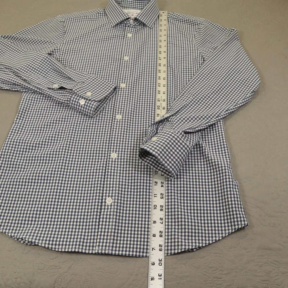 Brand: Mizzen+Main Style: Mens long sleeve dress shirt from the Leeward Collection with spread collar, button front, barrel cuffs, and a curved shirttail hem in a trim, slim-style fit. Color/Pattern: Blue and white gingham check pattern with white buttons for a crisp, modern look. Material: 85% polyester, 15% spandex