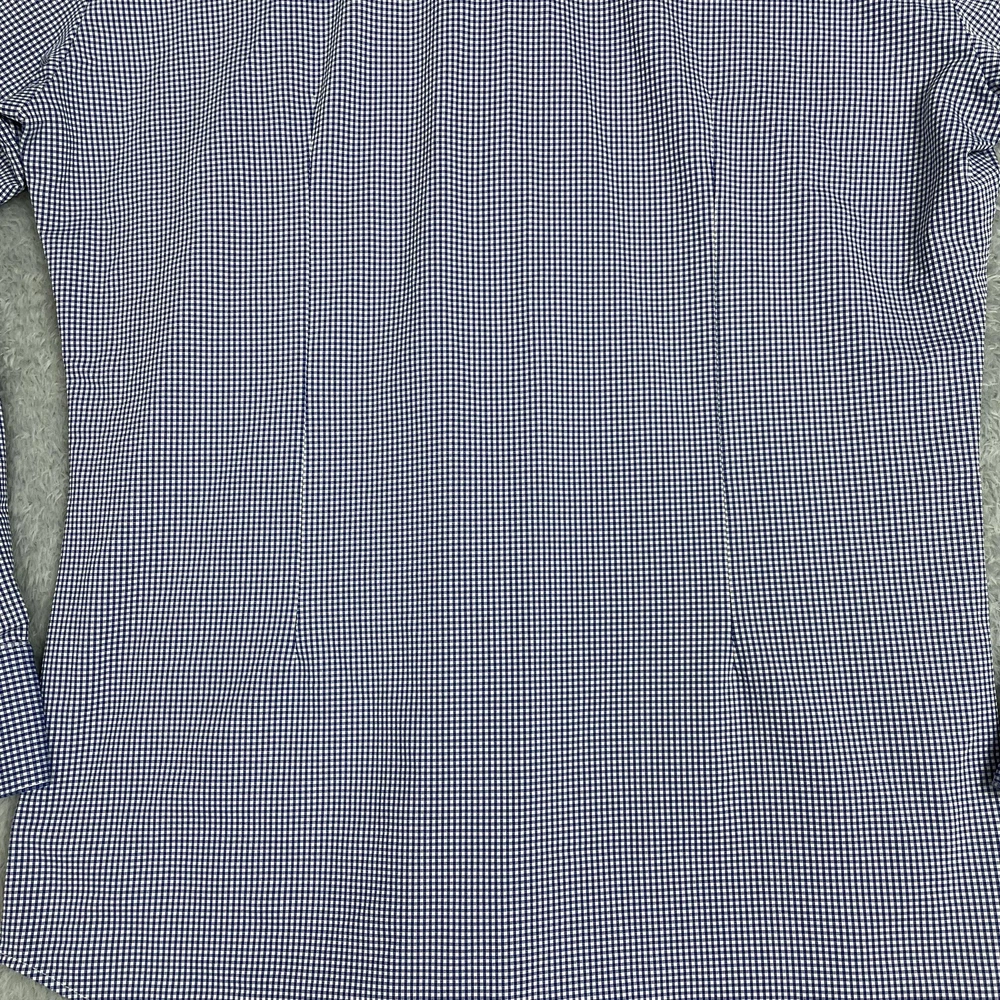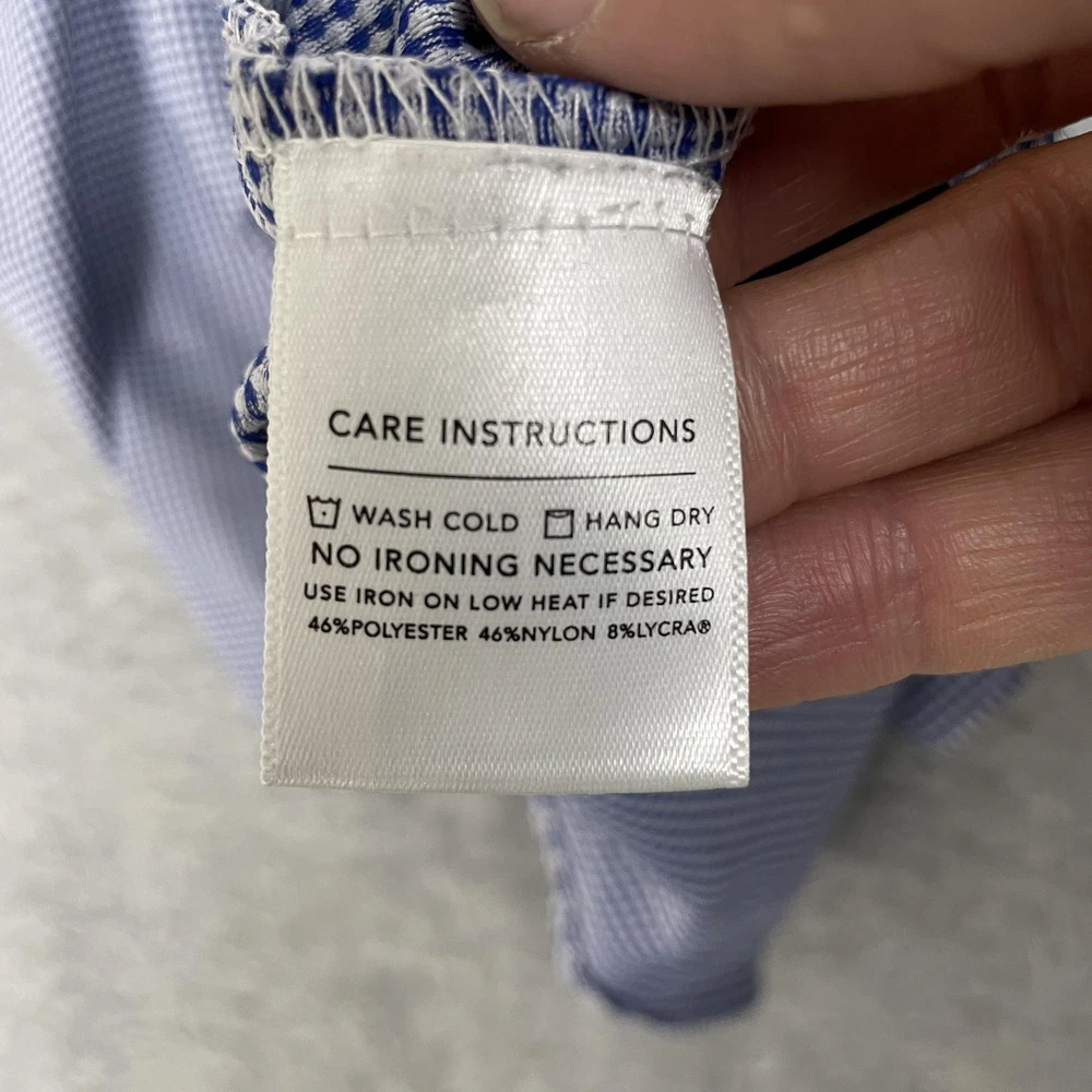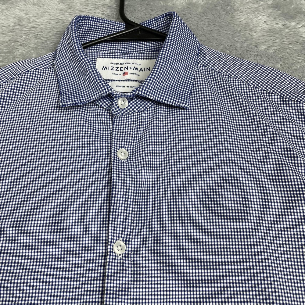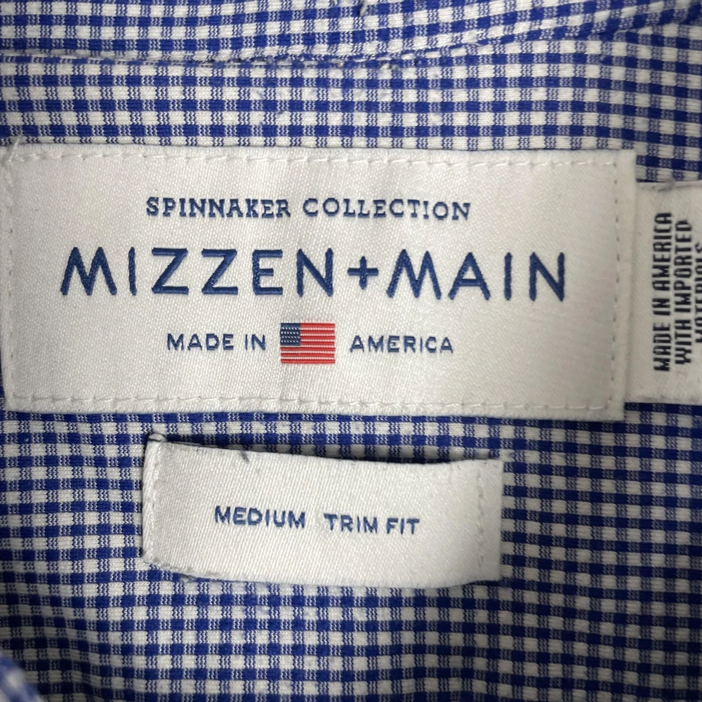 Mizzen+Main men's Spinnaker Collection trim fit dress shirt in blue gingham performance stretch fabric. Brand: Mizzen+Main. Style: Spinnaker Collection trim fit button-front dress shirt with spread collar and long sleeves. Gender: Men. Color and pattern: Blue and white micro gingham check. Tag size: Medium Trim Fit. *CHECK THE MEASUREMENTS IN THE PHOTOS Material: 46% polyester, 46% nylon, 8% Lycra spandex; made in America with imported materials per interior content label. Details: Lightweight performance woven fabric with added stretch, full button front placket, spread collar, long sleeves with adjustable two-button barrel cuffs and gauntlet buttons, and curved shirt-tail hem that can be worn tucked or untucked. Branding: Interior labels featuring Spinnaker Collection and Mizzen+Main Made in America wording with separate Medium Trim Fit size tag. Care instructions: Wash cold, hang dry, no ironing necessary, and use iron on low heat if desired per interior care label. Occasion and use: Versatile performance dress shirt suitable for business, office, travel, or smart casual wear with dress pants or jeans. Special notes: Non-iron stretch fabric blend is designed for comfort, easy care, and a polished appearance.
