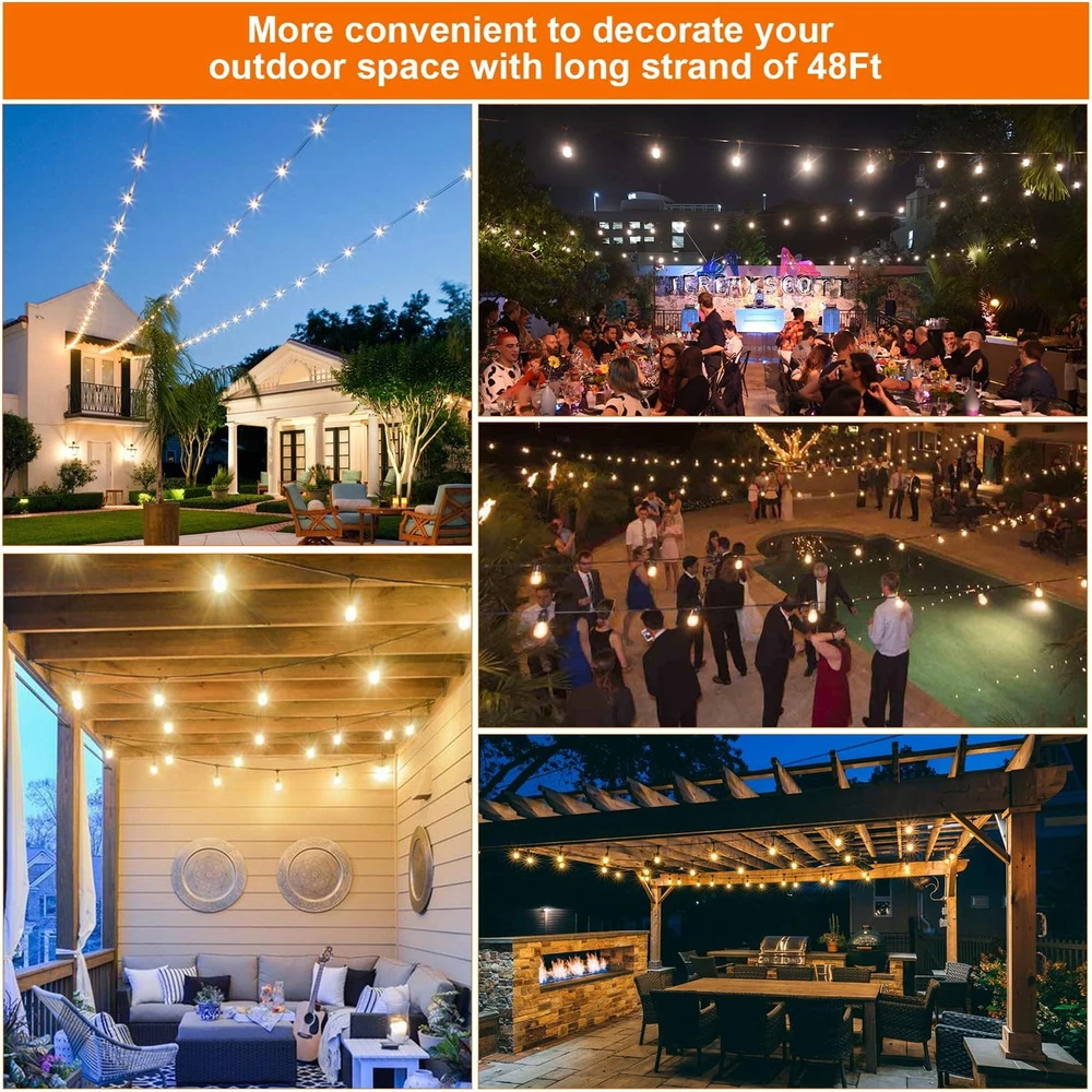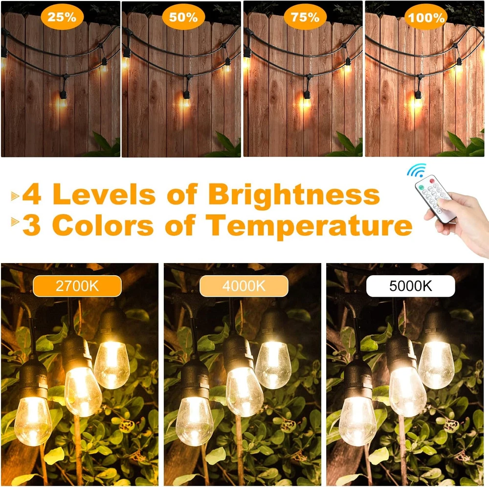 Amazing 3-color in 1 Solar String Light with Jump and Fade Modes: This light is an awesome combination that you've never met before!! Built by the latest LED technology, you can get 2700K 4000K 5000K color lights all in one string, moreover, it is dimmable, smoothly dimmed from 25%-100% by included remote controller. It fits well for many indoors and outdoors activities such family dinner, summer night barbeque, camping, weddings, celebrations. Just try and you will not regret Zero Energy Bills & Auto On/Off: Running by solar energy, so it will completely save your electricity and absolutely easy to install without any outdoor outlets needed. Please note: the light only automatically light up in the evening and off in daytime or you can set set time for working by the remote, no need to turn on & off the lights manually. More convenient to adjust solar panel with a clip (e.g. to pergola or fence) or a stake to mount it in the ground No Worries, Whatever Sunny or Rainy: A premium super large-capacity solar panel and an addition USB charging port, they allow customers use these string lights well even in the bad conditions. Giving you two cool options to choose from, a full charge takes 8 hours of sunlight and 6 hours via USB (can be used up to 8-10 hours/charge). Note: The charging time may take longer than 8 hours when it is on cloudy days All Weather-resistant & Extremely Durable Shatterproof Bulbs: These 48 ft commercial grade solar string lights are equipped with 18 LED S14 Shatterproof Plastic bulbs (3 spares) and 15 IP65 Waterproof E26 base sockets. Safer than glass bulbs and withstand well from extreme hot / cold temperatures and rainy, windy, or damp climates for years of use. Please note that multiple strings solar string light can't be connected together, as one solar panel can only offer enough power to one string light Please note that our solar panel is light-sensitive and will only light up automatically when the surrounding environment is dim. The string light will automatically turn off after 6 hours working. Package contains 15 + 3pcs LED bulbs, 1 pack 48 ft strand, 2pcs remote controllers, 1 solar panel with a stake & a clip and user manual The solar panel with a 6-hour auto shut-off timer function, protecting the battery's power reserve. Even during rainy days, it still has the ability to provide illumination for your patio Product Description Mlambert 3 in 1 Dimmable LED Outdoor Solar String Lights - Create a relaxed and romantic ambiance for your family every day of the season! Save on Bills & Dusk to Dawn Solar Powered Lights! Auto Fully Charging at Daytime for 8-10 Hours Say goodbye to expensive electricity bills and embrace the energy-saving benefits of our solar-powered light. 5000mAh Large capacity solar panel absorb solar energy 8 hours of direct sunlight can last 8-10 hours. When cloudy or rainy day, 6- 8 hours charging via USB port charging is also applicable. Auto Lighting Up at Night for 10 Hours Our solar panel light sensor makes the solar string lights automatically turn on at night and off at dawn . These Solar lights are energy-saving, as absorb the sun to illuminate your patio, backyard, porch, garden, tents, cafeand party decor. 2700K/4000K/5000K Dimmable Waterproof Shatterproof Solar Powered Hanging Lights Upgraded Remote Control Energy-saving Solar Patio Lights with JUMP & FADE Modes Solar String Lights with Remote Control & Timer Simply press the remote button to choose your desired light color and brightness You can easily to choose the color temperature or the brightness you want just by a button. Also, you can also set the time for it if needed. 4 Level Timer Function: We found that many users purchase timer plug with string lights, so we equipped the lights with timming function. 30min/ 60min/ 120min/ 240min timmer for choosing. Will auto off after the minutes mode you setting. ***Comes with 2pcs remote controllers, No worry for the remotes missing*** Easy Installantion & Solar Patio Lights Engery-saving, No Electricity Bills for Home Our string light uses solar energy to operate, so it will save your electricity bill completely And absolutely, no more adding numbers to your electricity bills each year anymore. Moreover, you can hang them anywhere you like without any outdoor AC outlets. Each of the sockets has a hook hole which makes it very easy to install. You can hang up and installation anywhere that’s desired. 2 Newly Jump and Fade Lighting Modes Warm White Soft White Daylight White String Lights with Jump & Fade Modes The light string has 3CCT JUMP and 3CCT FADE modes, adding a naughty and flexible atmosphere to your space. From a distance, it looks like The stars twinkled and danced like fireflies, very beautiful. NOTE: the connection and fixing ring of the string lights and solar panel must tighten and well-connected, otherwise the lights will not work. Using our string lights, there should be no other light source around, otherwise the string lights will not work, our lights only work in dark environment. Maximizing Solar Energy Absorption Choose the Right Place to Install the Solar Panel for Solar Energy Absorbtion We recommend installing solar panels in a location with direct vertical sunlight. We do not recommend installing them under eaves or under trees, where shade can affect solar energy conversion and may result in solar panels that do not absorb sunlight well for power storage. The solar panels may not be sufficiently charged due to long transport, please fully charge for 8-10 hrs after receive the lights. How to use our lights properly? Remote control distance is 5 meters. (Point at the solar panel) When the solar panel is fully charged, need to press the "ON/OFF" button on the back of the solar panel to "on" state, use the remote control and the "mode" button on the back of the solar panel to turn on the light string. The solar panel must be in a dim environment without any light source around, because our light string is 