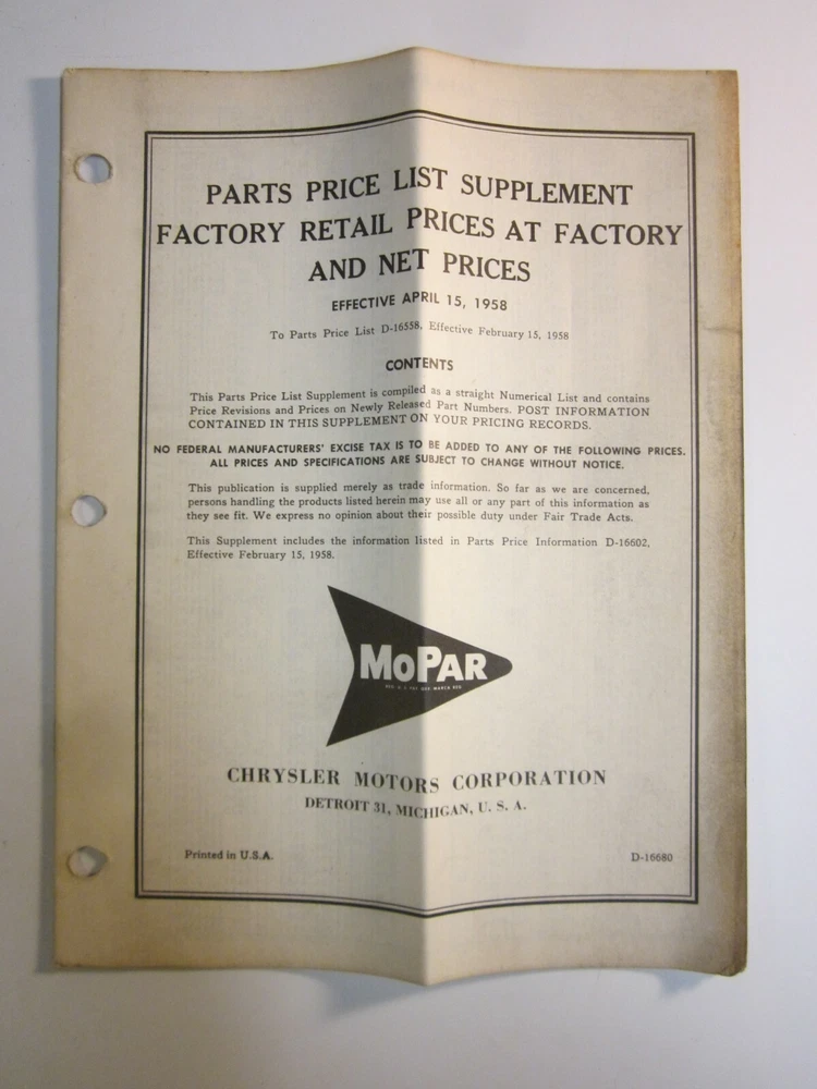 Parts Price List Supplement. Factory Retail Prices at Factory and Net Prices. Effective April 15, 1958. Supplement to Publication D-16602. MoPar parts, a division of Chrysler Motors Corp., Detroit. This booklet contains only part numbers - no diagrams, no text. For example, part No. 1618 307 is priced at $7.25 retail and $4.35 dealer wholesale. There is no explanation of what that part is. Thank you.