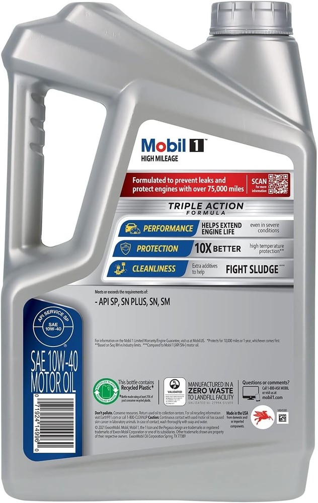 Mobil 1 High Mileage full-synthetic motor oil 10W-40 is designed for engines with over 75,000 miles to go up to 10,000 miles between oil changes.* Utilizes Mobil 1’s signature Triple Action Formula to deliver outstanding engine performance, protection, and cleanliness Meets ILSAC GF-6 standards to help provide low-speed pre-ignition (LSPI) and timing chain wear protection while keeping your engine clean and helping to improve your fuel economy Provides excellent internal engine heat protection (up to 500 degrees F) and low temperature protection (to -30 degrees F) Mobil 1 is specially formulated to help remove sludge and lower engine temperatures