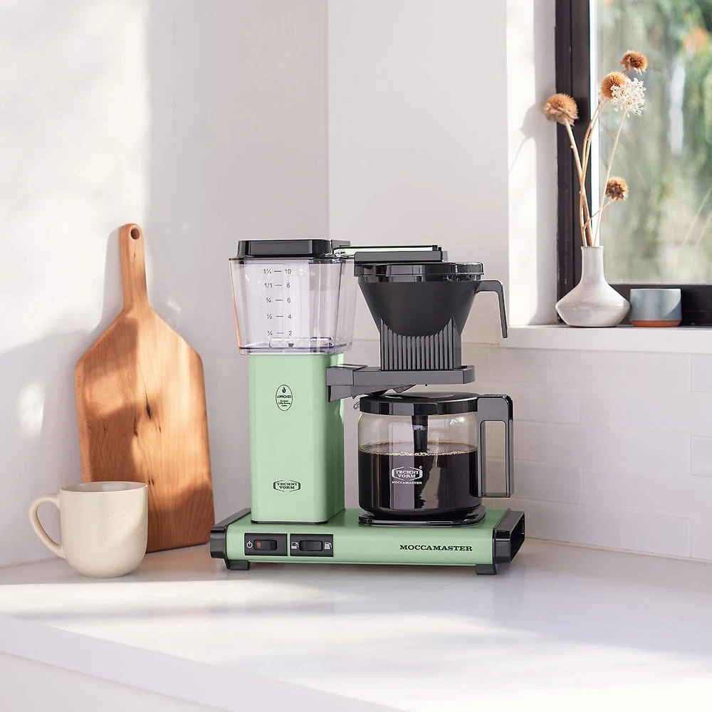 WE SHIP FROM US → US, SO YOU WILL NOT PAY ANY IMPORT FEES. THE DE MINIMIS LAW DOES NOT AFFECT YOUR ORDER. The Moccamaster coffeemaker makes 10 cups of coffee in just six minutes, keeping it at precisely the right temperature for over an hour and looking stylish all the while. Handmade in the Netherlands, this pistachio-colored brewer looks chic in kitchens that range from vintage to modern. Treat yourself to impeccably brewed coffee that exceeds the Specialty Coffee Association's rigorous Golden Cup standards. Metal and BPA-, BPS-, BPF- and phthalate-free plastic 10-cup/40-oz. glass carafe European Coffee Brewing Centre- and SCA-approved to exceed Golden Cup Standards Brews 40-oz. pot of coffee in 4–6 minutes Brew-Volume Selector switch to brew full or half carafe Copper heating element brews coffee between 196°F and 205°F; shuts off automatically when water reservoir is empty Proprietary hotplate keeps coffee between 175°F and 185°F for 100 minutes; shuts off automatically after 100 minutes Pre-immersion, drip-style system for perfect coffee bloom Auto drip-stop brew-basket stops flow of coffee when carafe is removed