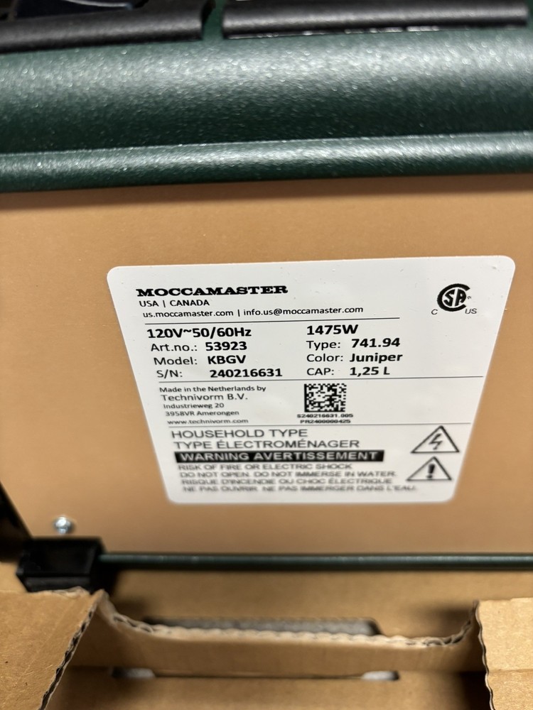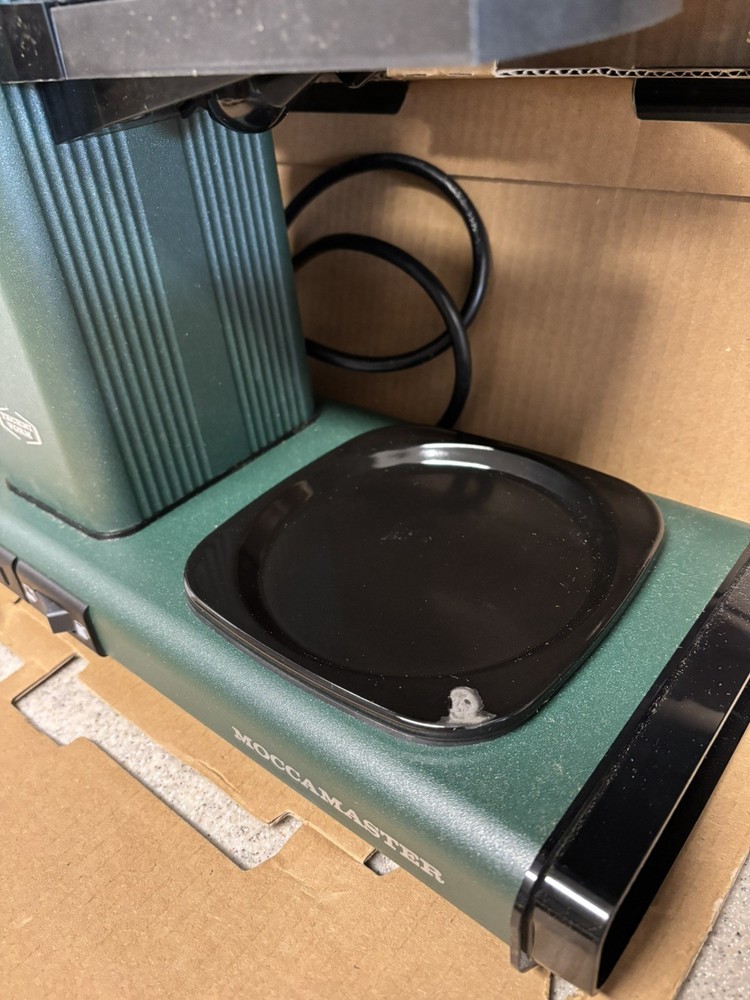 Brand Technivorm Moccamaster Capacity 40 Fluid Ounces Color Juniper Product Dimensions 6.5"D x 12.75"W x 14"H Special Feature Auto Shut-Off Coffee Maker Type Drip Coffee Machine Perfect Coffee Every Time: This pump-free coffee maker heats water to the correct temperature for coffee extraction Brew-Volume Selector switch for brewing half or full carafes Easy to Use: The Moccamaster brews a full 40 oz pot of coffee in 4-6 minutes using one switch Open box item - There is a small chip on the hot plate from a manufacturer defect as seen in photos. All parts still in original packaging and in original box.
