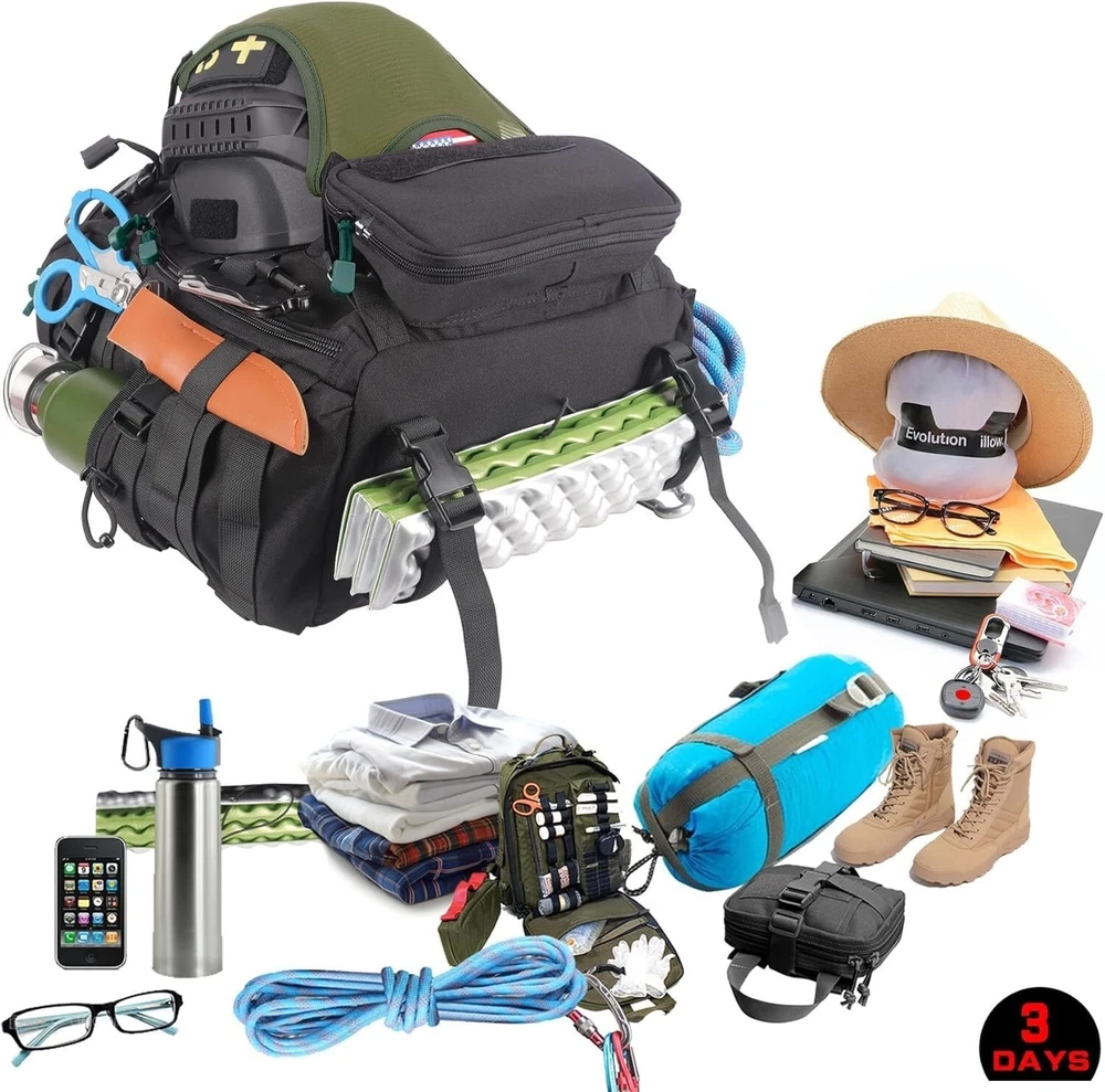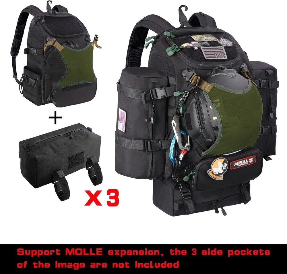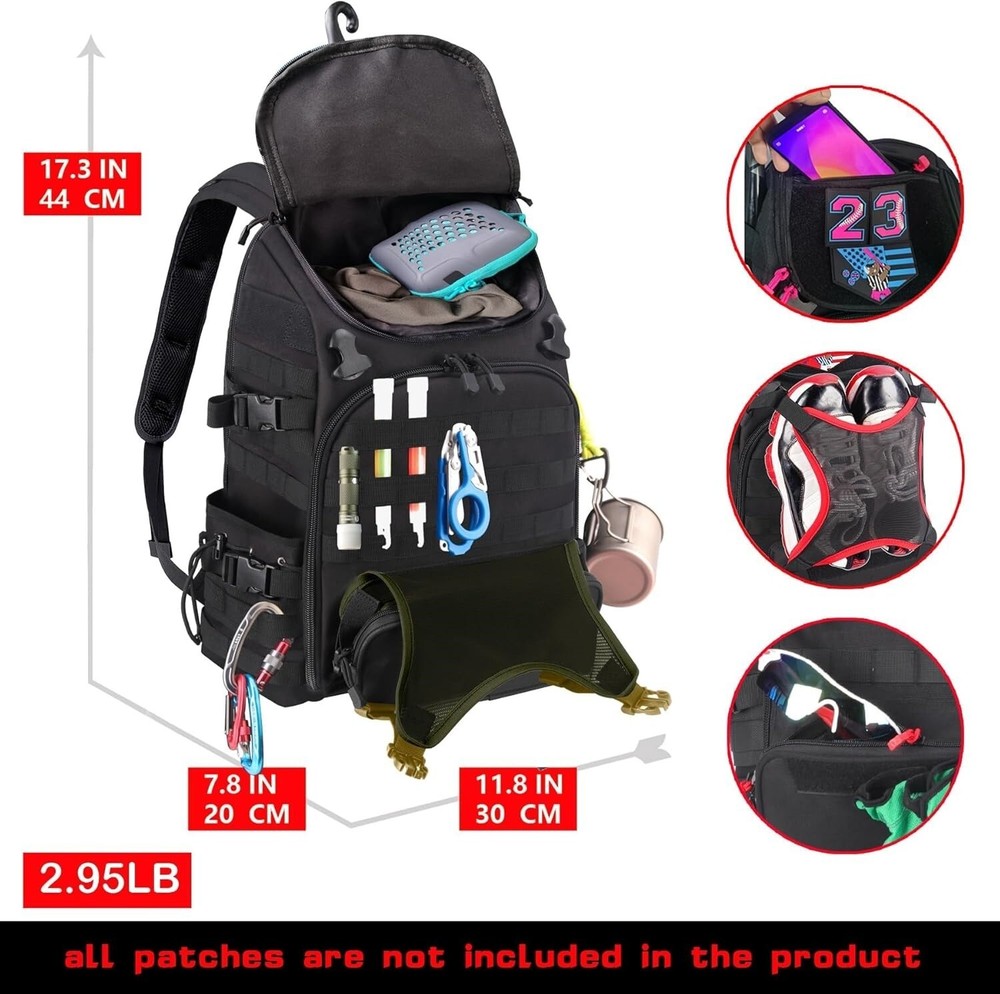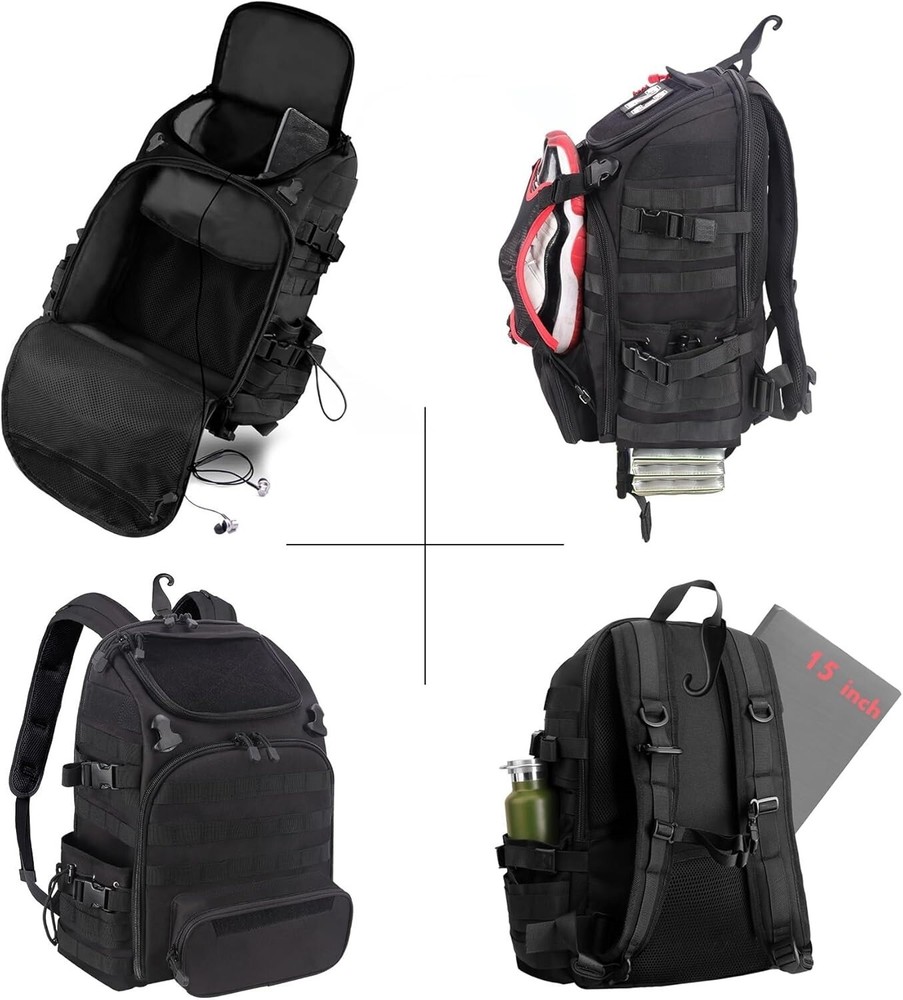 Mochila De Viaje Tactica 35L Exteriores Para Hombre Bolsa De Senderismo Acampar Adecuado para múltiples escenarios: es una mochila de emergencia con kit de 72 horas que combina funciones al aire libre y deportivas. Puede ser adecuada para actividades tácticas, escalada, senderismo, así como varios deportes de pelota como baloncesto, fútbol, béisbol, softbol, voleibol, etc. MULTIPROPÓSITO: esta mochila de trabajo tiene un bolsillo superior abierto de acceso rápido en la parte delantera para guardar la llave, el teléfono. Bolsillo principal para un balón de baloncesto de tamaño completo, balón de fútbol, voleibol, fútbol y más. El soporte para casco se puede utilizar como bolsas para zapatos. MOLLE Y EXPANDIBLE: la correa MOLLE puede colgar artículos pequeños, o para sujetar bolsas o equipos adicionales, puede adaptar el soporte del casco, la bolsa para zapatos, la bolsa médica. Dos correas laterales ajustables y el bolsillo pueden sujetar el palo o la botella de agua de forma segura. La mochila de softbol también tiene correas de compresión inferiores, puede colgar sus rodilleras, trípode o tienda de campaña. PERSONALIZACIÓN: Personalizable con parches, que incorporan un estilo militar o de béisbol personalizado. Esta mochila de asalto del ejército cuenta con un compartimento exclusivo para computadora portátil, que proporciona un almacenamiento seguro y conveniente para dispositivos electrónicos. IMPERMEABLE y SÓLIDO: Fabricado con tela Oxford 900D de alta calidad y resistente, que es impermeable, a prueba de polvo y resistente al desgaste. La base resistente y las correas de hombro ajustables garantizan la seguridad de su tabla de remo durante el transporte. TRANSPIRABLE: Cómodo de llevar, se puede usar como una mochila de asalto de 3 días, una mochila tipo bolsa de emergencia, una mochila militar, una mochila de caza, una mochila de supervivencia, una mochila de tiro, una mochila de trekking o una mochila de día para uso diario, y usar nuestra bolsa de béisbol como una mochila deportiva, una mochila de gimnasio o como una mochila para bate de béisbol y sóftbol. con acolchado de espalda y correas de hombro adecuados para reducir la presión de transporte.