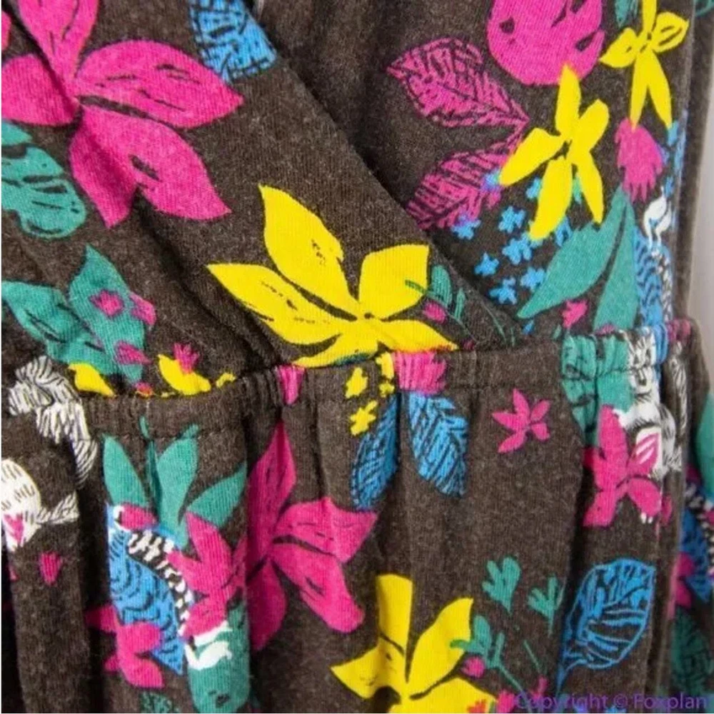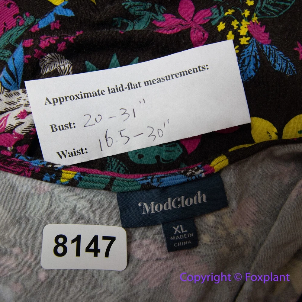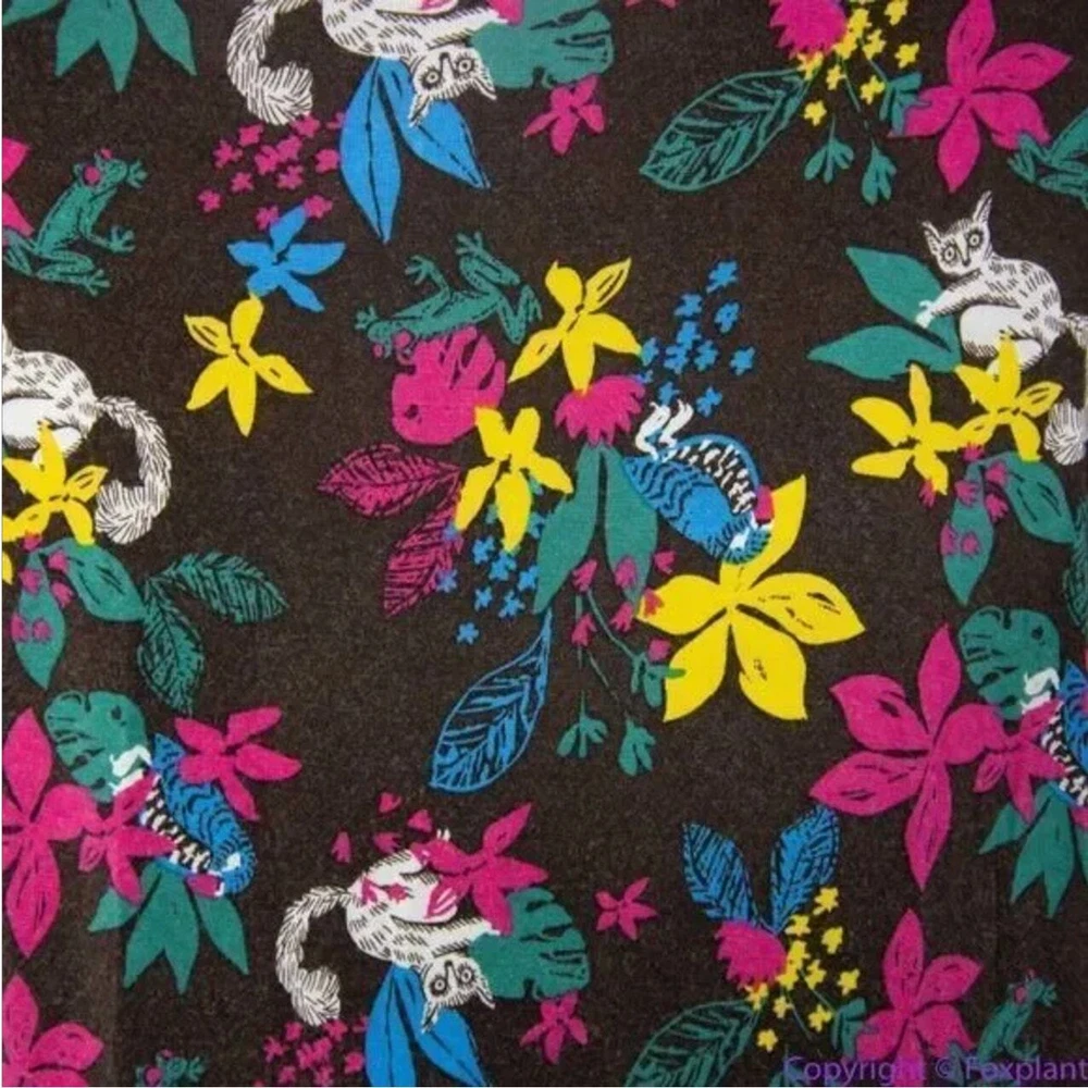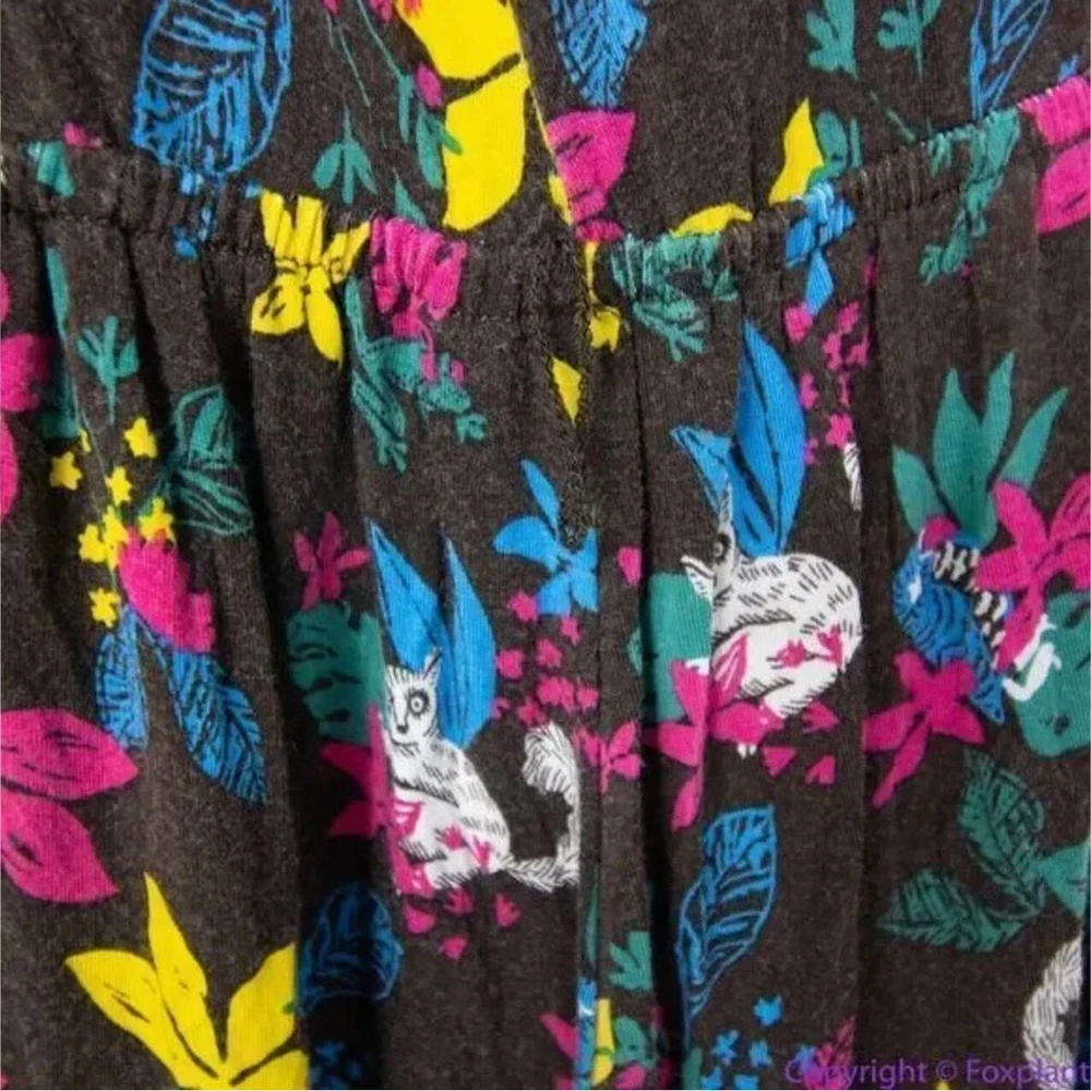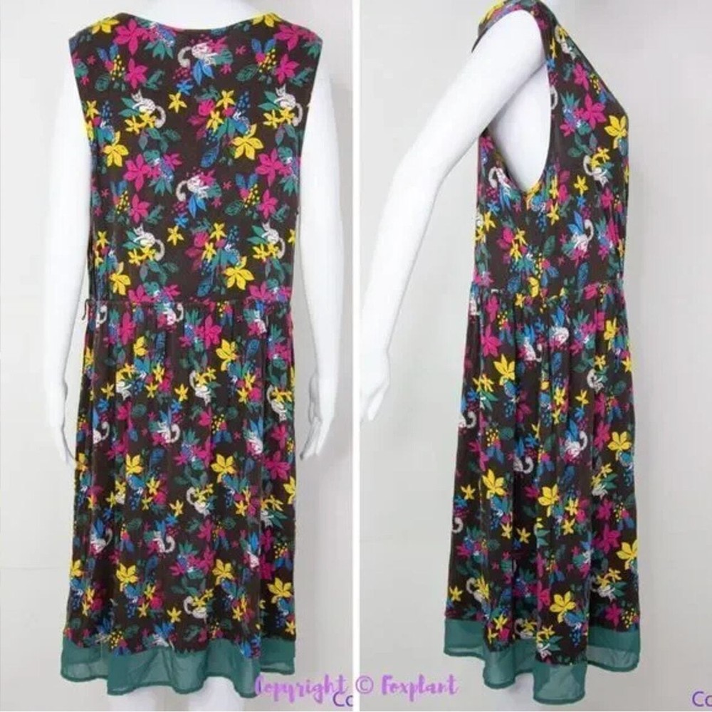 Modcloth Jungle Print Knit Dress, white cat blue bird, ring tailed lemur, XL Soft knit sleeveless dress with surplice V-neck, stretch fabric, elasticized waist , green chiffon contrast hem and sash, black with multicolored tropical floral and lemur print, unlined. You’ll smile every day that you wear this wild and whimsical ModCloth pick. Slip it on under a cardigan or blazer for the office, then wear it solo after-hours to show off the playful lemur print. Color: brown, white, blue The measurements provided are approximate and intended as a helpful reference but are not a guarantee of fit. Please review the measurements carefully and compare them to a similar garment you own before making a purchase. Actual colors may vary due to lighting conditions and monitor settings. Excellent condition with no noticeable flaws, stains, or damages.