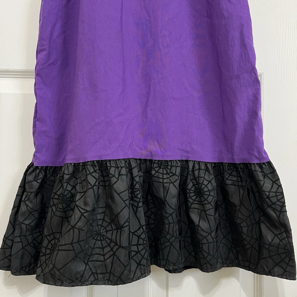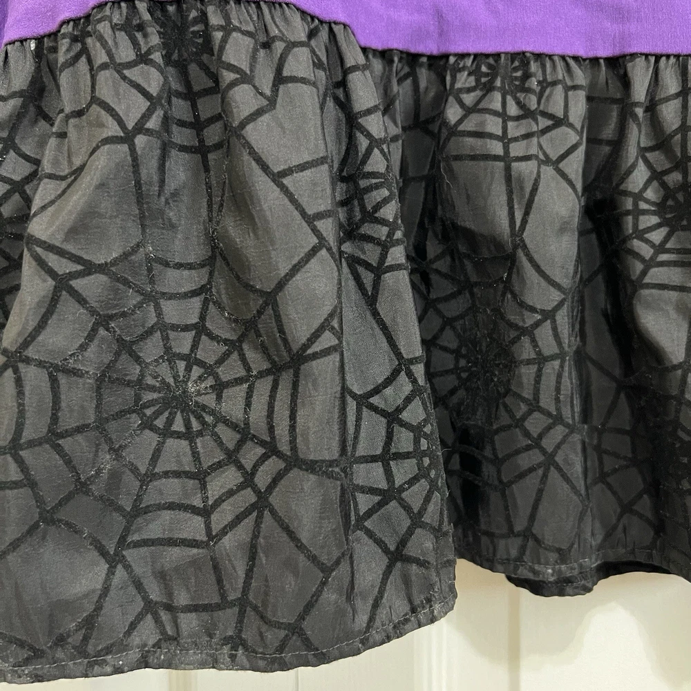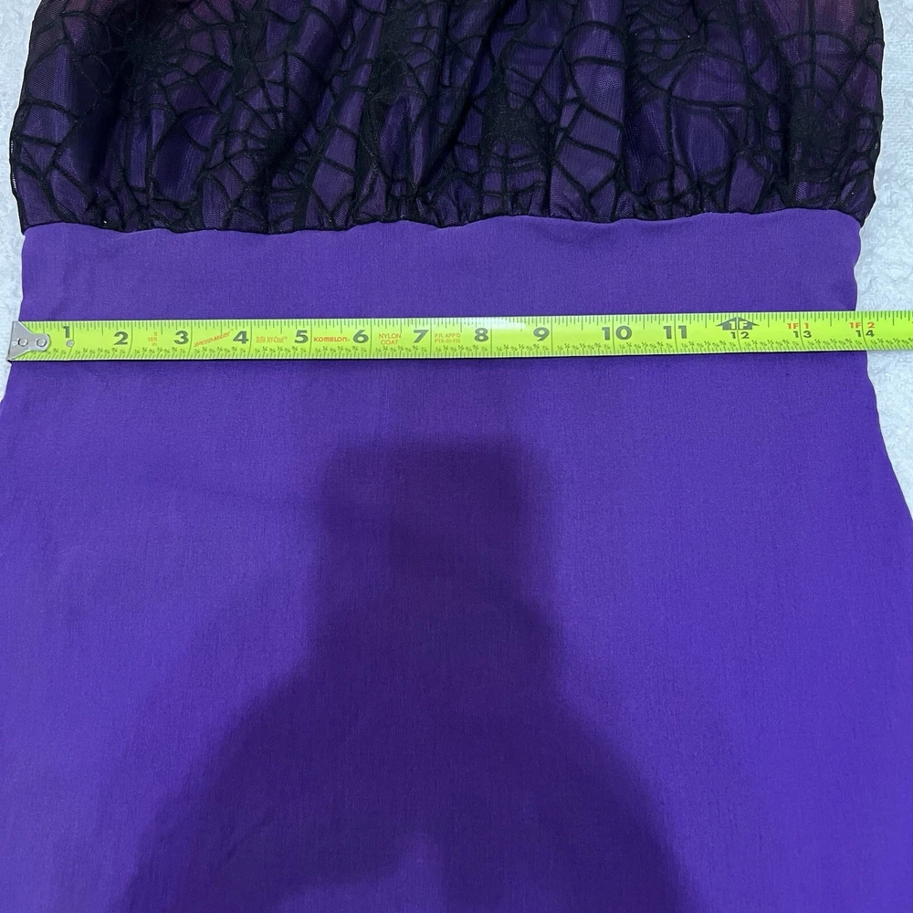 Approximate measurements: Across underarms - 16" Waist - 14" Length - 43" -pullover styling, stretchy fabric, satin fabric to the chest with mesh overlay, elastic neckline and sleeves, velvet spider web detailing to the ruffle trim -tiny spots/marks on the upper back as pictured -Made in USA Great preowned condition