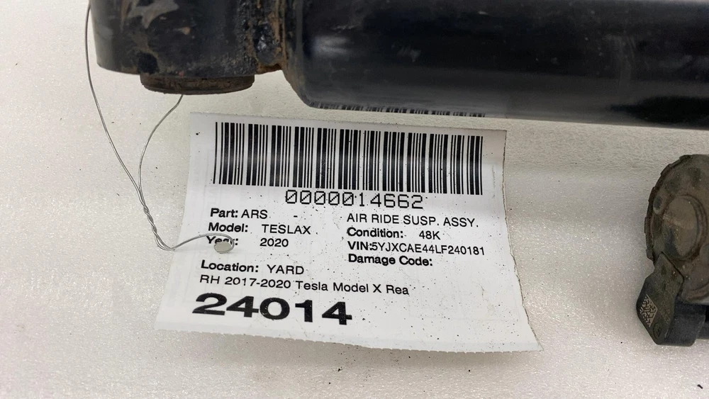 Donut Auto Dismantling Donut Auto Dismantling Rancho Cordova, CA Business Hours (PST/PDT) Mon - Fri 8am - 5pm Closed Sat & Sun AIR RIDE SUSP. ASSY. Year: 20 Model: TESLA X Side: Type: U Category: ND Condition: 48K Vehicle Stock #: 24014 Part Stock #: 0000014662 Additional notes: 2017-2020 Tesla Model X Rear Right Suspension Adaptive Air Spring Module Shock Absorber RH Assy Interchange: Also fits: Search for more parts from this donor vehicle Search for more parts for TESLA X Dear Valued Customers Examine all photos and read the description. Please contact us and ask any questions you have about the item. What you see in the pictures is what you will receive. Item are sold as Pictured in our ads, All the damages are marked in pictures with colored markings ........ indicated scratches, O indicate dents/dings view all photos and description. All Parts come with a 30-Day warranty Compatibility We are not responsible for compatibility, please order parts with the same part number to avoid delays and fitment issues in your purchase. Always verify O.E.M part numbers check fitment. Shipping & Return Policy For LTL and freight shipments of large items like Battery Packs, Seats, Doors, Trunks, Hoods, and other sizable body parts, a commercial address is mandatory . This must be a business equipped with a dock or forklift. Please note that deliveries cannot be made to restaurants, office buildings, or hotels. Please allow 5-11 business days from the shipping date to receive freight items. If a forklift is not available to unload your package, please ensure that you added liftgate service fee to your order. Residential deliveries have an extra charge required by LTL to cover liftgate usage and city ordinance. Be advised not all LTL freight companies offer lift gate services in every town especially in rural areas. If you do not have a commercial address or a proper residential address reach out to us to work things out LTL items can always be held at your local hub and made available for pickup. We offer free local pickup Monday through Friday, from 8:00 AM to 5:00 PM. What separates us from our competitors As Pioneers in the Tesla used parts market Donut Auto Parts is leading in the industry. We have been specializing in Tesla's for over 5 years. Our Staff are highly trained and experienced Tesla specialists. We strive to help you solve all your part needs. Local Customers For our local customers we provide installation on battery packs and drive units purchase. Drive unit and battery pack installations come with a 60 day warranty . All parts are fully tested. Using the industries leading tools, we also provide installation of other parts. Please reach out to us directly for more information. Be Advised Programming may be required for most electronic components. Donut Auto Parts is not responsible for any labor costs and other charges such as programming. NO RESTOCKING FEE Payment Payment must be submitted within 48 hours after purchase time. We have a Same handling time when paid by 2pm pst and 3-day handling time for LTL freight items. Feedback and Rating We always Strive to earn positive feedback. If you encounter an issue with one of our items, please contact us before leaving any feedback or opening a case give us the opportunity to solve your order issue. We strive to provide excellent customer service to ensure that everyone is satisfied, and to gain happy and returning customers! ALLOW US TO RESOLVE ISSUES BEFORE LEAVING YOUR FEEDBACK PLEASE CONTACT US FIRST Airbag Notification If the item above is an airbag, I certify this airbag is not subject to recall and will be shipped in accordance with hazmat shipping requirements . Powered by Checkmate