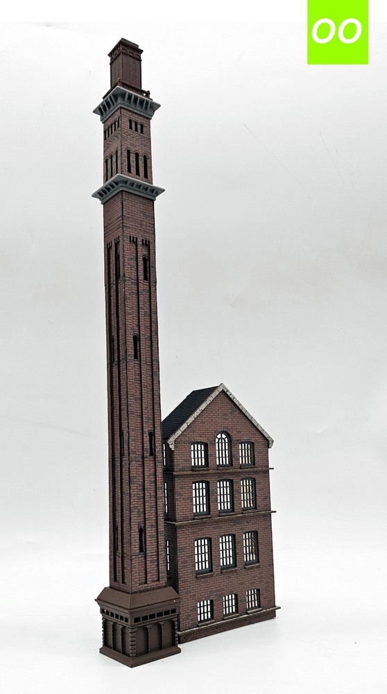 Modelux India Mill Chimney, Darw en - kit FOR THE TRUE SCALE FULL HEIGHT 870MM VERSION< PLEASE SEE OTHER LISTINGS This is produced at approx 50% scale of the massive India Mill Chimney - the actual chimney is approx 100m tall - this model is 420mm making it more appropriate for most layouts - the same model is also available at the same size for N but made with 1:150 scale brick print - this model has the correct brick print for 1:75. The base, intermediary collar and chimney top elements are all ready made out of plastic and are fully coloured as shown. The elevation elements are brick laminate at 1.3mm thick and Modelux Invisiseam, making the elevation edges virtually invisible. This chimney is sold here without the associated mill building - and the warehouse shown in one of the photos is for context only and is not included. The chimney looks great with any warehouse or mill building, especially a Modelux one... Simple to construct as the fine detail elements are all ready made... Height 420 mm Footprint 50mm x 50mm Flat pack. PVA required for assembly