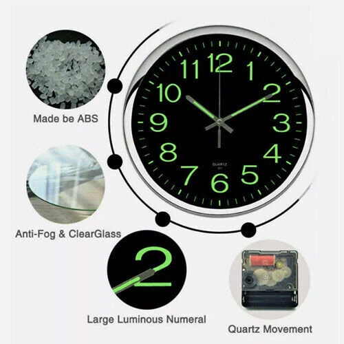 Product Description Note: Night Lights Function -- If clock receives enough sunlight at day, it will shine for first few hours at night. 12'' Modern Luminous Large Quartz Wall Clock Non-ticking Fluorescence Indoor US Night Lights Function -- If clock receives enough sunlight at day, it will shine for first few hours at night. Easy to Read – 12 inch basic dial quartz wall clock with luminous Arabic numeral analog display make it easy to see from any corner of your room. Updated quartz movements to ensure accurate time Quite Wall Clock -- Updated quartz movement, super quiet & non-ticking, Quiet sweep second hand, no ticking to ensure a good sleeping or working Classical Design -- wall clock perfect for dining rooms, living rooms, family rooms, bedrooms, study room, kitchen, office and meeting room Power Source -- Battery operated wall clock, Powered by 1 x AA battery (Not Included) Description: The 12” black background wall clock comes with night light function. Make it easy to view in night. The large display clock with precise quartz movements for accurate time; Sweep movement eliminates disturbing ticking sound. the large display wall clock will give you an accurate read on time down to the second so you don't need to second-guess yourself. Perfect decorative clock for school, kitchen, living room, bedroom, family room, meeting room, dining room, office, pool or patio - any place accurate timekeeping is needed. The silent quartz wall clock black base are made of premium plastic that can keep well function and dry in any weather condition, instead of using cardboard as clock background. It's not easy damaged in moisture and wet condition. Specifications Color : Sliver frame, black background Material: Plastic frame, Glass lens, Aluminum clock hands Number: luminous number Dimension: 12 x 12 x 1.57 in Weight: 1.0lbs Style: Modern / Classic Power Supply:1 x AA 1.5V Battery (Not included) Note Try to use ordinary Carbon Zinc battery, not Alkaline battery to avoid the abnormal display. The product might be run out of energy during a long day in the box, so I advise to let the wall clock absorb light energy (sunshine or fluorescent lamp) more than 4 hour before installation when receive the products. The light up function is basically glow in numbers, so they get dimmer as the night wears on, especially if this doesn't get enough sun or other light during the day. Packaging Includes: 1 x 12inch Quartz Wall Clock About Us Payment Shipping Returns Contact Us Based in USA, offering high quality product Pick up orders welcome here and we also offer great discount for wholesales. We only accept PayPal payment . We process and dispatch your purchase within 2 business day after payment clearance. Please contact us if you have special requirements (combination of packaging etc.). We offer free USPS or FEDEX Package as default. If you choose express post, we charge a flat rate and we Express Post, which can be delivered in 1-3 business days, depending on your location. Please contact us first when return, exchange and refund is required. Any direct return of purchased items will not be processed. Change-of-mind return can only be accepted within 7 days after purchase. All other returns can be accepted in 30 days. We will closely examine the condition of the returned items and will not issue any refund/exchange before we make sure the items are in their original neat conditions. Before leaving us neutral or negative feedback, please contact us first. We will do everything we can to give you a satisfying solution. Please don't open case via eBay or PayPal. Please don't open any return request before contact us. We do our best to resolve any issue. Leaving negative feedback and low ratings doesn't get things solved. So please talk with us and we will not let you down. About Us Based in USA, offering high quality product Pick up orders welcome here and we also offer great discount for wholesales. Payment We only accept PayPal payment . Shipping We process and dispatch your purchase within 2 business day after payment clearance. Please contact us if you have special requirements (combination of packaging etc.). We offer free USPS or FEDEX Package as default. If you choose express post, we charge a flat rate and we Express Post, which can be delivered in 1-3 business days, depending on your location. Returns Please contact us first when return, exchange and refund is required. Any direct return of purchased items will not be processed. Change-of-mind return can only be accepted within 7 days after purchase. All other returns can be accepted in 30 days. We will closely examine the condition of the returned items and will not issue any refund/exchange before we make sure the items are in their original neat conditions. Contact Us Before leaving us neutral or negative feedback, please contact us first. We will do everything we can to give you a satisfying solution. Please don't open case via eBay or PayPal. Please don't open any return request before contact us. We do our best to resolve any issue. Leaving negative feedback and low ratings doesn't get things solved. So please talk with us and we will not let you down.