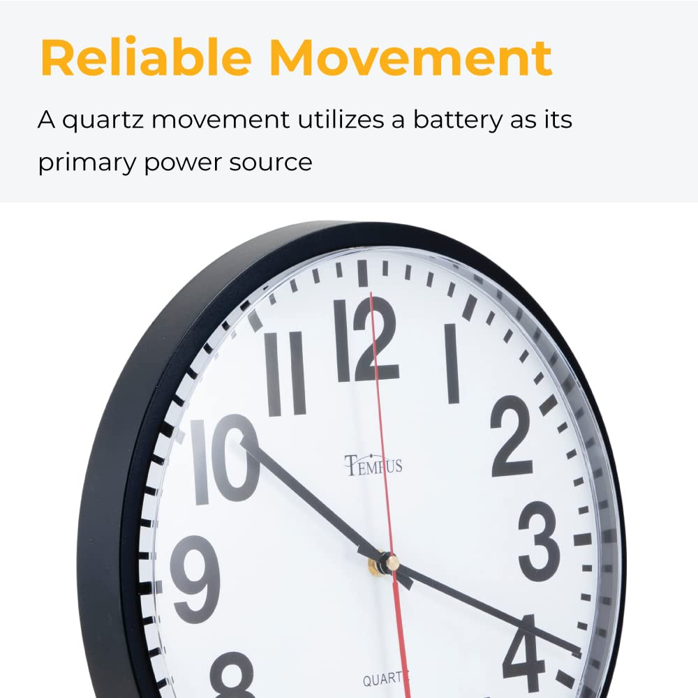 This 13" commercial style clock is ideal for large rooms and work areas. It features a sturdy black plastic frame and the large, black numerals against the white dial make the clock easy to read, even from a distance. Includes a shatter-resistant flat lens which prevents the build-up of dust on the face. This clock uses AA battery, which is not included. A MODERN CLOCK FOR ANY SPACE: This black wall clock is a stylish and functional addition to any room LARGE WALL CLOCK FOR EASY READABILITY: The bold hands and numbering make for an easy read at any distance, perfect as office or classroom decor BATTERY OPERATED WALL CLOCK: This clock is battery operated, making it easy to install and maintain. Requires 1 AA battery - not included BLACK, SILENT WALL CLOCK: It's smooth and silent hands make for a non-distracting wall feature, allowing you to focus on your work DURABLE CONSTRUCTION: Frame is over 1 inch thick and includes shatter-resistant raised lens