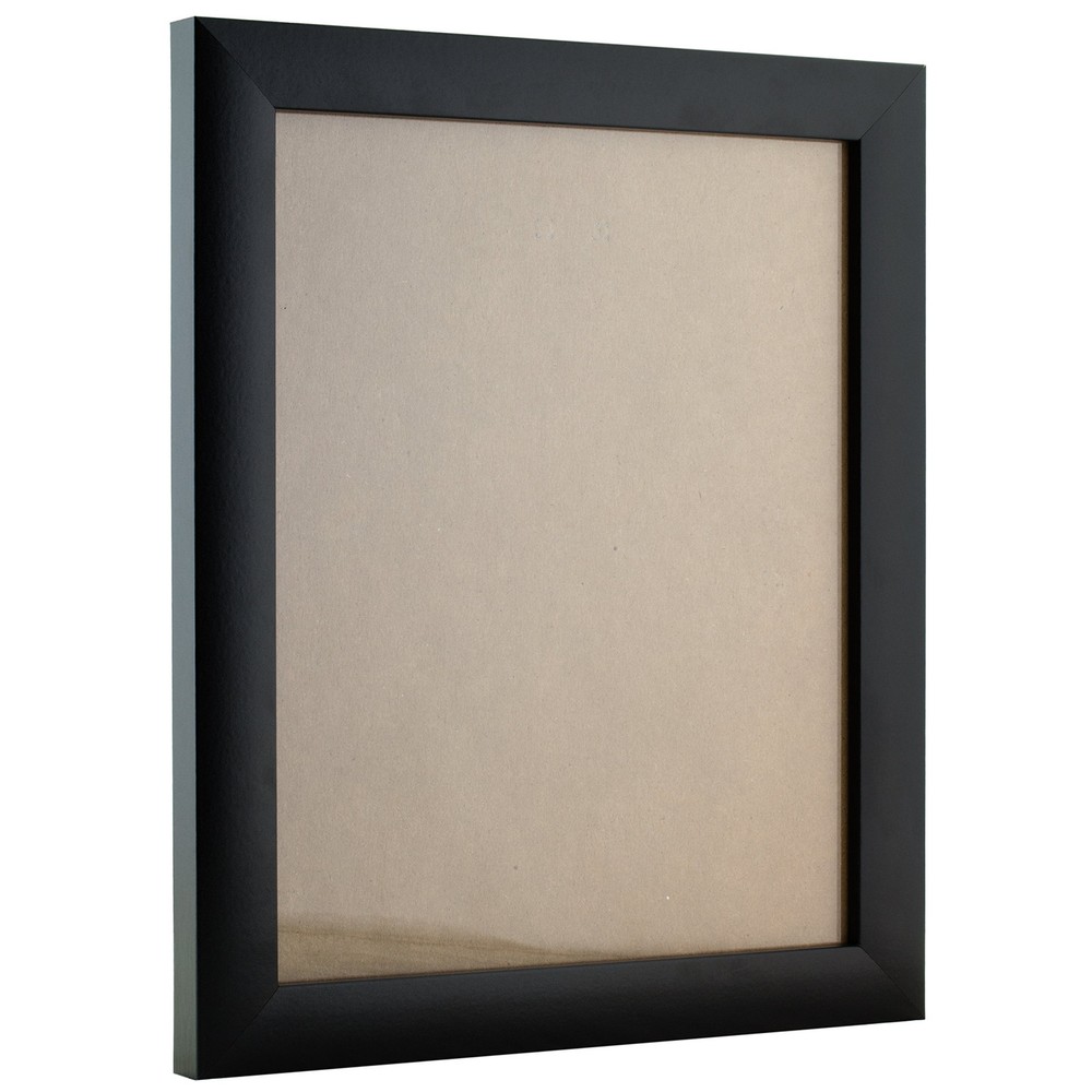 Contemporary style; black; smooth wrap finish Frame includes: clear acrylic facing, rigid cardboard backing and wire hanging hardware kit (some assembly required) Frame holds a 20 inch by 27 inch photo/print/poster (viewable area reduced by .25" on each side due to frame lip) Frame moulding is 1 inch wide; MDF wood composite Frame is designed for WALL HANGING only (hanging hardware allows for portrait or landscape orientation)