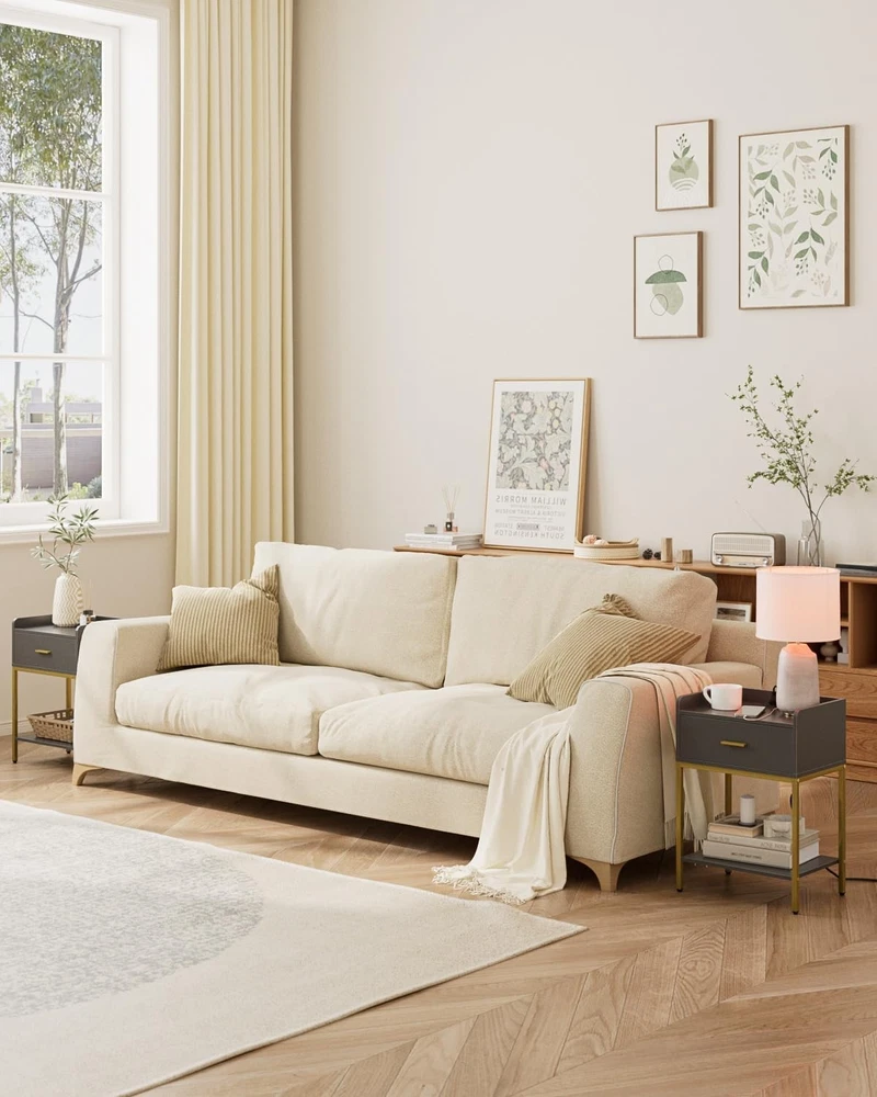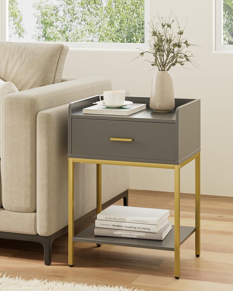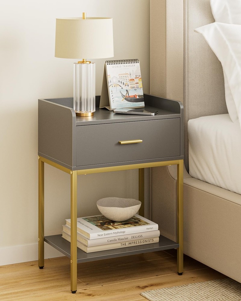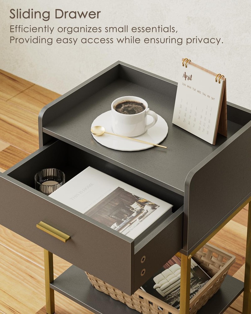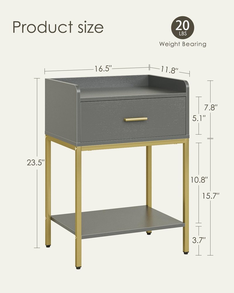 Nightstand,3-Tier Modern Bedside Table Night Stand with Storage Drawer Grey Product Details Brand: Acodaiuy Product Dimensions: 11.81"D x 16.54"W x 23.62"H Maximum Weight Recommendation: 50 Pounds Color: Grey Table design: Nightstand Item WeightFrame Material: 17.2 PoundsMetal Top Material TypeShape: Engineered WoodRectangular Great for Small Spaces: Though compact, this nightstand offers ample storage with one drawer and an open shelf below. It's ideal for keeping remote controls, glasses, medications, and other essentials within easy reach, making it a perfect choice for small spaces. Versatile Use: Measuring 15.8" W x 11.8" D x 20.5" H (40 x 30 x 52 cm), this table fits comfortably beside most beds, chairs, and sofas. It’s not only a nightstand but can also be used as a bed side table, coffee table, or snack table, adapting to a variety of needs. Built-in Power Outlet: Equipped with a built-in power outlet, this nightstand makes it easy to charge your phone, tablet, and other devices, keeping cords organized and your bedroom tidy. Safe, Durable, and Easy to Assemble: Constructed from high-quality MDF board and sturdy gold metal legs, this small bedside table is built to last. Anti-slip rubber pads on the bottom protect your floors from scratches and reduce noise when moved. All parts are numbered, allowing for easy assembly and maintenance.