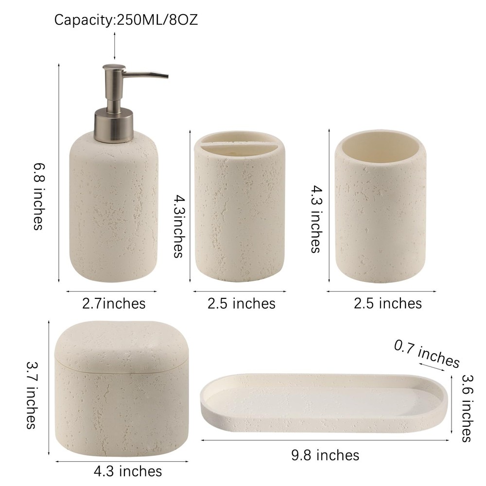 Haocoott Bathroom Accessories Set, 5PCS Modern Bathroom Accessory Set with Soap Dispenser, Mouthwash Cup & Toothbrush Holder, Qtip Holder, Tray 【5 Piece Bathroom Accessory Set for Your Daily Needs】 Includes 1 x soap dispenser ( 250ml / 8oz ), 1 x toothbrush holder, 1 x qtip holder and 1 x mouthwash cup, 1 x tray. Our modern bathroom accessories set keeps the bathroom organized elements that complement your bathroom perfectly, adding a fashion feel to your bathroom. This bathroom accessory set essential is ideal for your bathroom and many more. 【Sturdy and Safe Material】Our boho bathroom sets accessories is made of premium resin,easy to clean,sturdy and durble,not the cheap plastic,make your bathroom out of the ordinary. It's a perfect gifts for christmas, new year, thanksgiving day birthday and so on. 【Versatile & Functional】Fits in large or smaller bathrooms. Use all the pieces together in master or family bathrooms or use pieces separately for half and smaller guest bathrooms. Can be placed in the kitchen, laundry room or next to any sink. Organize and enhance your bathroom quickly and effortlessly with this bathroom set and perfect to free space on your vanity top, countertop, or makeup table. 【Soap Dispenser & Toothbrush Holder】The pump head is coated stainless steel paint, prevent rust and corrosion, the soap dispenser is perfect for liquid hand soap, dish soap, lotion, hand sanitizer, etc. The toothbrush holder is simple and compact, fit most toothbrushes. 【Vanity Tray & Bathroom Tumbler 】The bathroom vanity tray measures 9.8 x 3.6 x 0.7 inches, looks cute to sit on your counter, to hold your soap dispenser, perfume bottle, candle, jewelry, car key or other small things. And the bathroom tumbler fits greatly for your toothpaste, razor, makeup brushes, pens, pencils and more. 【Qtip Holder Dispenser】Comes with cotton swab holder, sleek and cute, complement your bathroom vanity decor; Staorage Box could hold your qtips, cotton swabs, cotton balls, cotton pads, floss, hair band and more 【Easy Care and Awesome Gift】The soap dish and toothbrush holder set easy to clean, wipe it with a soft cloth or just rinse it with water. Tasteful choice for your friends, family, lover, partner or parents. Gorgeous housewarming, wedding, or holiday gift. 【Safety Package & 100% Service Satisfaction】The bathroom accessories set is safety package,No worry about receiving break item,perfect for wedding, housewarming/new home gift,mother’s day gift.Any questions or dissatisfaction,contact us,we’ll provide you with a satisfaction solution. SHIPPING Domestic Buyers - We have confidence in our products, but if you are not fully satisfied please contact us within 30 days of purchase and you will get full refund. - We ship within 3 business days of payment, usually sooner - We offer FREE shipping on all orders! - We only ship to the lower 48 states, no APO/FPO addresses or PO Boxes allowed International buyers – please note: Import duties, taxes, and charges aren't included in the item price or postage cost. These charges are the buyer's responsibility. - Please check with your country's customs office to determine what these additional costs will be prior to bidding or buying. * Order Cancellation Policy ** You can return a product for up to 30 days from the date you purchased it. 1. The seller reserves the right to cancel the special case only due to eBay cancellation fee. 2. The decision of seller is the final. 3. The seller will respond to the cancellation request within 2 business days. Please wait for the result of cancellation. 4. In case the cancellation is not completed by some reasons, the buyer can follow the options below to get the refund. 4.1 The buyer can reject the item when it arrives. 4.2 The buyer can send the item back to the seller within 30 days If the buyer receives item (USA Shipment ONLY). The seller will provide the FREE return label to the buyer when the buyer opens " Return Item" case on eBay by using the reason as "Change my mind" ONLY. 5. When buyer has placed the order. The order will be processed and completed by automatic warehouse system within 5 minutes. In case that buyer sends the cancellation request after 5 minutes of placing the order, the request will be rejected. **Sending direct message to cancel the order is not allowed for every case.* Return Policy For the return case - If buyer would like to return the items for refund or replacement, please CONTACT SELLER to receive the free return label from seller. The refund or replacement will be processed with the tracking number of return label which is provided by seller only. The other ways of return which are not approved by seller will not be processed for the refund or replacement.