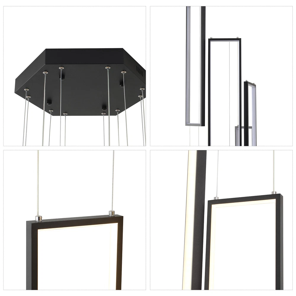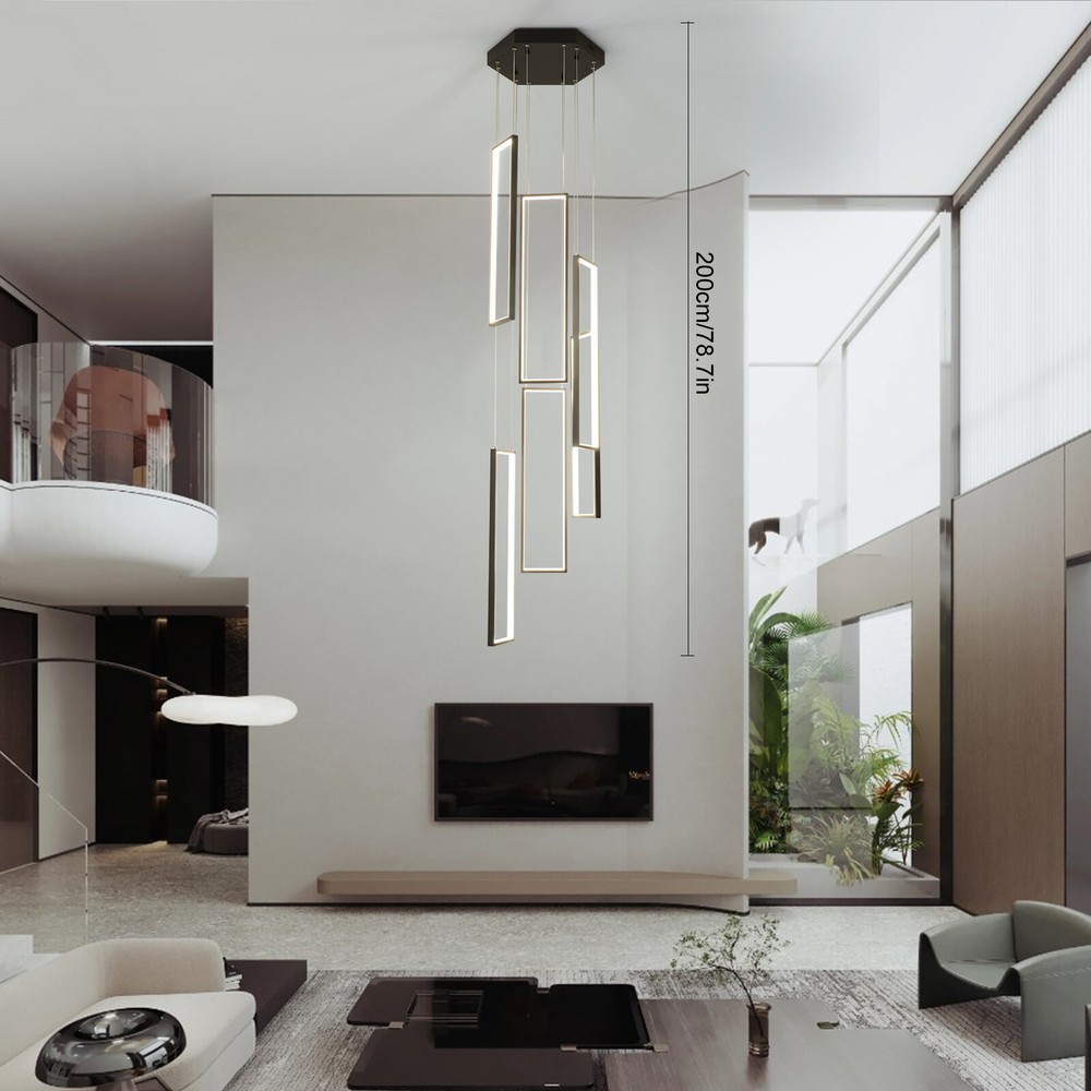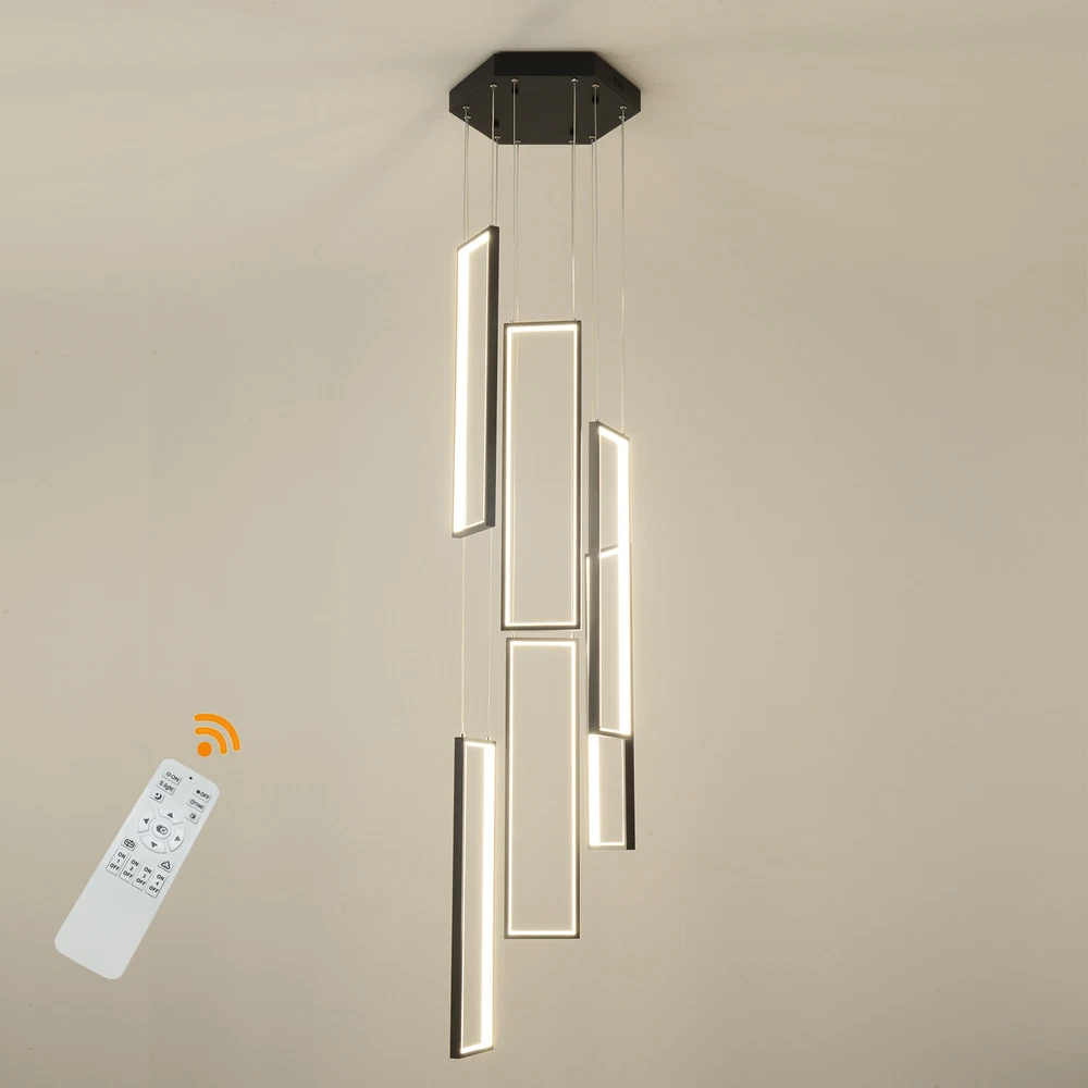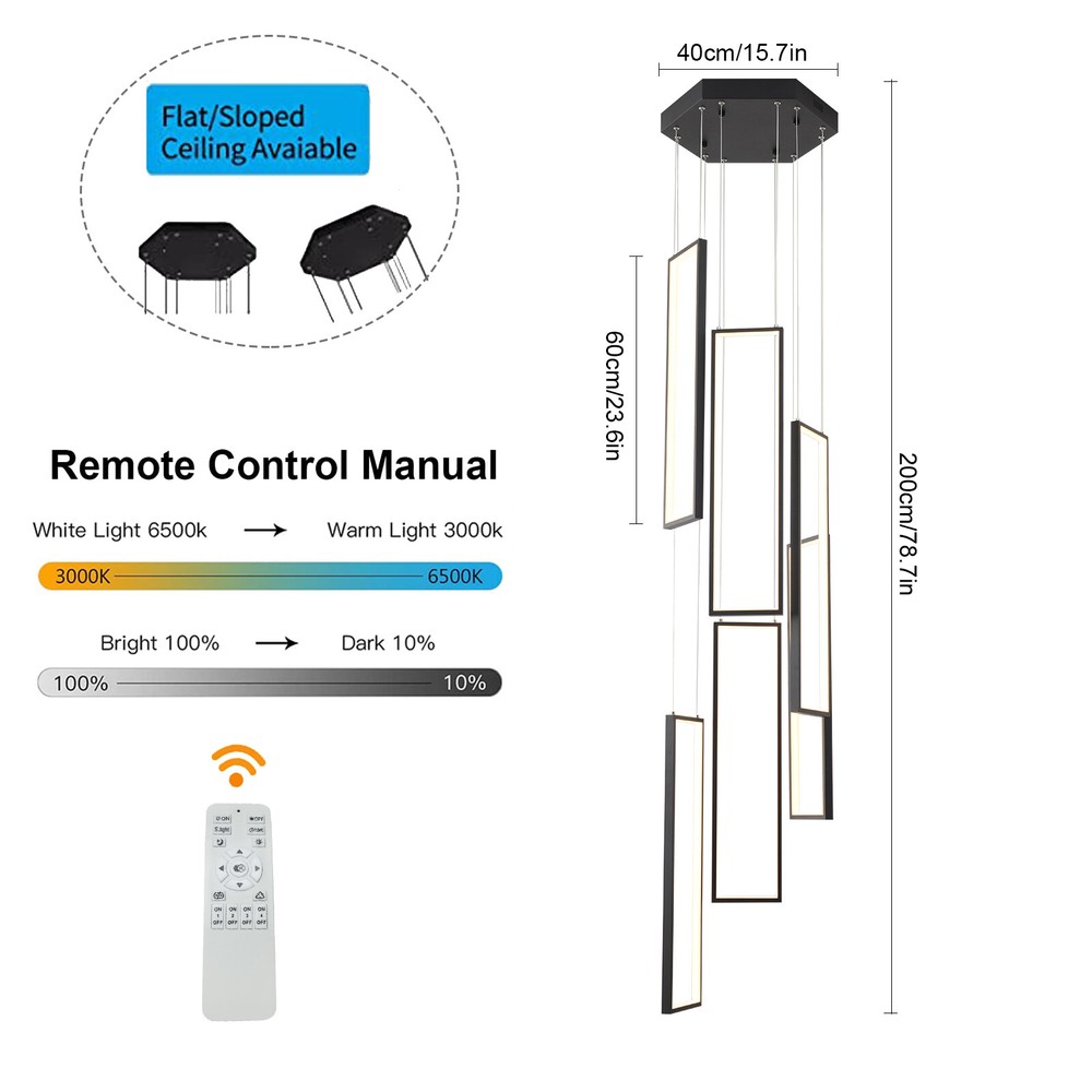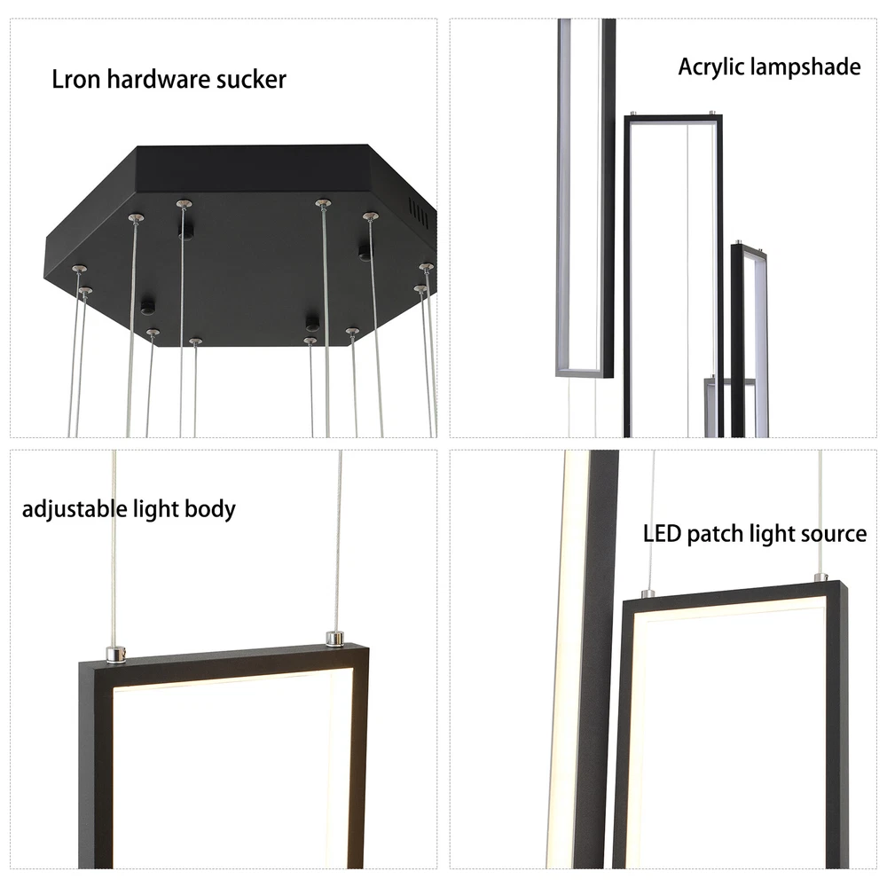 Details Round Base: The large round base(15.7*2inch) increases stress area, and can make the item fixed firm without falling easily. Clear Circuit: The separation of power cord and steel wire not only prevents wire entanglement but also makes it more aesthetically pleasing. Application With a suitable area of 61.46-322.92ft² and a floor height of 9.84-13.12ft is very suitable for residential and commercial lighting, living rooms, restaurants, entrances, attics, villas, wedding halls, foyers, banquet corridors, kitchens, hotel lobbies, and will become the focal point of your home. In addition, it is also suitable for installation on sloping circular and arched ceilings. Package Included 1* 6 Rectangle LED Chandelier 1* Remote Control 1* English Instruction All Accessories for Assembly Modern Chandelier Pendant Lamp Raindrop LED Living Room Ceiling Light 6 LED Modern Led Chandelier Lighting, Dimmable with Remote Control 10 Rings Black Pendant Light Adjustable Height Hanging Ceiling Light Fixture,for Staircase Foyer High Ceiling Living Room Description Bright light can bring charm and warmth to your room, and light up your life. Made of premium aluminum and silica gel, this 6 rectangle LED chandelier is strong and durable. It can create bright light to brighten your life and will be a great addition to your house. Key Features Long Service Life: The aluminum and silica gel have high strength, good toughness, and good formability and the high-temperature baking paint process make it waterproof, rust-proof, and corrosion-resistant, so you can use it for a long time without frequent replacement. Safety Guard: The multiple heat dissipation holes on the base and wide voltage (95-260V) design can effectively ensure safety and extend product life, so you can use it with confidence. Excellent Light Source: The environment-friendly and energy-saving LED light with high color index can effectively avoid glare and stroboscopic, protect your eyes, restore the most authentic color of objects, serve an area of 161.46-322.92ft², and save your costs. Carefully Designed: The infinitely adjustable brightness and three types of lighting (warm, natural, and cold) fully meet your usage needs in different scenarios, making it more convenient. Embrace Smart Life: Applied with remote control, you can easily adjust the light colors while lying in bed and don't need to get up and press the switch, bringing more convenience to your life. Adjustable Design: You can easily adjust the hanging wire of the 6 rectangle, which can be adjusted from 0-6.65ft to adapt to different ceiling heights, meet your different needs, and create your own unique lighting. In addition, you can also freely adjust 6 rectangle through the cable locking pin to obtain different shapes and make your fixture decoration never outdated. Stylish Appearance: The atmospheric and stable black color paired with different sizes of circles makes it fashionable and minimalist, perfectly integrating different home decoration styles, enhancing taste, and becoming an eye-catching decoration.6 Rectangle drop down from the ceiling plate, just like bubbles, adding some elegant and stylish. Excellent Gift: The beautiful appearance and good practicality make it a great gift for parents, friends, and lovers on birthdays and holidays. Easy Clean-up: The simple structure and smooth surface provided by high-quality materials and craftsmanship let you easily wipe it clean with a towel When dust accumulates. Protective Packaging: The foam can effectively reduce the impact and ensure that this item is fully delivered to you to the greatest extent. Guaranteed Customer Service: We aim to provide quality products and services. If you have problems, please feel free to contact us. We will reply and solve the problem for you as soon as possible. Details Round Base: The large round base(15.7*2inch) increases stress area, and can make the item fixed firm without falling easily. Clear Circuit: The separation of power cord and steel wire not only prevents wire entanglement but also makes it more aesthetically pleasing. Application With a suitable area of 61.46-322.92ft² and a floor height of 9.84-13.12ft is very suitable for residential and commercial lighting, living rooms, restaurants, entrances, attics, villas, wedding halls, foyers, banquet corridors, stairs, kitchens, restaurants, hotel lobbies, and will become the focal point of your home. In addition, it is also suitable for installation on sloping circular and arched ceilings. Specification Color: Black Material: Aluminium, Silica Gel, Steel Style: Modern Light Fixture Form: Chandelier Specific Uses For Product: Indoor Use Only Current: DC Control Method: Remote Battery Type: 2*AAA Batteries(Not Included) Light Source Type: LED Brightness: Infinitely Adjustable Light Color: Cool Light, Neutral Light, Warm light Surface Treatment: High-temperature Baking Paint Shape: Rectangle Lighting Method: Adjustable Assembly Required: Yes Switch Installation Type: Ceiling Mount Color Temperature Range: 3000K-6500K Voltage: AC 95-260 Volts Number of Rings: 6 Number of Items: 1 Efficiency: E Wattage: 90W Luminous Flux: 90lumen Base Size(D*H): 40*5cm/15.7*2in Adjustable Height Range: 0-2m/0-6.65ft Suitable Floor Height: 3-4m/9.84-13.12ft Applicable Area: About 15-30m²/161.46-322.92ft² Height(Max): 78.7'' Rectangle Diameter: 60cm/23.6in Package Included 1* 6 Rectangle LED Chandelier 1* Remote Control 1* English Instruction All Accessories for Assembly Notes The battery in the remote control is not equipped. Please prepare two AAA batteries yourself. Please check the dimensions of the product before ordering to ensure it fits your home. Please ensure that all screws are tightened into the ceiling. For a safe and secure installation, please ensure that the electrical box is firmly mounted and properly attached to a structural part of the building. Please make sure that all wires are connected. When unpacking, be careful not to pull wit