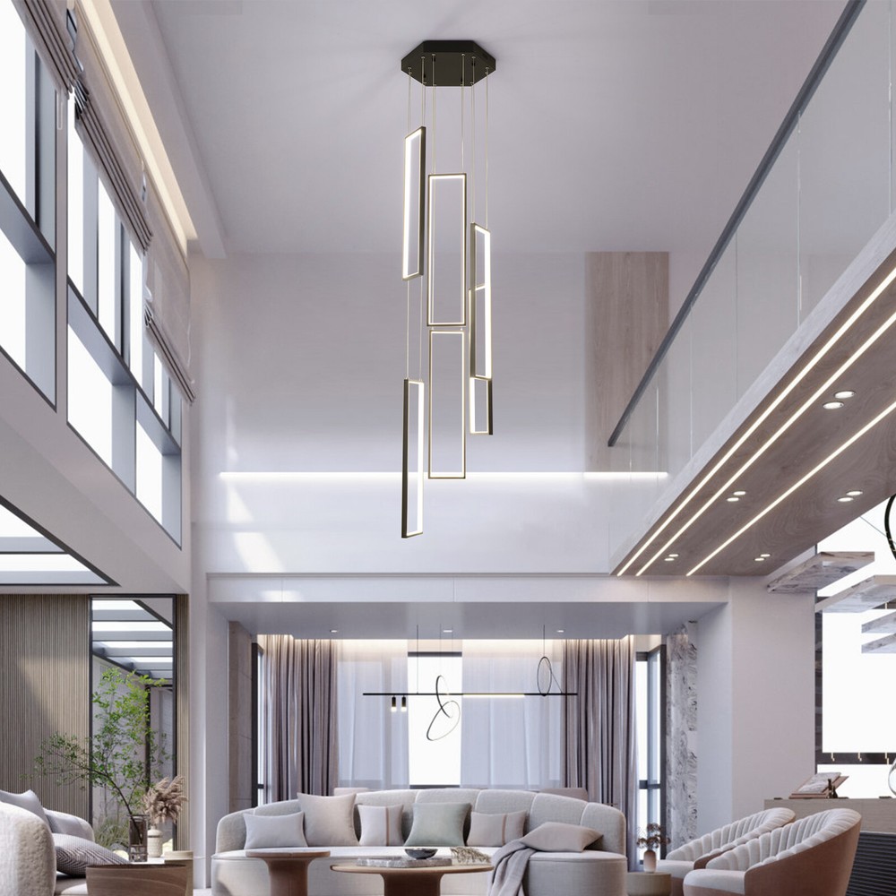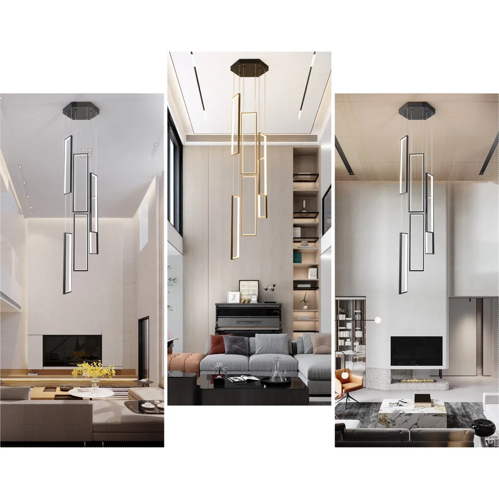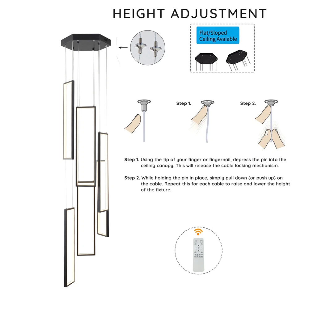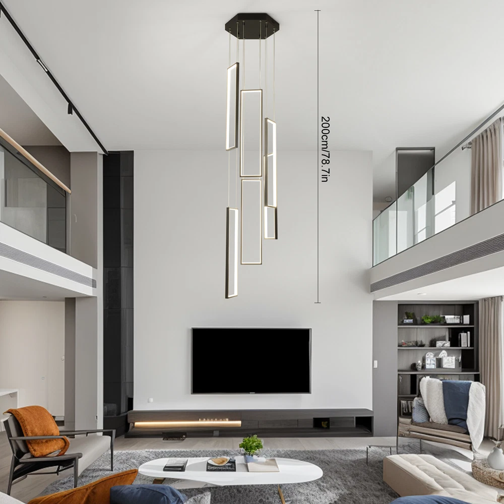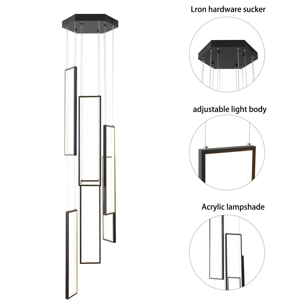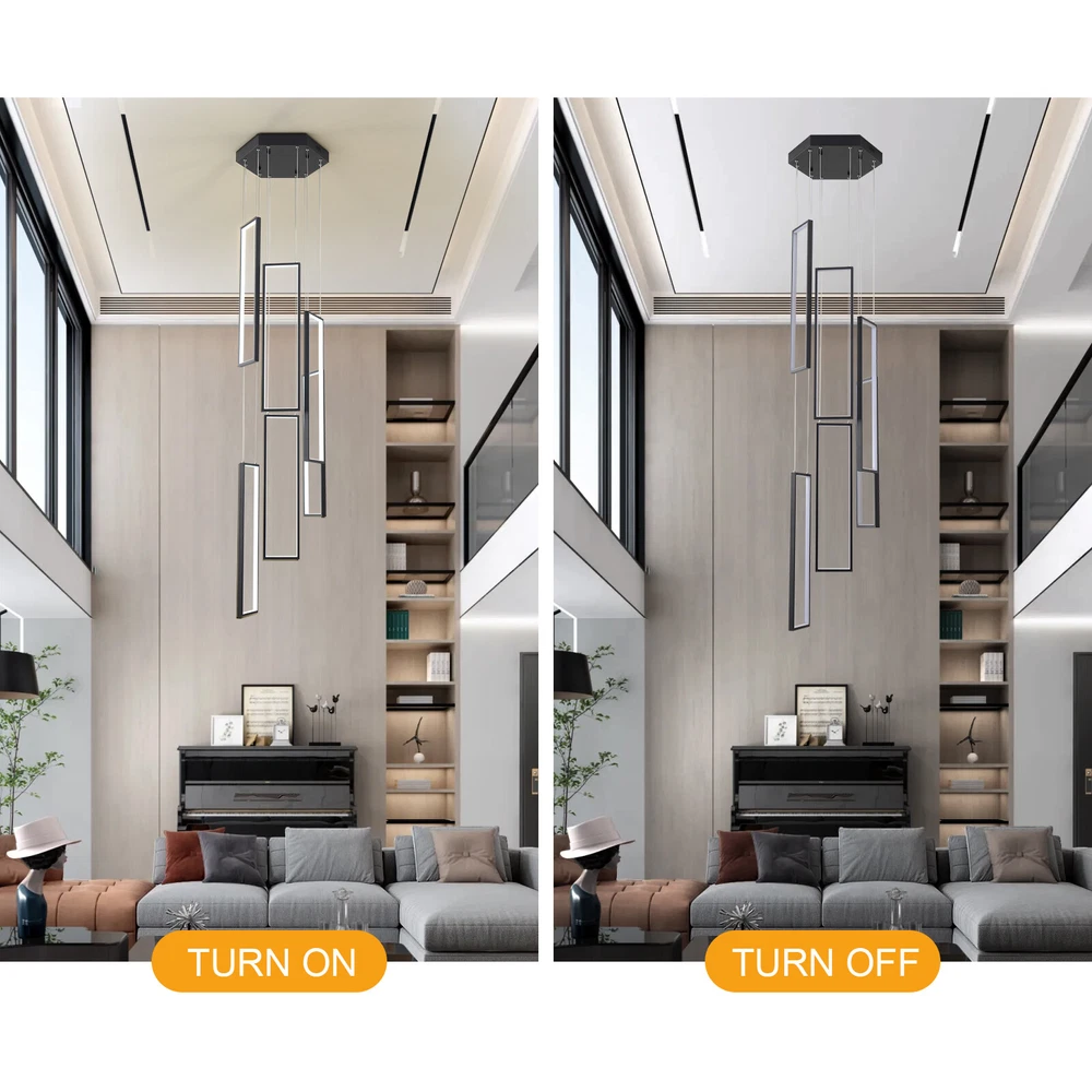 Details Round Base: The large round base(15.7*2inch) increases stress area, and can make the item fixed firm without falling easily. Clear Circuit: The separation of power cord and steel wire not only prevents wire entanglement but also makes it more aesthetically pleasing. Application With a suitable area of 61.46-322.92ft² and a floor height of 9.84-13.12ft is very suitable for residential and commercial lighting, living rooms, restaurants, entrances, attics, villas, wedding halls, foyers, banquet corridors, kitchens, hotel lobbies, and will become the focal point of your home. In addition, it is also suitable for installation on sloping circular and arched ceilings. Package Included 1* 6 Rectangle LED Chandelier 1* Remote Control 1* English Instruction All Accessories for Assembly Modern Chandelier Pendant Lamp Raindrop LED Living Room Ceiling Light 6 LED Modern Led Chandelier Lighting, Dimmable with Remote Control 10 Rings Black Pendant Light Adjustable Height Hanging Ceiling Light Fixture,for Staircase Foyer High Ceiling Living Room Description Bright light can bring charm and warmth to your room, and light up your life. Made of premium aluminum and silica gel, this 6 rectangle LED chandelier is strong and durable. It can create bright light to brighten your life and will be a great addition to your house. Key Features Long Service Life: The aluminum and silica gel have high strength, good toughness, and good formability and the high-temperature baking paint process make it waterproof, rust-proof, and corrosion-resistant, so you can use it for a long time without frequent replacement. Safety Guard: The multiple heat dissipation holes on the base and wide voltage (95-260V) design can effectively ensure safety and extend product life, so you can use it with confidence. Excellent Light Source: The environment-friendly and energy-saving LED light with high color index can effectively avoid glare and stroboscopic, protect your eyes, restore the most authentic color of objects, serve an area of 161.46-322.92ft², and save your costs. Carefully Designed: The infinitely adjustable brightness and three types of lighting (warm, natural, and cold) fully meet your usage needs in different scenarios, making it more convenient. Embrace Smart Life: Applied with remote control, you can easily adjust the light colors while lying in bed and don't need to get up and press the switch, bringing more convenience to your life. Adjustable Design: You can easily adjust the hanging wire of the 6 rectangle, which can be adjusted from 0-6.65ft to adapt to different ceiling heights, meet your different needs, and create your own unique lighting. In addition, you can also freely adjust 6 rectangle through the cable locking pin to obtain different shapes and make your fixture decoration never outdated. Stylish Appearance: The atmospheric and stable black color paired with different sizes of circles makes it fashionable and minimalist, perfectly integrating different home decoration styles, enhancing taste, and becoming an eye-catching decoration.6 Rectangle drop down from the ceiling plate, just like bubbles, adding some elegant and stylish. Excellent Gift: The beautiful appearance and good practicality make it a great gift for parents, friends, and lovers on birthdays and holidays. Easy Clean-up: The simple structure and smooth surface provided by high-quality materials and craftsmanship let you easily wipe it clean with a towel When dust accumulates. Protective Packaging: The foam can effectively reduce the impact and ensure that this item is fully delivered to you to the greatest extent. Guaranteed Customer Service: We aim to provide quality products and services. If you have problems, please feel free to contact us. We will reply and solve the problem for you as soon as possible. Details Round Base: The large round base(15.7*2inch) increases stress area, and can make the item fixed firm without falling easily. Clear Circuit: The separation of power cord and steel wire not only prevents wire entanglement but also makes it more aesthetically pleasing. Application With a suitable area of 61.46-322.92ft² and a floor height of 9.84-13.12ft is very suitable for residential and commercial lighting, living rooms, restaurants, entrances, attics, villas, wedding halls, foyers, banquet corridors, stairs, kitchens, restaurants, hotel lobbies, and will become the focal point of your home. In addition, it is also suitable for installation on sloping circular and arched ceilings. Specification Color: Black Material: Aluminium, Silica Gel, Steel Style: Modern Light Fixture Form: Chandelier Specific Uses For Product: Indoor Use Only Current: DC Control Method: Remote Battery Type: 2*AAA Batteries(Not Included) Light Source Type: LED Brightness: Infinitely Adjustable Light Color: Cool Light, Neutral Light, Warm light Surface Treatment: High-temperature Baking Paint Shape: Rectangle Lighting Method: Adjustable Assembly Required: Yes Switch Installation Type: Ceiling Mount Color Temperature Range: 3000K-6500K Voltage: AC 95-260 Volts Number of Rings: 6 Number of Items: 1 Efficiency: E Wattage: 90W Luminous Flux: 90lumen Base Size(D*H): 40*5cm/15.7*2in Adjustable Height Range: 0-2m/0-6.65ft Suitable Floor Height: 3-4m/9.84-13.12ft Applicable Area: About 15-30m²/161.46-322.92ft² Height(Max): 78.7'' Rectangle Diameter: 60cm/23.6in Package Included 1* 6 Rectangle LED Chandelier 1* Remote Control 1* English Instruction All Accessories for Assembly Notes The battery in the remote control is not equipped. Please prepare two AAA batteries yourself. Please check the dimensions of the product before ordering to ensure it fits your home. Please ensure that all screws are tightened into the ceiling. For a safe and secure installation, please ensure that the electrical box is firmly mounted and properly attached to a structural part of the building. Please make sure that all wires are connected. When unpacking, be careful not to pull wit