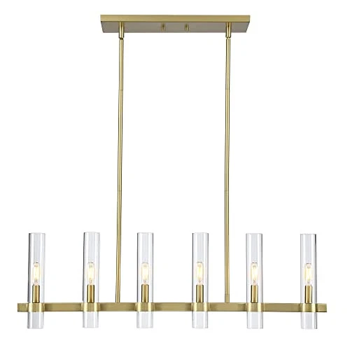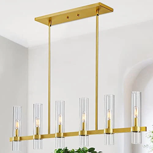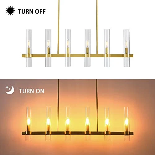 Return Policy Fast Delivery Trusted seller Modern 6-Light Linear Chandelier, 36" Gold Kitchen Island Pendant Lighting with Clear Glass Shade Farmhouse Rectangle Dining Room Lighting Adjustable Height Linear Island Pendant Light Product Description Modern & Farmhouse Design: The streamlined rectangular design of this gold linear kitchen island lighting makes the whole look simple and versatile. Our candle style kitchen island lighting with gold finish are commonly used as general lighting in kitchen island, dining room, foyer. This linear chandelier is bright enough to illuminate the whole space well Fully Dimmable & Bulbs Requirment: Each gold ceiling hanging pendant lighting needed six E12 bulbs(bulbs NOT included). Max 60W for each bulb, emits warm light to create a romantic and warm atmosp for the scene.This gold chandelier is fully dimmable when used with a dimmer bulb and compatible dimmer switch Height Adjustable: The 6-light industrial modern ceiling light includes three 12”, one 6” and one 3” stems for an adjustable hanging height. Maximum height can be adjusted to 51" and minimum to 18". You can adjust the length according to your preference Easy to Install: Our gold glass chandelier have full details instructions sheets, use simple KD(knocked down) packing. You will easily install this dining room light fixture, just need to connect the metal rods and install the glass tube on the light body, it only takes a few minutes to get a complete light. Save your time and be happy to enjoy your new decoration Customer Service: Comes with detailed instructions and hardware accessories for quick and easy installation. proudly 100% stand behind all of our product and professional after-sales support. If you have any questions, please contact us, we will give you a satisfactory solution Shipping Returns Payment Shipping Shipping is FREE to all addresses other than APO/PO boxes in the lower 48 states. All our stock ships from US-based warehouses. Shipped via USPS or UPS (depending on location and package weight) Unless stated otherwise, all orders will ship within 24-72 hours of your payment being processed. Check our feedback to see the great reviews of FAST shipping we offer. Returns Seller does not accept returns Payment We currently accept payment via eBay managed payments only. Once payment is cleared, we will dispatch your shipment within 1-3 business days. Please refer to the "Shipping" tab for more information regarding shipping speed to your destination.