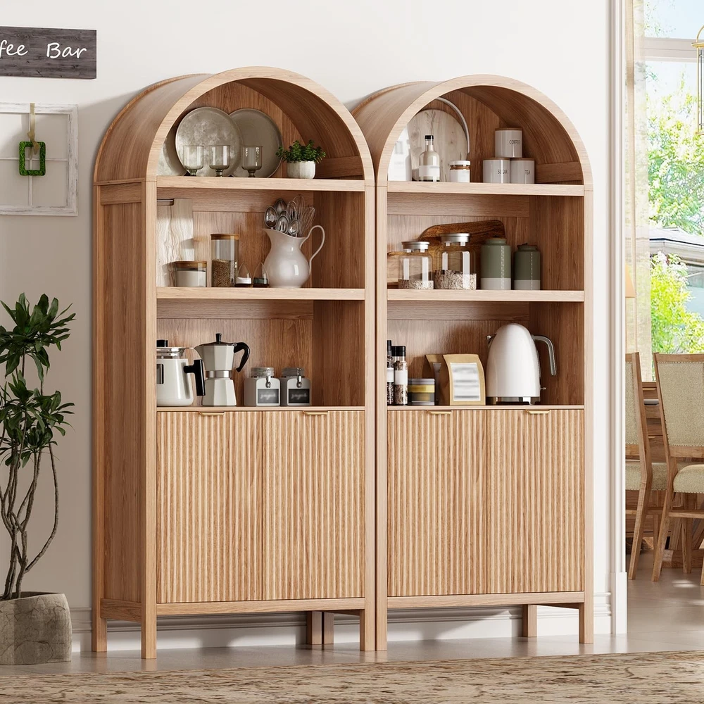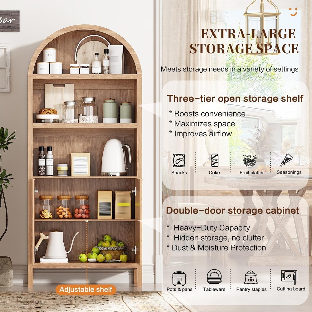 【Sturdy Construction & Scratch-Resistant】This versatile dining cabinet combines durability and style, featuring a reinforced MDF wooden frame and a sturdy build. Measuring 71.26"H × 30.7"W × 15.35"D, it fits seamlessly into kitchens, dining rooms, or living rooms. The elegant arched panels add a modern farmhouse charm while providing ample vertical storage space. Finished with a scratch-resistant surface, this cabinet is not only beautiful but also practical. It serves as both an efficient organizational hub and an attractive focal point in your home. 【Arched Design for Timeless Elegance】The beautifully arched design of this cabinet is not just a striking aesthetic feature, but also a testament to its timeless appeal. The graceful curves of the arch create a sense of openness and flow, making it a captivating focal point in any room. This design brings a touch of vintage farmhouse charm while maintaining a modern, sophisticated look, effortlessly complementing a range of interiors—from contemporary to French country or luxury styles. 【Easy to Assemble】Designed for hassle-free assembly, this freestanding display cabinet comes with all the necessary accessories, clearly numbered components, and detailed step-by-step instructions (a comprehensive instruction manual is included in the packaging). If you need assistance, our dedicated support team is ready to help. 【Sturdy Construction & Scratch-Resistant】This versatile dining cabinet combines durability and style, featuring a reinforced MDF wooden frame and a sturdy build. Measuring 71.26"H × 30.7"W × 15.35"D, it fits seamlessly into kitchens, dining rooms, or living rooms. The elegant arched panels add a modern farmhouse charm while providing ample vertical storage space. Finished with a scratch-resistant surface, this cabinet is not only beautiful but also practical. It serves as both an efficient organizational hub and an attractive focal point in your home. 【Adjustable Shelves 】Enhance your kitchen organization with this thoughtfully designed storage cabinet that strikes the perfect balance between accessibility and concealed storage. It comes equipped with 2 open shelves, ideal for displaying books or storing pantry essentials, 1 adjustable hidden shelf for cutting boards or baking sheets. The open compartments keep everyday items conveniently within reach, while the enclosed spaces protect delicate dishware from dust. 【Anti-Tip Safety Design】This cabinet is equipped with the anti-tip kit to enhance structural stability and reduce wobbling, ensuring it stays perfectly balanced even on uneven floors. Ideal for homes with children or pets, it provides added safety by preventing accidental tipping. Combining durability with stylish design, this storage solution not only delivers long-lasting performance but also complements your home decor, offering both function and peace of mind.
