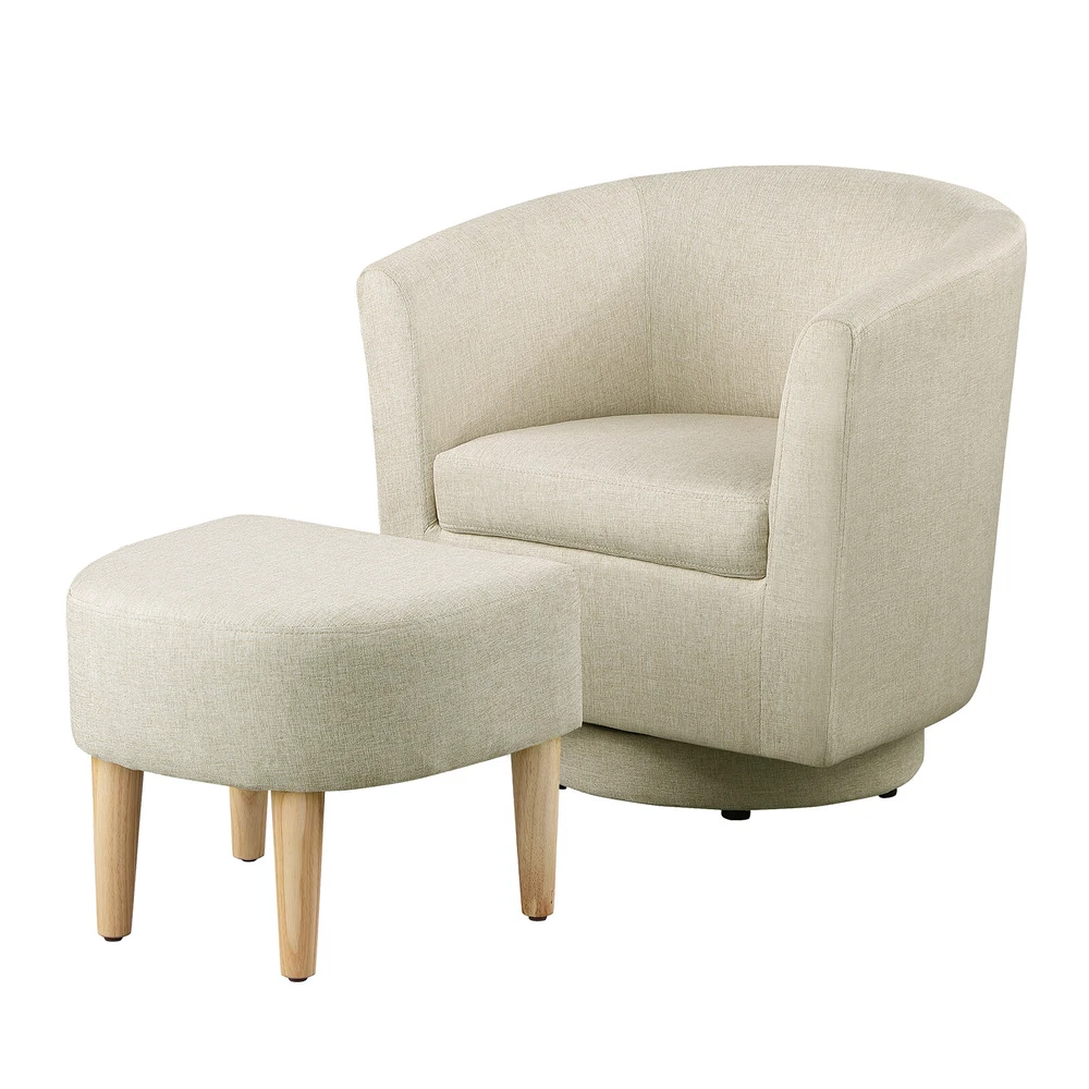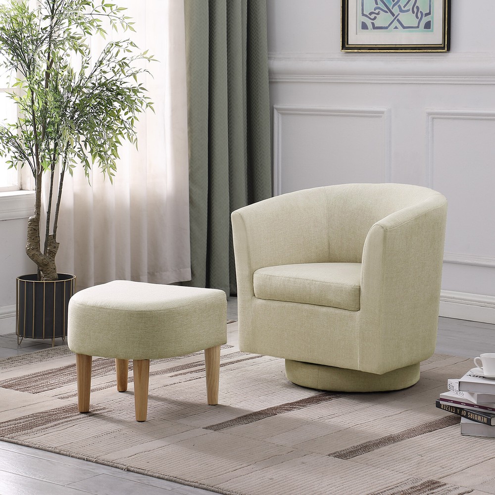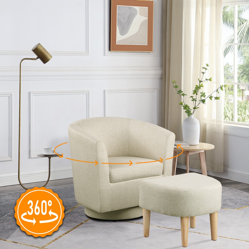 Modern Accent Swivel Armchair Fabric Single Sofa w/Ottoman Chair for Living Room Features: Comfortable Stylish Modern Swivel Accent Chairs with Ottoman: DAZONE modern comfy accent swivel chair with tub barrel style backrest makes you relieve your tiredness, makes a perfect addition to your living room, bedroom, den, recreation area, guestroom, waiting room small spaces apartment, office or studio. Sturdy Barrel Chair with Ottoman: This DAZONE accent chair for living room make of solid wood legs, soft sponge and sturdy wooden frame to ensure durability and stability of this reading chair The heavy duty 360-degree swivel base features Made of high-quality iron with steel beads accent base detail & allows great flexibility in the home. Upholstered accent swivel chair for bedroom: Ergonomically designed soft armrest, comfortable and breathable sherpa fabric of this DAZONE accent sitting chair to enjoy your comfy modern club chair style in your space and adds a touch of beauty to your home Easy to Install Living Room Chairs: It is esy to set up this small comfy corner chair within minutes. Simple assembly is required. Only need to screw the solid wood legs to DAZONE arm chair with bare hands and done Size & Load Capacity of this sherpa Chair and Ottoman Set: 26.4"(L)"*25.2"(W)*27.6"(H) ; ottoman:18.5"(L)*17"(W)*15.4"(H) ; Iron Plate Size:7.87"(L)"*7.87"(W)*0.79"(H), and weight capacity: 330 lbs. Please note it. Specification: Color: Beige Leg Material: Solid Wood Frame Material: Solid Wood Style: Curved Back Barrel Swivel Chair with Ottoman Chair with Ottoman Material: Iron + Wood + Sherpa fabric +Sponge Assembly Required: Yes(only Ottoman leg) Seat Depth:19.1" Seat Height:18" Weight: 46 lbs Curved Backrest Chair: 26.4"(L)"*25.2"(W)*27.6"(H) Ottoman: 18.5"(L)*17"(W)*15.4"(H) Iron Plate Size: 7.87"(L)"*7.87"(W)*0.79"(H) Weight capacity:330lbs Package Included 1* Swivel Accent Chair with Ottoman Set Contact us: Payment: Shipping: Warranty Return Contact us: We have always been trying to provide the best service and reliable products for every customer, however, accident may happen sometimes, please contact us to resolve any issue before leaving a negative feedback. Payment: 1. All payments must be prepaid before shipping. 2. We only accept payment via PayPal. Please kindly check if you can do the payment via PayPal before placing an order. Shipping: 1. Item will be shipped same business day if paid 4 pm EST 1 pm PDT (except weekends and holidays) and shipped from US. 2. Orders from the United States will all be shipped out via starnding shipping or economy shipping. The shipment usually takes 3-7 business days(Saturday and Sunday excluded), if you need the item urgently, please contact us for detail before purchase. Orders from overseas will be shipped via DHL Express, 3-5 business days. 3. Local pick up is not available. Warranty . The warranty shall not apply to the following circumstances: a) Damage caused by undue wear&tear, misuse, improper installation or operation, neglect, accidents. b) Damage caused by natural disasters, flood, fire, lightning or pollution. c) If item was opened, any parts removed or repaired by any unauthorized person. Return (1).We stand behind our items and offer 60 days warranty. All items are in brand new condition unless specified otherwise elsewhere in the description. (2).All returns - defective or otherwise - have to be preauthorized. Please contact us to get an authorization and returning address before sending the item back.If an item is returned because of an undeliverable shipping address, buyer agrees to pay the cost for re-shipment. (3).Please note that If the return/replacement is not a result of our mistake (not defective or wrong item), the buyer is responsible for return shipping, as well as a 20 percent restocking fee. (4).Replacement or refund will be made upon receipt of the returned item. If you do not want to wait for the replacement, you can just reorder one and then send the first one back for a refund.