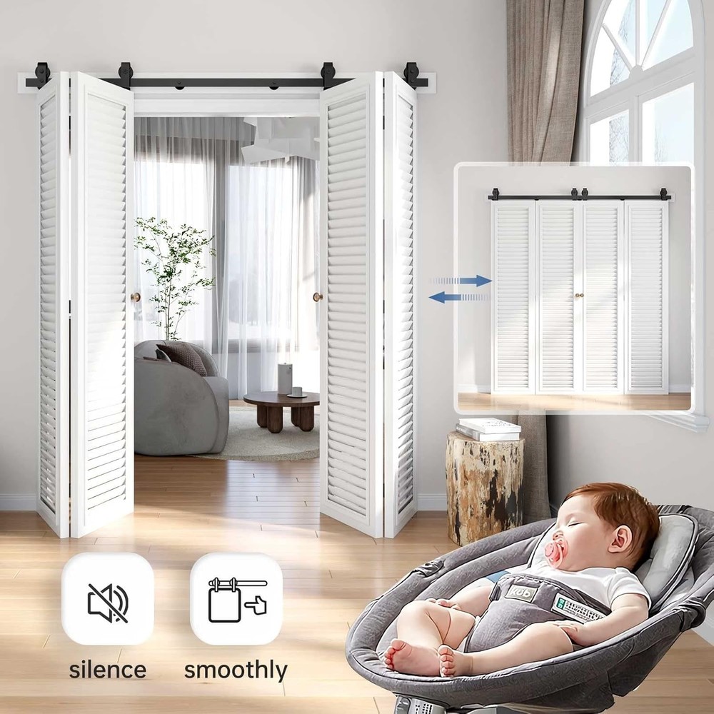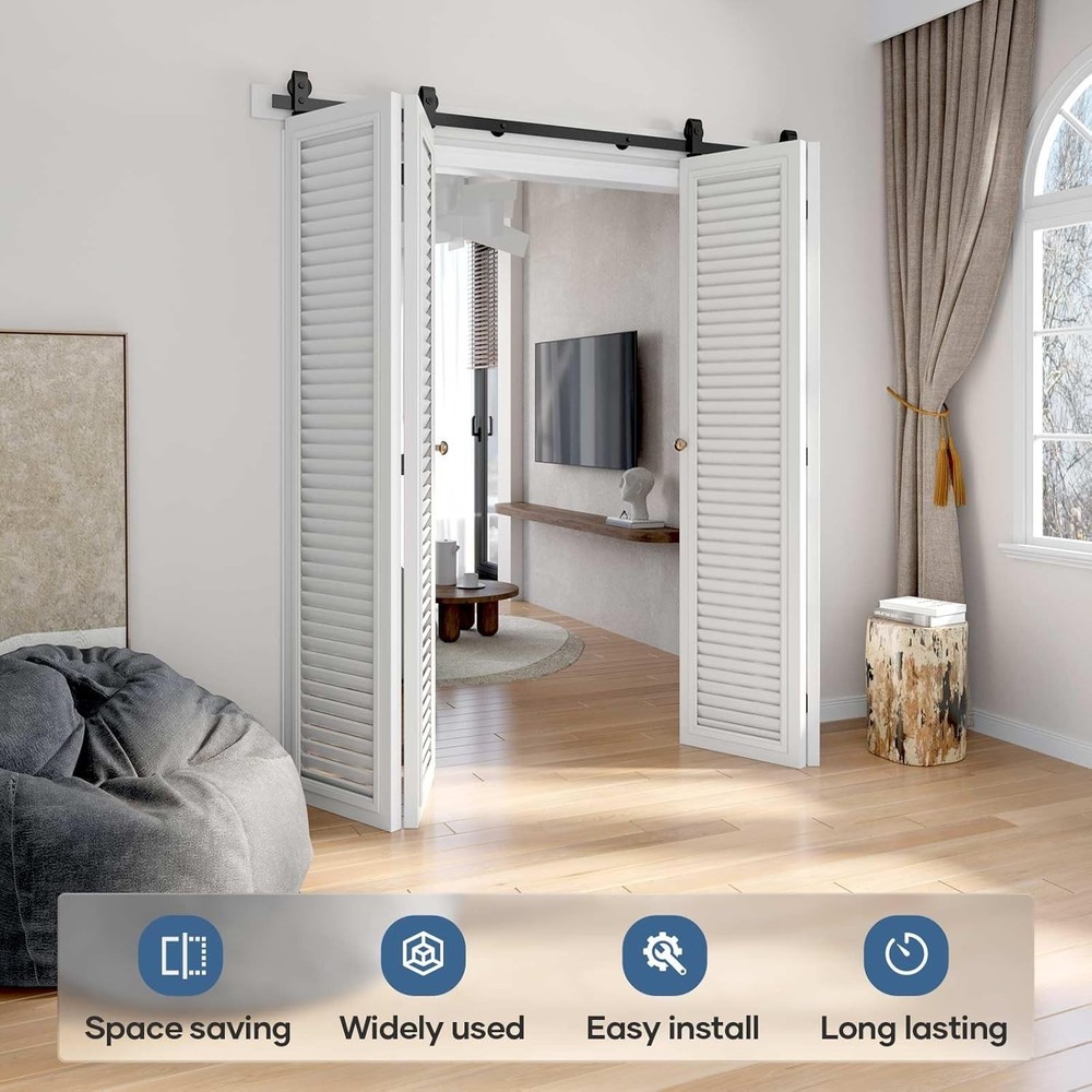 Modern Black 76" Bifold Barn Door Hardware Kit for 4 Doors ‹ › ‹ › ‹ › ‹ › ‹ › ‹ › ‹ › ‹ › ‹ › Modern Black 76" Bifold Barn Door Hardware Kit for 4 Doors Space-Saving Design Transform your living spaces with our elegant bifold barn door hardware kit. The innovative door panel folding design utilizes minimal space when opened, making it perfect for small homes, narrow hallways, or compact areas. Enjoy customizable ventilation and natural light control, whether it’s partially or fully opened. It's more flexible than traditional sliding or swing doors, ideal for balconies, wardrobes, kitchen partitions, and beyond. Smooth Gliding Operation Experience the luxury of effortless movement. Crafted from robust steel and finished with a fine black powder coat, our bifold barn door hardware resists corrosion for unmatched durability. Each high-precision bearing roller is tested for over 100,000 cycles, ensuring a buttery-smooth and silent operation, meticulously inspected for dependable use. Reminders for Installation Fits up to four 18" wide bifold doors (1"~1-3/4" thickness; 360lb weight capacity). Track length equals the door opening + 4" (100mm). Requires 5-3/8" ceiling clearance. Complete Hardware Kit This comprehensive kit includes: 2x 38" Rail 4x Rollers 4x Roller Rotating Base 2x Roller Fixator 5x Rail Support 6x Hinge 2x Floor Guide 1x Sealing Strip Note: DOOR NOT INCLUDED! Enjoy peace of mind with ’s 24/7 assistance. If you encounter any missing or defective parts, our dedicated team will provide prompt solutions. Hassle-Free Installation Worried about installation? Fear not! Our product includes a step-by-step installation manual with detailed diagrams and text instructions. You can also access a soft copy and professional installation guide through our online service. Durable & Reliable We prioritize providing quality products to elevate your home décor and functionality. Choose our Modern Bifold Barn Door Hardware Kit for a sophisticated touch that promises durability and style. Shipping Free & Fast Shipping - We offer free shipping to most of the USA with a normal delivery time of 3-10 business days. However, due to various situations, additional delivery time (up to 3 weeks) may be required for some items. Alternative Carriers - We may use alternative carriers (e.g. USPS, FedEx, UPS, etc.) to ensure your package arrives safely and on time. Due to the use of multiple carriers, we are unable to provide a tracking number automatically. Handling Time - Orders are processed and shipped within 1-5 business days of receiving cleared payment. Shipping Restrictions - Shipping to Alaska, Hawaii, Puerto Rico, Guam, and other US territories may incur shipping charges or delivery restrictions. Please contact us before ordering, or your order can be refunded/cancelled. State Restrictions - There may be restrictions based on your state of purchase. For example, certain items may not be shipped to California due to state regulations. Contact for Tracking Updates - If you require tracking updates or have any concerns about the delivery of your order, please feel free to contact us, and we will be happy to assist you. Return 30-Day Hassle-Free Returns - We want you to be completely satisfied with your purchase. If you are not, you can return the item within 30 days of receiving it for a full refund or exchange. Easy Return Process - To start a return, simply contact us and we will provide you with a prepaid return shipping label and detailed instructions. Restocking Fee - There are no restocking fees for returns. However, the buyer is responsible for return shipping costs if the return is not due to a seller's error. Refund Processing Time - Refunds will be processed within 5 business days of receiving the returned item in its condition. Payment We accept all major credit cards, PayPal, and Apple Pay for your convenience. Your payment information is secure and encrypted to ensure a safe and seamless transaction. Please complete your payment within 3 days of purchase to avoid any delays in shipping. Feedback Your feedback is extremely important to us. We strive to provide the best products and customer service possible. If you are satisfied with your purchase, please take a moment to leave us a positive review. If you have any concerns or issues with your order, please contact us before leaving negative feedback. We are committed to resolving any problems and ensuring your satisfaction. Contact Us If you have any questions or concerns, please feel free to out to our customer support team. You can contact us through the eBay messaging system. We are available Monday to Friday, 9:00 am to 5:00 pm EST, and we will do our best to respond to your inquiry within 24 hours. Buy it now and enjoy a pleasant shopping experience! Unit Quantity: 1 Suitable For: Accordion Door,Barn Door,Folding Door,Panel Door,Room/Pass Door Material: Aluminum,Steel Features: Soft Close,Smooth Operation,Corrosion Resistant,Easy Install Type: Installation Kit Color: Black Finish: Powder Coated Item Diameter: 76 in Number in Pack: 1 Item Depth: 11 in Style: Modern Item Weight: 12.52 lb