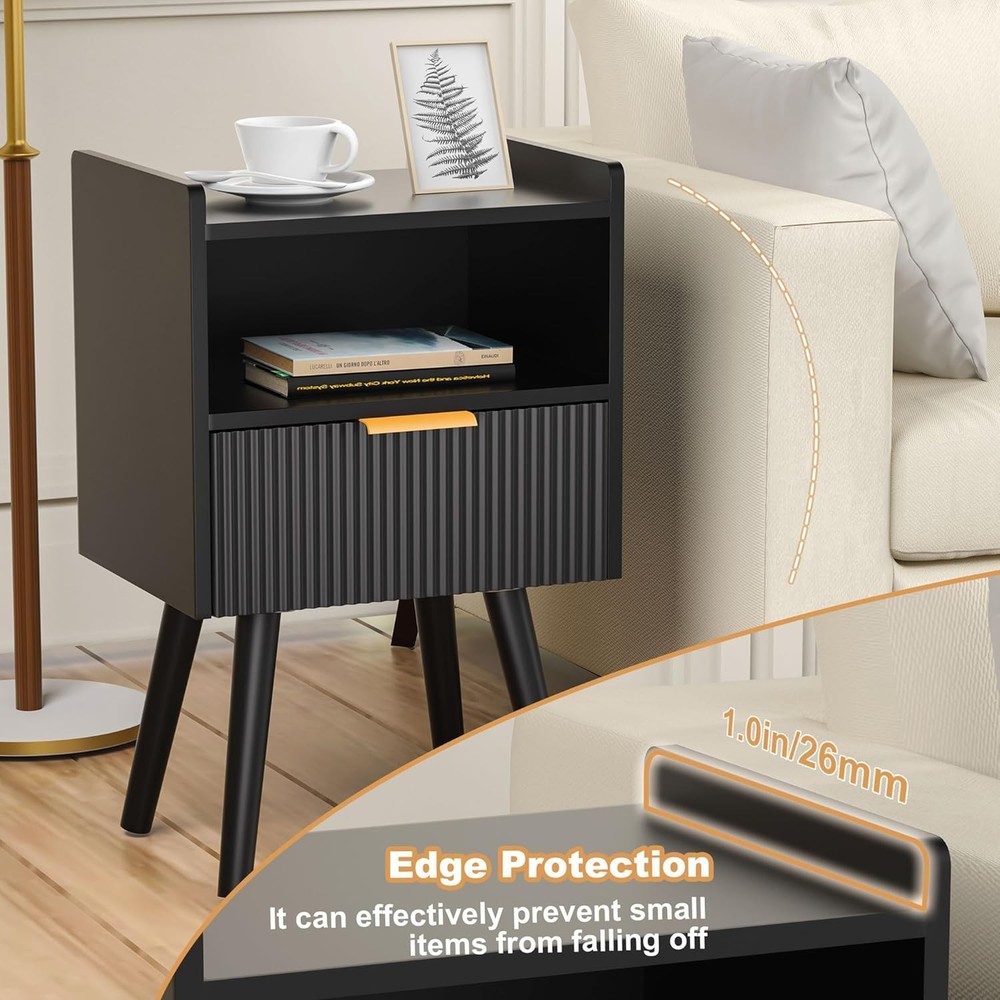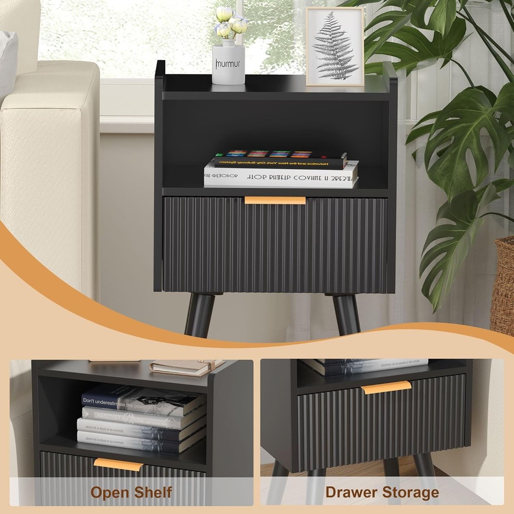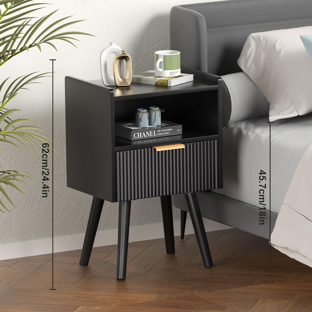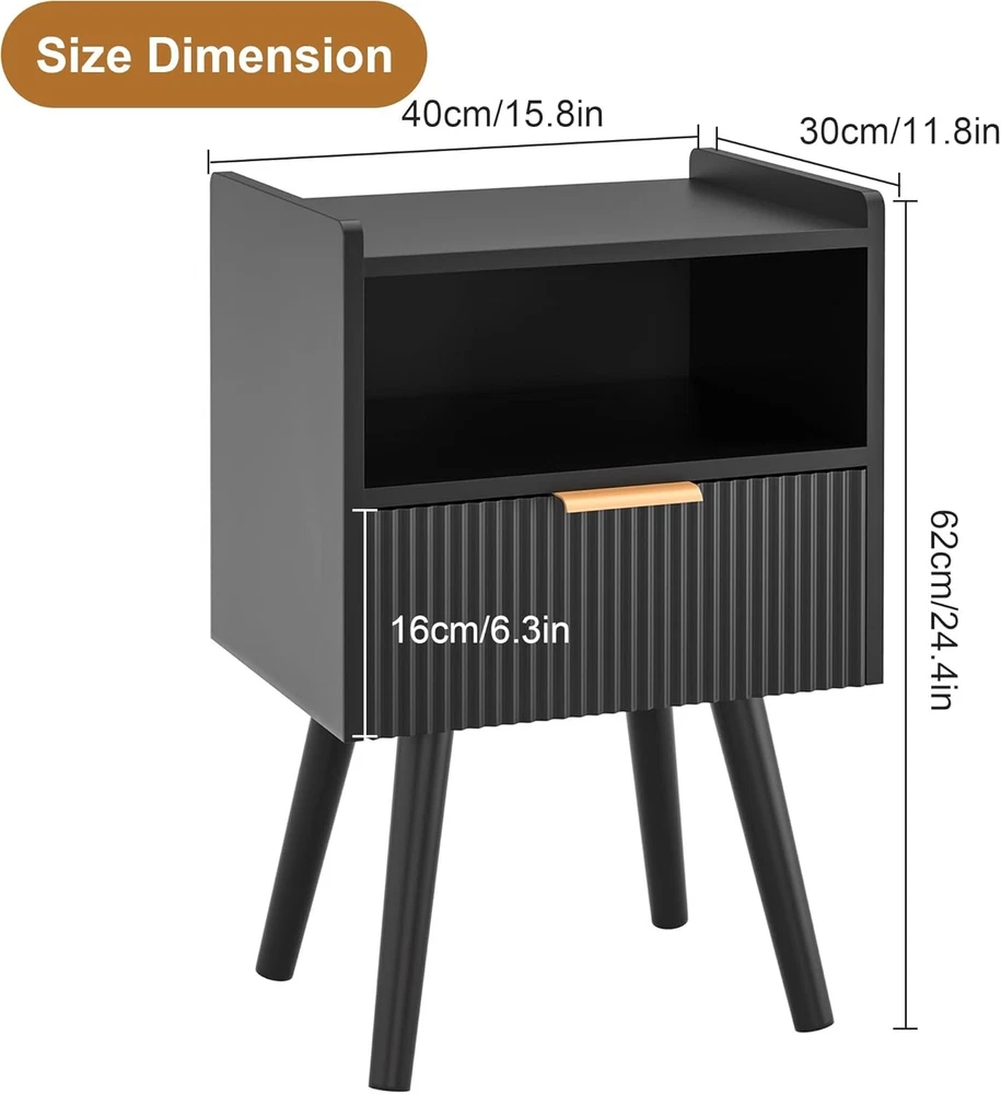 Black Nightstands, Modern Bedside Table with Drawer and Opening Product Details Brand: Homedawn Product Dimensions: 11.8"D x 15.8"W x 24.4"H Color: Black Style: Modern Base Type: Leg Item WeightFrame Material: 6.16 Poundshigh quality board Top Material TypeShape: Engineered WoodRectangular [Sleek & Practical Modern Nightstand Design] Elevate your bedroom with this stylish nightstand featuring smooth curved drawers, gold metal handles, and an easy-to-clean surface. The anti-tip design (with raised edges) keeps items secure, while the minimalist look complements any decor—perfect for holding lamps, books, phones, or bedtime essentials in bedrooms, nurseries, or living rooms 2.[Smart 2-Tier Storage Solution] Bedside table stay organized with a spacious drawer (fits journals, remotes, or chargers) and an open lower shelf (ideal for baskets, decor, or extra blankets). Maximizes small-space efficiency while reducing clutter—great for apartments, dorms, or cozy corners [Sturdy & Safe Construction] Small Side Table Built to last with high-quality engineered wood and reinforced with angled solid legs for added stability. Features non-slip rubber pads to protect floors from scratches and minimize noise when moving. No wobbling, no sliding—just reliable everyday use [Multipurpose Nightstand for Any Space] More than a nightstand! Compact size (15.8"W x 11.8"D x 24.4"H) fits snugly beside beds, sofas, or desks. Works as a bedside table, end table, snack stand, or living room accent. Pair with other Homedawn furniture for a seamless look in bedrooms, home offices, or kids’ rooms! [Quick Tool-Free Assembly] End table Includes clearly labeled parts, step-by-step instructions, and all hardware for hassle-free setup. Got questions? Our friendly U.S.-based support team is ready to help!