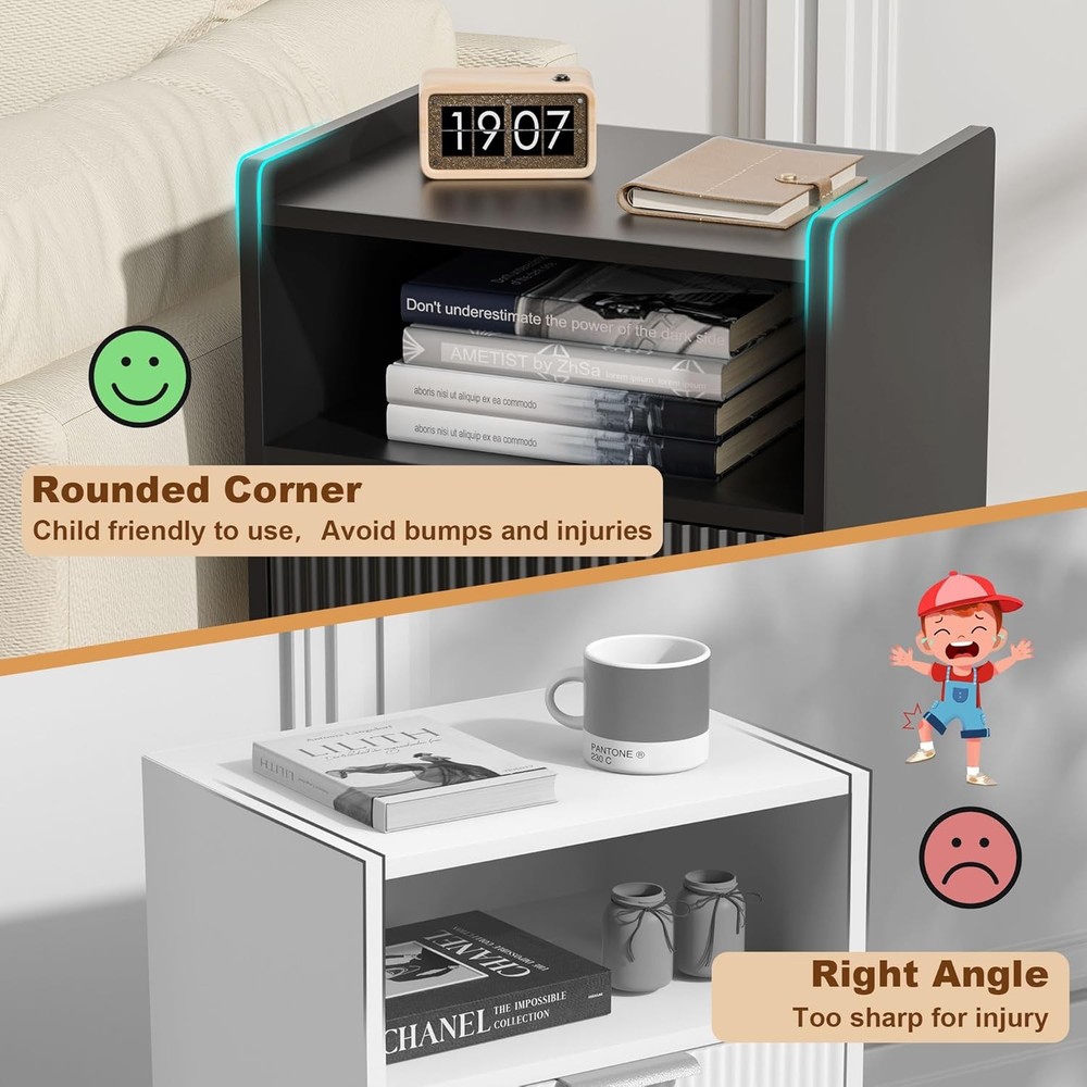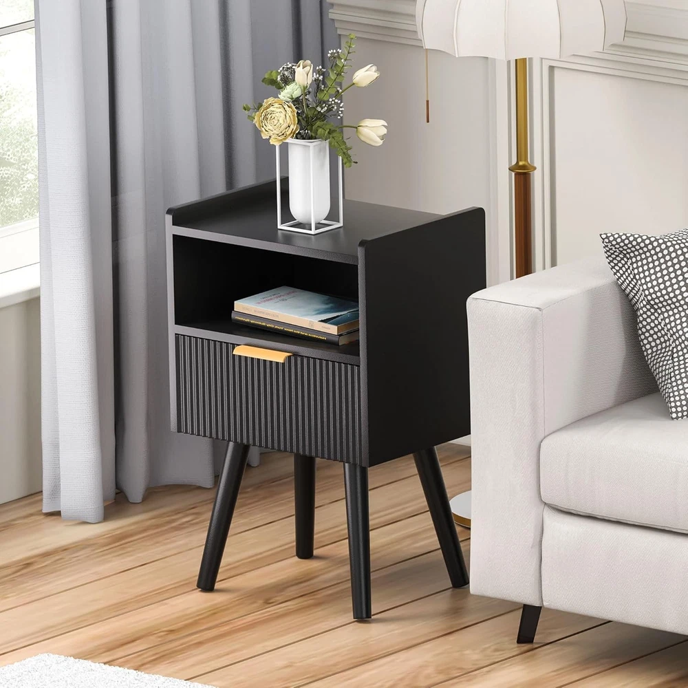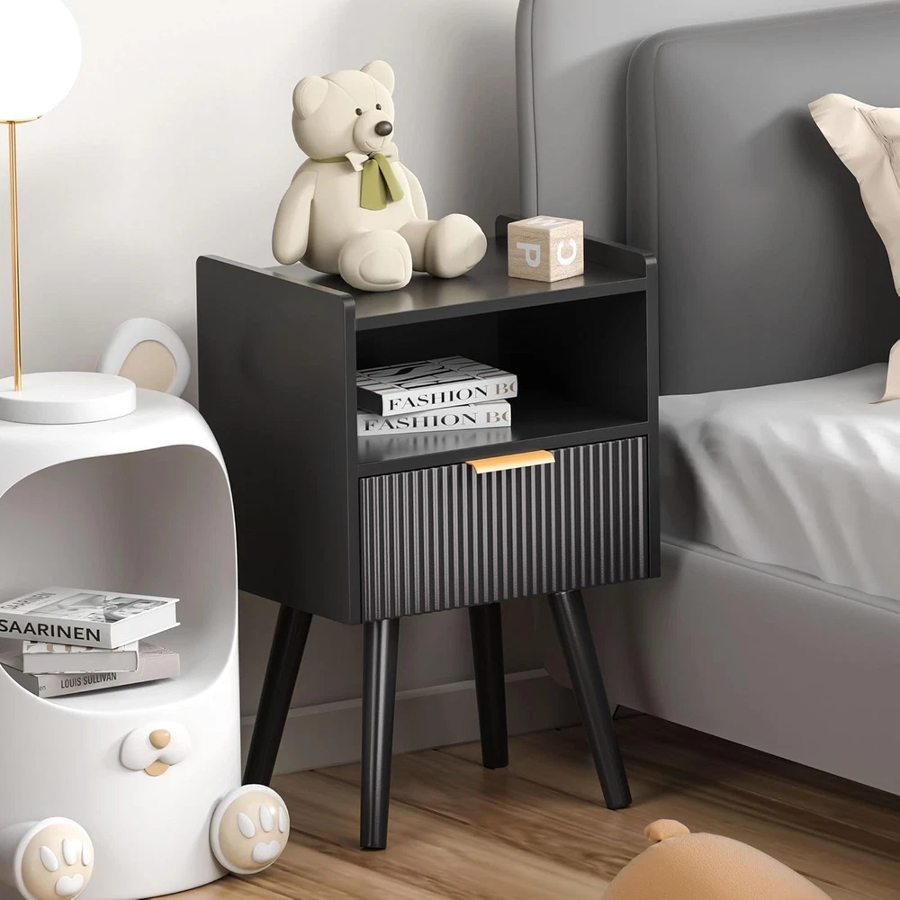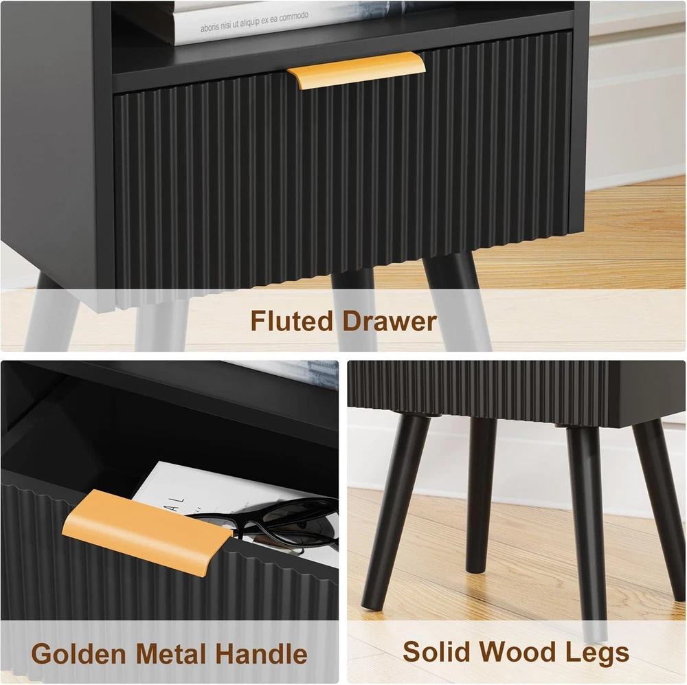 Black Nightstands, Modern Bedside Table with Drawer and Opening Product Details Brand: Homedawn Product Dimensions: 11.8"D x 15.8"W x 24.4"H Color: Black Style: Modern Base Type: Leg Item WeightFrame Material: 6.16 Poundshigh quality board Top Material TypeShape: Engineered WoodRectangular [Sleek & Practical Modern Nightstand Design] Elevate your bedroom with this stylish nightstand featuring smooth curved drawers, gold metal handles, and an easy-to-clean surface. The anti-tip design (with raised edges) keeps items secure, while the minimalist look complements any decor—perfect for holding lamps, books, phones, or bedtime essentials in bedrooms, nurseries, or living rooms 2.[Smart 2-Tier Storage Solution] Bedside table stay organized with a spacious drawer (fits journals, remotes, or chargers) and an open lower shelf (ideal for baskets, decor, or extra blankets). Maximizes small-space efficiency while reducing clutter—great for apartments, dorms, or cozy corners [Sturdy & Safe Construction] Small Side Table Built to last with high-quality engineered wood and reinforced with angled solid legs for added stability. Features non-slip rubber pads to protect floors from scratches and minimize noise when moving. No wobbling, no sliding—just reliable everyday use [Multipurpose Nightstand for Any Space] More than a nightstand! Compact size (15.8"W x 11.8"D x 24.4"H) fits snugly beside beds, sofas, or desks. Works as a bedside table, end table, snack stand, or living room accent. Pair with other Homedawn furniture for a seamless look in bedrooms, home offices, or kids’ rooms! [Quick Tool-Free Assembly] End table Includes clearly labeled parts, step-by-step instructions, and all hardware for hassle-free setup. Got questions? Our friendly U.S.-based support team is ready to help!