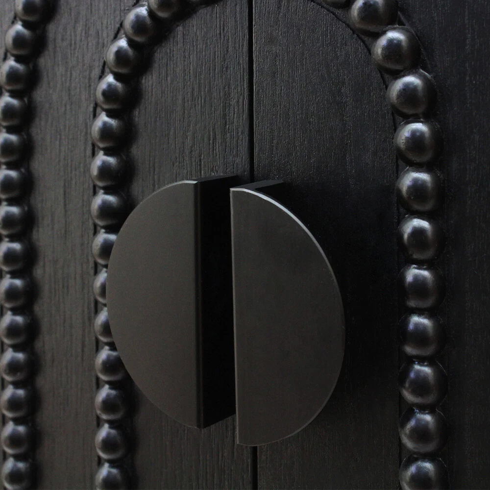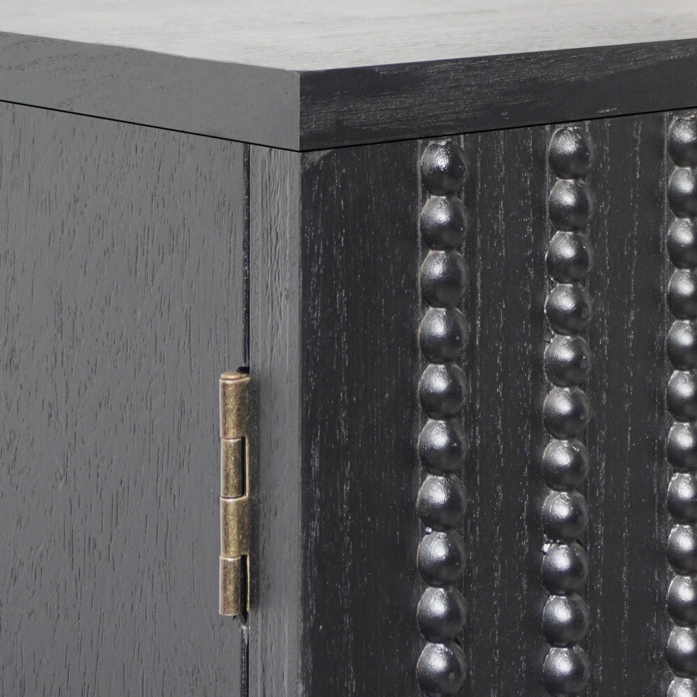Spacious Storage - Two-tier shelving with13.4in upper shelf and 12.6in lower shelf provides ample room for organizing essentials. Compact & Stylish - Measuring 30in (W) x 15in (D) x 31.7in (H), this cabinet is perfect for small spaces while offering generous storage. Decorative Embossed Design - The round wood beads on the door adds a unique, modern aesthetic. Durable & Sturdy - Crafted from high-quality manufactured wood with strong solid wood legs (5.1in height) for stability. Versatile Placement - Ideal as an accent cabinet, sideboard, nightstand, or entryway storage unit. Easy Assembly - Comes with simple instructions for hassle-free setup. Modern Black Accent Cabinet With 2 Doors Enhance your home with this stylish and functional storage cabinet. Whether used in the living room, bedroom, or hallway, it offers both beauty and practicality.