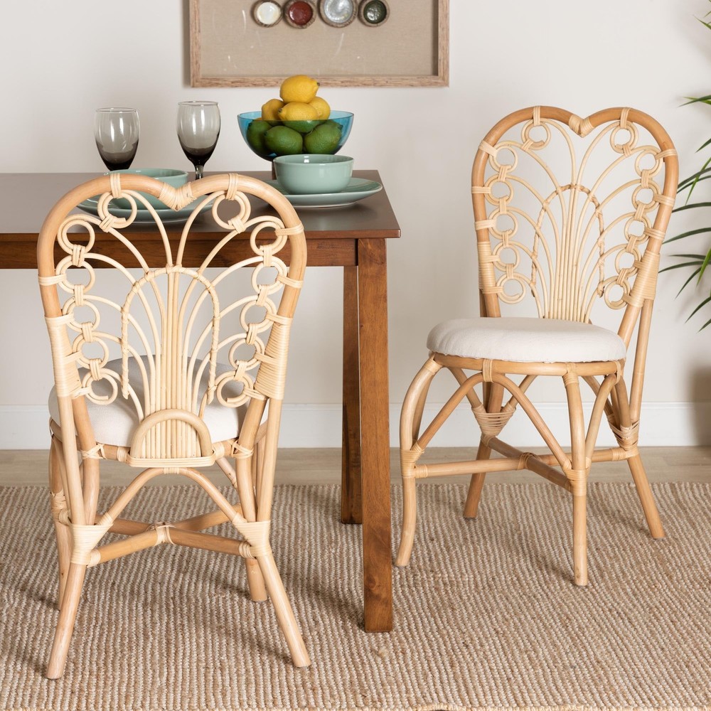 Alter the feel of any arrangement with the exotic serenity exuded by the Jerica dining chair. Made in Indonesia, this bohemian piece consists of a handcrafted rattan frame fitted with a plush foam-padded cushion upholstered in fabric. The tapered backrest creates a beautiful silhouette with curled rattan rods within the frame accentuate the smooth geometry of the piece. The Jerica will arrive fully assembled and features angled legs connected by a crisscross base for excellent stability and support in stunning design. Capturing the feel of paradise, the Jerica dining chair enlivens any occasion.Features:Bohemian dining chairMaterials: Natural Rattan, Fabric "46.5% Polyester, 43.6% Cotton, 9.9% Viscose Rayon", FoamColor(s): White, Natural BrownConstructed from natural rattanNon-removable Free Shipping Over $49.99* Details Jerica Modern Bohemian Natural Brown Rattan Dining Chair Product Description: Alter the feel of any arrangement with the exotic serenity exuded by the Jerica dining chair. Made in Indonesia, this bohemian piece consists of a handcrafted rattan frame fitted with a plush foam-padded cushion upholstered in fabric. The tapered backrest creates a beautiful silhouette with curled rattan rods within the frame accentuate the smooth geometry of the piece. The Jerica will arrive fully assembled and features angled legs connected by a crisscross base for excellent stability and support in stunning design. Capturing the feel of paradise, the Jerica dining chair enlivens any occasion. Features: Bohemian dining chair MaterialsNatural Rattan, Fabric "46.5% Polyester, 43.6% Cotton, 9.9% Viscose Rayon", Foam Color(s)White, Natural Brown Constructed from natural rattan Non-removable cushion padded with foam and upholstered in fabric Curled rattan embellishments Crisscross base IncludesOne (1) Dining Chair Care instructionWipe Clean, Spot Clean for Upholstery Dimensions: Overall18.10" w x 22.00" d x 38.60" h Seating15.70" w x 15.70" d x 19.30" h(up to seat cushion) Backrest(from seat up):19.30" h Clearance(floor to stretchers7.90" h Product weight8.8 lbs.