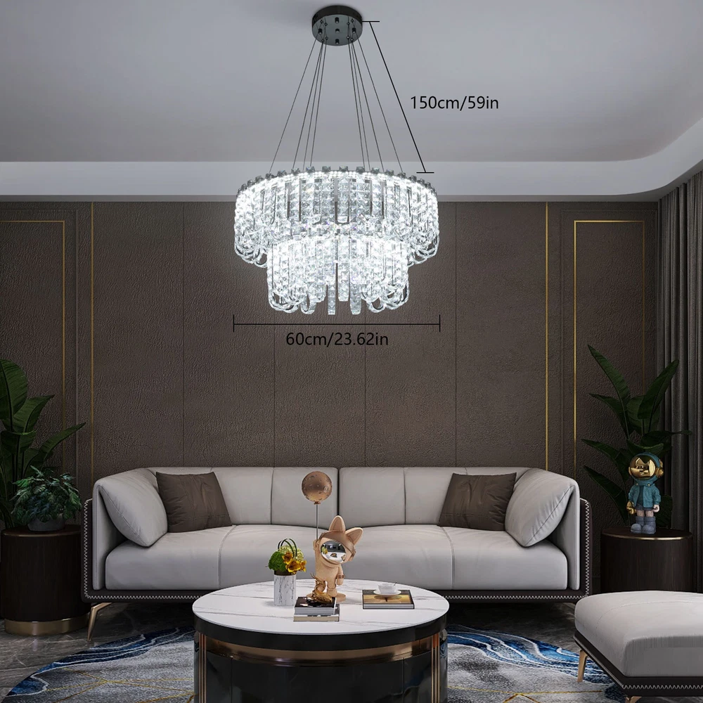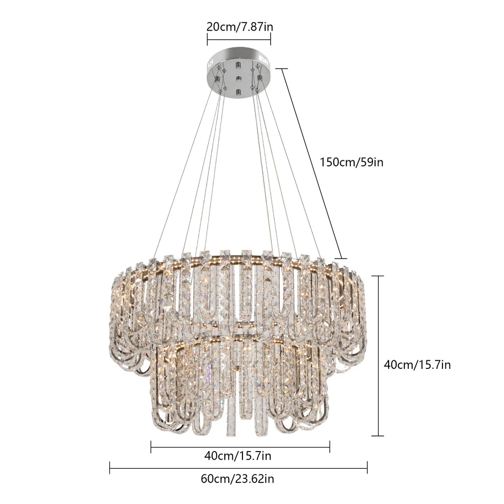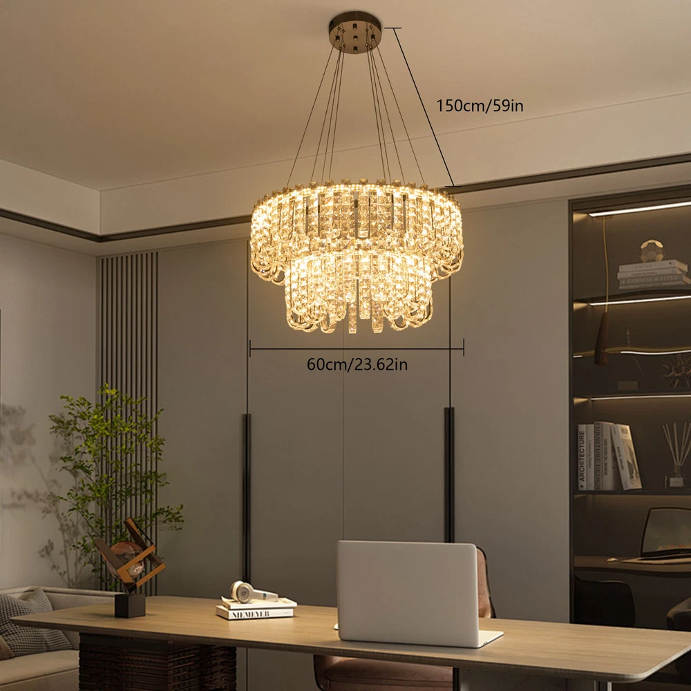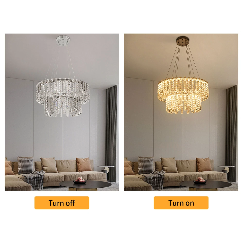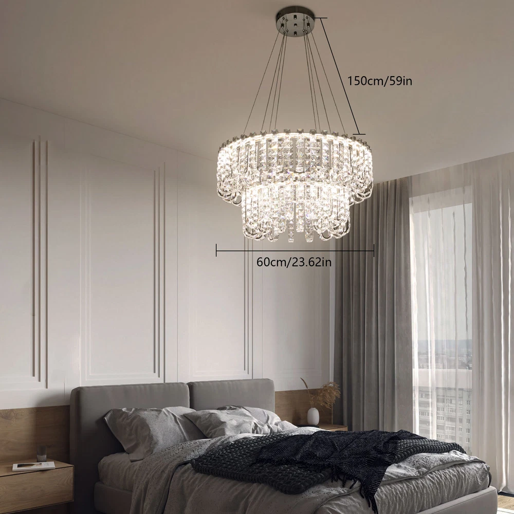 Welcome to hopefuther!!! Description Brighten up the night with a crystal chandelier. The delicate silver frame, intertwined with the bright light of the crystals, is like a beautiful painting that is mesmerizing. Its use of high-quality crystals can reflect light to almost every corner, brightening the whole room. Even in a dark environment, it can bring you endless warmth and romance. Whether at home or in public, it can bring you a wonderful visual and lighting experience. Key Features Selected Material: The product is made of high-quality crystal, stainless steel, and steel wire with the cutting process, making it bright, sturdy, anti-rust, and still beautiful and practical after long-term use. Unique Appearance: The unique crystal lampshade, the elegant silver color, and the rich hierarchical structure give the product a unique modern style. Its charming and romantic style can be matched with most of the furniture, which is a great choice for creating a home atmosphere. Excellent Light Source: The environment-friendly and energy-saving LED light with a high color index can effectively avoid glare and stroboscopic, protect your eyes, restore the most authentic color of objects, light up an area of about 107.64-215.28 ft², and save your costs. Different Light Colors: You can adjust the light colors(warm, white, and neutral) through the remote control(within 9.84-16.4ft) or wall switch(not included) to create different indoor atmospheres and meet the lighting needs for different activities. Adjustable Height: You can adjust the height of the chandelier by adjusting the length of the hanging wire(11.81-59.06 in) for different ceiling heights. Wide Voltage: This product supports a wide voltage range (90-265V) and can adapt to different voltage environments. Simple Installation: The simple structure, complete accessories, and clear installation diagram can help you complete the installation quickly and accurately. Exquisite Gift: With a beautiful appearance and practical function, it is an ideal gift for your friends and relatives on birthdays, anniversaries, festivals, housewarming, and other days. Good Customer Service: We stand behind all our guests and look forward to assisting you with your purchase. It is our pleasure to answer your confusion and questions. The end of the story between us is not "we sell and you buy". Details Solid Base: The 7.87-inch round base increases stress area, and can make the item fixed firm without falling easily. Practical Gloves: They protect your hands and the surface of the fixture during installation. Smooth Edge: The rounded and smooth edges not only add to the aesthetics of the product but also improve the safety of use. Application With a lighting area of 107.64-215.28 ft², it is ideal for kitchens, hallways, living rooms, bedrooms, balconies, bars, aisles, foyers, hotels, restaurants, corridors, cafes, dining rooms, children's rooms, libraries, billiard parlors, and other indoors. Specification Color: Silver Style: Modern Shape: Round Material: Crystal, Stainless Steel, Steel Process: Cutting Assembly Required: Yes Mounting Type: Ceiling Mount Indoor/Outdoor Usage: Indoor Efficiency: E Control Method: Remote Control, Wall Switch(Not Included) Light Color: White, Warm, Neutral Color Temperature: 3000-6500K Light Source: LED Voltage: 90-265V Power: 60W Battery Type: 2*AAA Batteries(Not Included) Remote Control Distance: 3-5m/ 9.84-16.4ft Illuminated Area: 10-20 m²/ 107.64-215.28 ft² Adjustable Height Range: 30-150cm/ 11.81-59.06 in Base Diameter: 20 cm/ 7.87 in Lampshade Diameter: 60 cm/ 23.62 in, 40 cm/ 15.74 in Lampshade Height: 40 cm/ 15.74 in Hanging Wire Length: 1.5m/ 4.92 ft Package Included 1* Crystal Chandelier 1* Remote Control 1* English Installation Diagram 2 Pairs* Gloves All Accessories for Installation Notes 1. The wall switch and remote control batteries are not included in this package. You need to prepare 2 AAA batteries yourself. 2. Please read the installation instructions completely before use. And pay particular attention to the safety instructions included. 3. Please use the lamp within the applicable voltage range and clean it regularly. Please cut off the power supply when you clean the light. Please wipe with a soft cotton cloth and do not use household cleaning agents. 4. Please check the dimensions of the product before ordering to ensure it fits your home. 5. Please make sure the power is cut off before installation. To ensure your safety, we recommend that two people install this lamp together. Please install it by someone with an electrical license if necessary. 6. Please use it in a dry environment. It is not suitable for outdoors and bathrooms. 7. Please allow the slight color difference caused by the shooting light and the 1-3 cm error due to manual measurement, and make sure you do not mind before ordering. Payment Delivery details Terms of sales About us Contact us Payment We accept ebay payment 。 Fees such as import duties, taxes are not included in the item price or shipping costs. These charges are the buyer's responsibility. Delivery details Shipping: 2-9 working days to: USA Terms of sales We maintain high standards of excellence and strive for hundred percent customer satisfaction. Feedback is very important to us. We hope that you contact us immediately before you give neutral or negative feedback, so that we can address your concerns. It is impossible to address issues if we do not know about them! About us Your satis faction is our ultimate goal. We work hard to earn your trust and future business. Our certified technicians have tested each item before shipping. The unit comes with 1 year limited warranty on all manufacturing defects. a) If you receive a defective item, you may return it or ask for a discount. Please contact us within 14 days after you receive the package. b) What you returned must be intact and in its original packaging as re? u. Customer is responsible for shipping costs of the ret